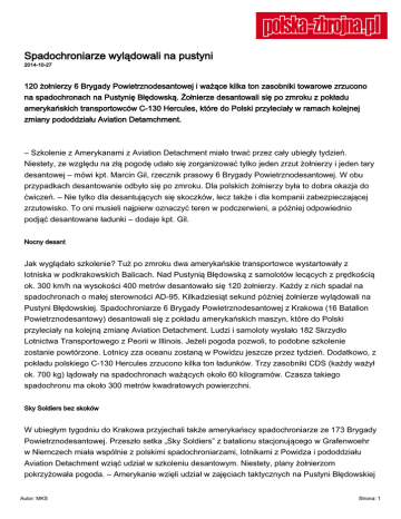 Spadochroniarze wylądowali na pustyni 2014-10-27 120 żołnierzy 6 Brygady Powietrznodesantowej i ważące kilka ton zasobniki towarowe zrzucono na spadochronach na Pustynię Błędowską. Żołnierze desantowali się po zmroku z pokładu amerykańskich transportowców C-130 Hercules, które do Polski przyleciały w ramach kolejnej zmiany pododdziału Aviation Detamchment. – Szkolenie z Amerykanami z Aviation Detachment miało trwać przez cały ubiegły tydzień. Niestety, ze względu na złą pogodę udało się zorganizować tylko jeden zrzut żołnierzy i jeden tary desantowej – mówi kpt. Marcin Gil, rzecznik prasowy 6 Brygady Powietrznodesantowej. W obu przypadkach desantowanie odbyło się po zmroku. Dla polskich żołnierzy była to dobra okazja do ćwiczeń. – Nie tylko dla desantujących się skoczków, lecz także i dla kompanii zabezpieczającej zrzutowisko. To oni musieli najpierw oznaczyć teren w podczerwieni, a później odpowiednio podjąć desantowane ładunki – dodaje kpt. Gil. Nocny desant Jak wyglądało szkolenie? Tuż po zmroku dwa amerykańskie transportowce wystartowały z lotniska w podkrakowskich Balicach. Nad Pustynią Błędowską z samolotów lecących z prędkością ok. 300 km/h na wysokości 400 metrów desantowało się 120 żołnierzy. Każdy z nich spadał na spadochronach o małej sterowności AD-95. Kilkadziesiąt sekund później żołnierze wylądowali na Pustyni Błędowskiej. Spadochroniarze 6 Brygady Powietrznodesantowej z Krakowa (16 Batalion Powietrznodesantowy) desantowali się z pokładu amerykańskich maszyn, które do Polski przyleciały na kolejną zmianę Aviation Detachment. Ludzi i samoloty wysłało 182 Skrzydło Lotnictwa Transportowego z Peorii w Illinois. Jeżeli pogoda pozwoli, to podobne szkolenie zostanie powtórzone. Lotnicy zza oceanu zostaną w Powidzu jeszcze przez tydzień. Dodatkowo, z pokładu polskiego C-130 Hercules zrzucono kilka ton ładunków. Trzy zasobniki CDS (każdy ważył ok. 700 kg) lądowały na spadochronach ważących około 60 kilogramów. Czasza takiego spadochronu ma około 300 metrów kwadratowych powierzchni. Sky Soldiers bez skoków W ubiegłym tygodniu do Krakowa przyjechali także amerykańscy spadochroniarze ze 173 Brygady Powietrznodesantowej. Przeszło setka „Sky Soldiers” z batalionu stacjonującego w Grafenwoehr w Niemczech miała wspólnie z polskimi spadochroniarzami, lotnikami z Powidza i pododdziału Aviation Detachment wziąć udział w szkoleniu desantowym. Niestety, plany żołnierzom pokrzyżowała pogoda. – Amerykanie wzięli udział w zajęciach taktycznych na Pustyni Błędowskiej Autor: MKS Strona: 1 i przeszli szkolenie naziemne przygotowujące ich do skoku. Ostatecznie desantowania nie udało się przeprowadzić – przyznaje kpt. Aleksandra Dziedzicka, z dowództwa 6 Brygady. 6 Brygada Powietrznodesantowa jest jedyną w pełni spadochronową jednostką w polskiej armii. Żołnierze tej formacji mogą działać jako desant lub prowadzić działania desantowo-szturmowe z pomocą śmigłowców. W skład 6 BPD wchodzą jednostki z Krakowa, Gliwic i Bielska-Białej. Żołnierze 6 Brygady co roku wykonują blisko 20 tysięcy skoków spadochronowych. Brygada współpracuje z różnymi jednostkami powietrznodesantowymi państw NATO. Najczęściej polscy spadochroniarze szkolą się z Amerykanami, Kanadyjczykami i Niemcami. Autor: MKS Strona: 2