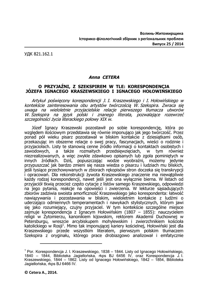 Волинь-Житомирщина Історико-філологічний збірник з регіональних проблем Випуск 25 / 2014 УДК 821.162.1 Anna CETERA O PRZYJAŹNI, Z SZEKSPIREM W TLE: KORESPONDENCJA JÓZEFA IGNACEGO KRASZEWSKIEGO I IGNACEGO HOŁOWIŃSKIEGO Artykuł poświęcony korespondencji J. I. Kraszewskiego i І. Hołowińskiego w kontekście zainteresowania obu artystów twórczością W. Szekspira. Zwraca się uwaga na wieloletnie przyjacielskie relacje pierwszego tłumacza utworów W. Szekspira na język polski i znanego literata, pozwalające rozewrzeć szczegolności życia literackiego połowy ХІХ w. Józef Ignacy Kraszewski pozostawił po sobie korespondencję, która po względem ilościowym przedstawia się równie imponująco jak jego twórczość. Przez ponad pół wieku pisarz pozostawał w bliskim kontakcie z dziesiątkami osób, przekazując im obszerne relacje o swej pracy, fascynacjach, wieści o rodzinie i przyjaciołach. Listy te stanowią cenne źródło informacji o kontaktach osobistych i zawodowych, a także rozmaitych przedsięwzięciach, w tym również niezrealizowanych, a więc zwykle zdawkowo opisanych lub zgoła pominiętych w innych źródłach. Dziś, popuszczając wodze wyobraźni, możemy jedynie przypuszczać jak bardzo zmieni się nasza wiedza o pisarzu i ludziach mu bliskich, jeśli tysiące przechowywanych w zbiorach rękopisów stron doczeka się transkrypcji i opracowań. Dla rekonstrukcji żywota Kraszewskiego znaczenie ma niewątpliwie każdy rodzaj korespondencji, nawet jeśli jest ona wyłącznie bierna. W listach od przyjaciół tkwią przecież często cytacje z listów samego Kraszewskiego, odpowiedzi na jego pytania, reakcje na opowieści i zwierzenia. W lekturze sąsiadujących zbiorów zadziwia swoista amorficzność Kraszewskiego jako korespondenta: łatwość nawiązywania i pozostawania w bliskim, wieloletnim kontakcie z ludźmi o uderzająco odmiennych temperamentach i nawykach stylistycznych, którym jawi się jako rozumiejący, czujny przyjaciel. W tym kontekście szczególne miejsce zajmuje korespondencja z Ignacym Hołowińskim (1807 – 1855): nauczycielem religii w Żytomierzu, kanonikiem kijowskim, rektorem Akademii Duchownej w Petersburgu, wreszcie arcybiskupem mohylewskim i zwierzchnikiem kościoła katolickiego w Rosji1. Mimo tak imponującej kariery kościelnej, Hołowiński jest dla Kraszewskiego przede wszystkim literatem, pierwszym polskim tłumaczem Szekspira z oryginału, którego prace drobiazgowo analizował i emfatycznie 1 Por. Korespondencja J. I. Kraszewskiego, 1838 – 1844. Listy od Ignacego Hołowińskiego, 1840 – 1844, Biblioteka Jagiellońska, rkps BJ 6456 IV, oraz Korespondencja J. I. Kraszewskiego, 1844 – 1862. Listy od Ignacego Hołowińskiego, 1842 – 1854, Biblioteka Jagiellońska, rkps BJ 6466 IV. © Cetera A., 2014. 130 Anna Cetera wychwalał, również w czasach – co znamienne – kiedy inni uznali je za całkowicie chybione. Korespondencja Kraszewskiego i Hołowińskiego rzadko bywała przedmiotem naukowego zainteresowania2. Również sam Hołowiński zdaje się dziś postacią mocno choć niezasłużenie zapomnianą3. Kilkadziesiąt listów Hołowińskiego do Kraszewskiego pochodzi z lat 1840 – 1854, przy czym w miarę upływu czasu wyraźnie zmienia się charakter korespondencji, którą inicjują listy długie, obfitujących w rozmaite zwierzenia i szczegóły, dopełniają zaś krótkie i serdeczne, pisane pospiesznie, w odpowiedzi na prośby lub pozdrowienia. Zmiana ta wynika z rozwoju kariery Hołowińskiego (którą nawiasem mówiąc Kraszewski jest nieco onieśmielony) i związanych z tym narastających obowiązków hierarchy. Ogólnie jednak zbiór ten dowodzi znajomości głębokiej i odpornej na życiowe zawirowania, choć – jak dziś skłonni bylibyśmy uznać – nieco wirtualnej. Osobiście korespondenci spotkali się tylko trzy razy: podczas słynnego zjazdu literatów w Cudnowie w 1841 r., w Kijowie w 1842 roku, kiedy Kraszewski korzystał z gościny Hołowińskiego, oraz w 1846 r. w Gródku, gdzie z kolei Kraszewscy przyjmowali Hołowińskiego. Bezpośrednim powodem nawiązania znajomości była publikacja przez Kraszewskiego w styczniu 1840 roku przychylnej recenzji pierwszego tomu przekładów Szekspira z oryginału, jakie Hołowiński wydał pod koniec 1839 roku w Wilnie4. Podobnie jak Michał Grabowski, Kraszewski już wcześniej pisywał o dramatach Szekspira i w pewnym stopniu torował drogę pierwszym przekładom5, z 2 Fragmenty listów z 1840 i 1841 roku omawia Budrewicz-Beratan A. Dwugłos o Szekspirze: Józef Ignacy Kraszewski i Ignacy Hołowiński // Halina Bursztyńska (red.), Od strony Kresów. Studia i szkice. Część trzecia. – Kraków, 2005. – S. 53–61; Szersze omówienie korespondencji w latach 1840 – 1854 zamieściłam w monografii: Cetera A. Smak morwy. U źródeł recepcji przekładów Szekspira w Polsce. – Warszawa, 2009. Wiele uwag zawartych w niniejszym artykule, w powiązaniu ze stosownymi cytacjami, reasumuje wyniki badań opisanych w tej monografii. 3 W ostatnich latach, oprócz pozycji wymienionych wyżej, ukazały się nieliczne artykuły, pisane z bardzo odmiennych perspektyw badawczych: Doktór R. Ignacy Hołowiński – arcybiskup i pisarz romantyczny // Wobec romantyzmu. Studia i szkice ofiarowane Profesor Danucie Zamącińskiej-Paluchowskiej / Роd red. M. Łukaszczuk, M. Maciejewskiego. – Lublin, 2006. – S. 337–247; Komorowski J. Polskie szekspiriana. 2. Shakespeare księdza Kefalińskiego // Pamiętnik Teatralny. – 1991. – z. 1.; Budrewicz-Beratan A. Gdy arcybiskup przekłada dramat świecki... Ksiądz Ignacy Hołowiński wobec Szekspira // P. Fast (red.), Socjologiczne konteksty przekładu. – Katowice, 2004. – s. 101–118.; a także szkic Beaty Pokorskiej, Pokorskа В. Ignacy Hołowiński – Biografia utraty // Akant, 2005. – № 3(94). Pośród polskich Wallenrod