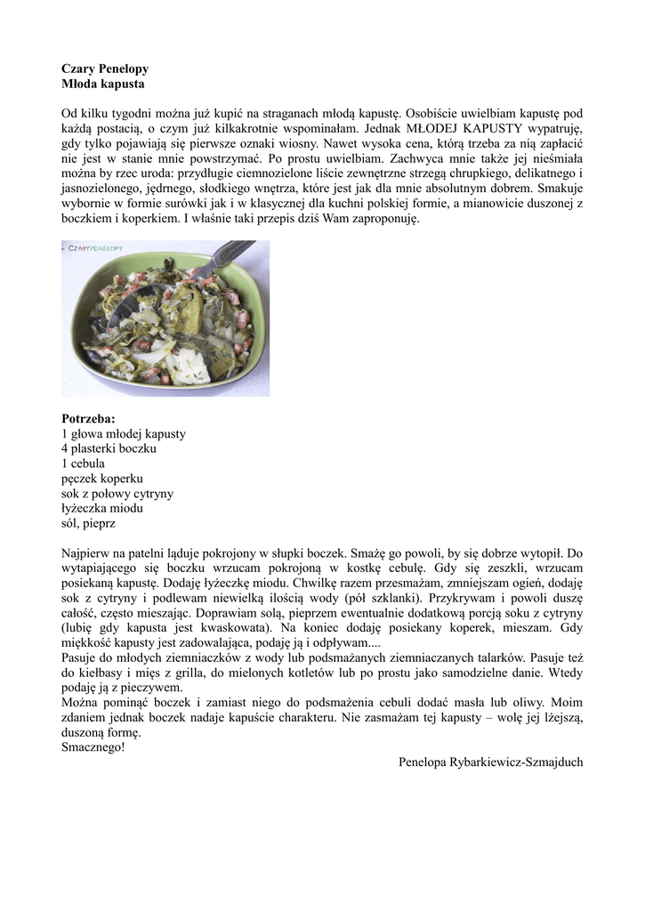 Czary Penelopy Młoda kapusta Od kilku tygodni można już kupić na straganach młodą kapustę. Osobiście uwielbiam kapustę pod każdą postacią, o czym już kilkakrotnie wspominałam. Jednak MŁODEJ KAPUSTY wypatruję, gdy tylko pojawiają się pierwsze oznaki wiosny. Nawet wysoka cena, którą trzeba za nią zapłacić nie jest w stanie mnie powstrzymać. Po prostu uwielbiam. Zachwyca mnie także jej nieśmiała można by rzec uroda: przydługie ciemnozielone liście zewnętrzne strzegą chrupkiego, delikatnego i jasnozielonego, jędrnego, słodkiego wnętrza, które jest jak dla mnie absolutnym dobrem. Smakuje wybornie w formie surówki jak i w klasycznej dla kuchni polskiej formie, a mianowicie duszonej z boczkiem i koperkiem. I właśnie taki przepis dziś Wam zaproponuję. Potrzeba: 1 głowa młodej kapusty 4 plasterki boczku 1 cebula pęczek koperku sok z połowy cytryny łyżeczka miodu sól, pieprz Najpierw na patelni ląduje pokrojony w słupki boczek. Smażę go powoli, by się dobrze wytopił. Do wytapiającego się boczku wrzucam pokrojoną w kostkę cebulę. Gdy się zeszkli, wrzucam posiekaną kapustę. Dodaję łyżeczkę miodu. Chwilkę razem przesmażam, zmniejszam ogień, dodaję sok z cytryny i podlewam niewielką ilością wody (pół szklanki). Przykrywam i powoli duszę całość, często mieszając. Doprawiam solą, pieprzem ewentualnie dodatkową porcją soku z cytryny (lubię gdy kapusta jest kwaskowata). Na koniec dodaję posiekany koperek, mieszam. Gdy miękkość kapusty jest zadowalająca, podaję ją i odpływam.... Pasuje do młodych ziemniaczków z wody lub podsmażanych ziemniaczanych talarków. Pasuje też do kiełbasy i mięs z grilla, do mielonych kotletów lub po prostu jako samodzielne danie. Wtedy podaję ją z pieczywem. Można pominąć boczek i zamiast niego do podsmażenia cebuli dodać masła lub oliwy. Moim zdaniem jednak boczek nadaje kapuście charakteru. Nie zasmażam tej kapusty – wolę jej lżejszą, duszoną formę. Smacznego! Penelopa Rybarkiewicz-Szmajduch