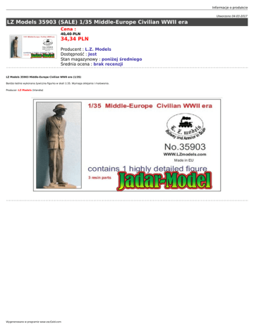 Informacje o produkcie Utworzono 04-03-2017 LZ Models 35903 (SALE) 1/35 Middle-Europe Civilian WWII era Cena : 40,40 PLN 34,34 PLN Producent : L.Z. Models Dostępność : Jest Stan magazynowy : poniżej średniego Średnia ocena : brak recenzji LZ Models 35903 Middle-Europe Civilian WWII era (1/35) Bardzo ładnie wykonana żywiczna figurka w skali 1:35. Wymaga sklejania i malowania. Producer: LZ Models (Irlandia) Wygenerowano w programie www.oscGold.com