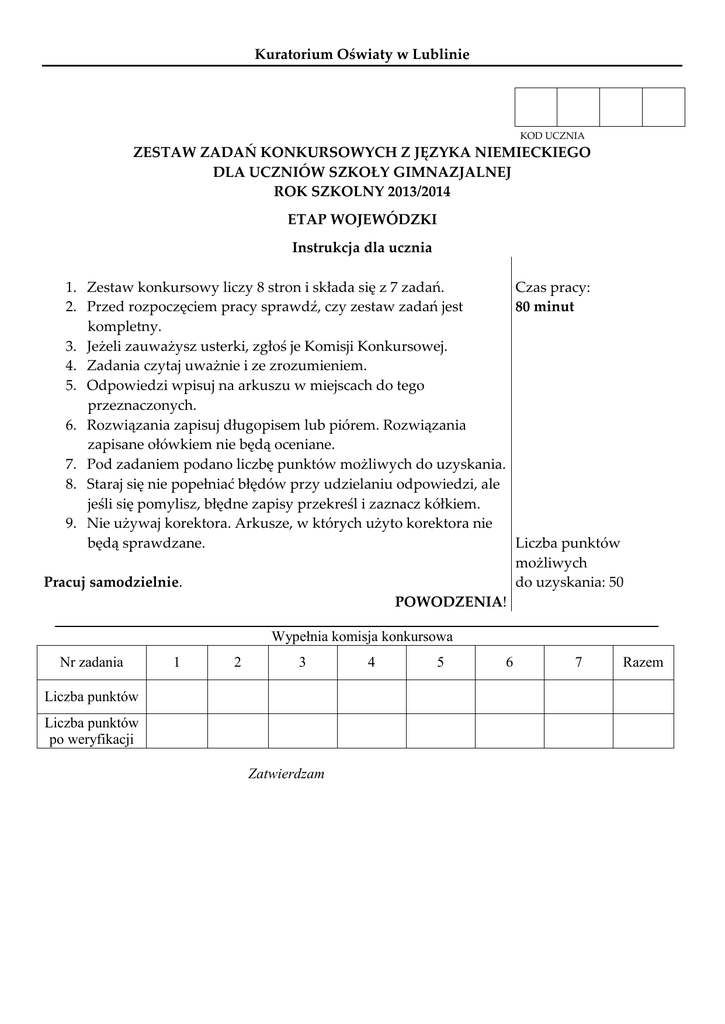 Kuratorium Oświaty w Lublinie KOD UCZNIA ZESTAW ZADAŃ KONKURSOWYCH Z JĘZYKA NIEMIECKIEGO DLA UCZNIÓW SZKOŁY GIMNAZJALNEJ ROK SZKOLNY 2013/2014 ETAP WOJEWÓDZKI Instrukcja dla ucznia 1. Zestaw konkursowy liczy 8 stron i składa się z 7 zadań. Czas pracy: 80 minut 2. Przed rozpoczęciem pracy sprawdź, czy zestaw zadań jest kompletny. 3. Jeżeli zauważysz usterki, zgłoś je Komisji Konkursowej. 4. Zadania czytaj uważnie i ze zrozumieniem. 5. Odpowiedzi wpisuj na arkuszu w miejscach do tego przeznaczonych. 6. Rozwiązania zapisuj długopisem lub piórem. Rozwiązania zapisane ołówkiem nie będą oceniane. 7. Pod zadaniem podano liczbę punktów możliwych do uzyskania. 8. Staraj się nie popełniać błędów przy udzielaniu odpowiedzi, ale jeśli się pomylisz, błędne zapisy przekreśl i zaznacz kółkiem. 9. Nie używaj korektora. Arkusze, w których użyto korektora nie będą sprawdzane. Liczba punktów możliwych Pracuj samodzielnie. do uzyskania: 50 POWODZENIA! Wypełnia komisja konkursowa Nr zadania 1 2 3 Liczba punktów Liczba punktów po weryfikacji Zatwierdzam 4 5 6 7 Razem Rozumienie tekstu słuchanego. I. Przeczytaj polecenie a następnie posłuchaj uważnie nagrania i wpisz brakujące informacje. Za każdą poprawną odpowiedź otrzymasz 1 punkt. Auf dem Markt Die Frau kauft ___________ (1) Äpfel, und ____________ (2) Bananen. Sie bezahlt zusammen ______________. (3) 1. 2. 3. _____ Pkt. (3 x 1 = 3 Pkt.) II. Przeczytaj polecenie a następnie posłuchaj uważnie nagrania i w tabeli zaznacz znakiem X, właściwą informację. Za każdą poprawną odpowiedź otrzymasz 1 punkt. Auto, Bahn oder Flugzeug? Welches Verkehrsmittel mag die Person? 1 Andreas Prange 2 Nina Gehrke 3 Udo Michelsen 4 Helga 5 Helmut Was trinkt der Mann? 6 Welche Hose gefällt dem Mann? die blaue Hose die grüne Hose die schwarze Hose die braune Hose 7 1. 2. 3. 4. 5. 6. 7. ________ Pkt. (7x1 = 7 Pkt.) 2 Rozumienie tekstu czytanego III. Przeczytaj uważnie podany poniżej tekst, a następnie zaznacz znakiem X, która odpowiedź (a, b, c czy d) jest zgodna z tekstem. Za każdą poprawną odpowiedź otrzymasz 1 punkt. Fußballweltmeisterschat - Erfolge der Deutschen. (Aus der Chronik der Fußballweltmeisterschaft) 13.07.1930: In Montevideo (Uruguay) beginnt die erste Fußballweltmeisterschaft, an der dreizehn Fußballnationalteams teilnehmen. Das erste Tor der WM-Geschichte schießt der Franzose Lucien Laurent (1907-2005) während des Eröffnungsspiels zwischen Frankreich gegen Mexiko am13. Juli 1930. Das Endspiel findet am 30. Juli zwischen Argentinien und Uruguay statt. Uruguay gewinnt 4:2. 27. Mai 1934: In Italien beginnt die zweite Fußballweltmeisterschaft. Daran nehmen zum ersten Mal zwei faschistische Staaten teil: Italien und Drittes Reich. Italien gewinnt seinen ersten Weltmeistertitel. Die deutsche Fußballnationalmannschaft hat ihre Bronze. 04.07.1954: In der Schweiz siegt die Mannschaft der Bundesrepublik Deutschland 3:2 über den Favoriten Ungarn. Das bedeutsame Ereignis geht als »Wunder von Bern« in die Fußballgeschichte ein. Trainer der deutschen Nationalmannschaft ist Sepp Herberger (1897-1977), Torschützer sind Helmut Rahn (19292003) und Max Morlock (1925-1994). 30.07.1966: Die VIII. Fußballweltmeisterschaft findet vom 11.bis zum 30. Juli 1966 in England statt. Zu den Spielern gehören u.a. Franz Beckenbauer (Deutschland), Pelé (Brasilien), Uwe Seeler (Deutschland), Eusebio (Portugal) und Florian Albert (Ungarn). England wird Fußballweltmeister durch einen 4:2 Sieg (nach Verlängerung) gegen Deutschland. Die Mannschaft der Bundesrepublik Deutschland gewinnt die Silbermedaille. 17.06.1970: Im Halbfinalspiel der Fußballweltmeisterschaft 1970 in Mexiko siegt Italien 4:3 über Deutschland. Deutschland gewinnt Bronze. Wegen seiner Dramatik geht dieses Spiel als »Jahrhundertspiel« in die Sportgeschichte ein. 07.07.1974: Deutschland gewinnt in München mit einem 2:1 gegen die Niederlanden die Fußballweltmeisterschaft. Dies ist der zweite WM-Titel nach 1954. Der Kapitän der deutschen Mannschaft ist Franz Beckenbauer (*1945), In dieser Mannschaft spielen u.a.: Uli Hoeneß (*1952), Paul Breitner (*1951), Gerd Müller (*1945), Berti Vogts (*1946) und Torwart Sepp Maier (*1944), Trainer (1964-1978) ist Helmut Schön (1915-1996). 13. Juni 1982 Zum ersten Mal in Spanien beginnt die zwölfte Fußballweltmeisterschaft. Italien besiegt Deutschland in der Finale 3:1. 29.06.1986: In Mexiko schlägt während der XIII. Fußballweltmeisterschaft die Mannschaft aus Argentinien die deutsche Elf 3:2. Argentinien ist zum zweiten Mal nach 1978 Fußballweltmeister. Der Star der Spiele ist der Kapitän der Argentinier, Diego Armando Maradona (*1960). Im Endspiel dominieren José Luis Brown, Jorge Valdano und Jorge Burruchaga auf der einen, sowie Lothar Matthäus, Karl-Heinz Rummenigge und Rudi Völler auf der anderen Seite. 08.07.1990: Deutschland wird durch ein 1:0 gegen Argentinien in Rom zum dritten Mal FußballWeltmeister. Der Teamchef der deutschen Elf ist Franz Beckenbauer (*1945). Die XIV. FußballWeltmeisterschaft findet vom 8. Juni bis zum 8. Juli 1990 in Italien statt. 31. Mai 2002: Die XVII. Fußballweltmeisterschaft beginnt in Japan und in Südkorea. Der Sieger ist das Team Brasiliens, den zweiten Platz belegt Deutschland und den dritten die Türkei. 09.06.2006: Unter dem Motto »Die Welt zu Gast bei Freunden« (»A time to make friends«) findet in Deutschland vom 9. Juni bis zum 9. Juli 2006 die XVIII. Fußball-Weltmeisterschaft statt. Deutschland erreicht den 3. Platz. Italien siegt im Endspiel 6:4 (nach Elfmeterschießen) gegen Frankreich und wird Fußball-Weltmeister. 11. Juni 2010 beginnt in Südafrika die XIX. Fußballweltmeisterschaft. Der Gewinner der Fußball-Weltmeisterschaft 2010 ist Spanien. Der Vizeweltmeister sind die Niederlanden, den dritten Platz erreicht Deutschland. Die nächste Weltmeisterschaft findet vom 12. Juni bis zum 13. Juli 2014 in Brasilien statt. Nach: http