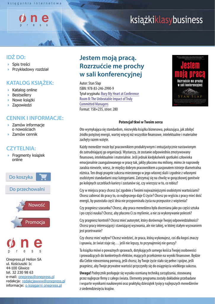 IDŹ DO: Spis treści Przykładowy rozdział KATALOG KSIĄŻEK: Katalog online Bestsellery Nowe książki Zapowiedzi CENNIK I INFORMACJE: Zamów informacje o nowościach Zamów cennik CZYTELNIA: Fragmenty książek online Do koszyka Do przechowalni Nowość Promocja Jestem moją pracą. Rozrzućcie me prochy w sali konferencyjnej Autor: Stan Slap ISBN: 978-83-246-2990-9 Tytuł oryginału: Bury My Heart at Conference Room B: The Unbeatable Impact of Truly Committed Managers Format: 158×235, stron: 280 Potencjał tkwi w Twoim sercu Oto wymykająca się standardom, niezwykła książka biznesowa, pokazująca, jak zdobyć źródło potężnej energii, wartej więcej niż wszystkie finansowe, intelektualne i materialne zachęty razem wzięte. Każdy menedżer może być pracownikiem produktywnym i entuzjastycznie nastawionym do zatrudniającej go organizacji. Wystarczy, że zostanie odpowiednio zmotywowany finansowo, intelektualnie i materialnie. Jeśli jednak kiedykolwiek spotkałeś człowieka emocjonalnie zaangażowanego w pracę tak, jakby płacono mu miliony, mimo że naprawdę zarabia niewiele, wiesz, że między dobrym pracownikiem a pasjonatem istnieje diametralna różnica. Ten drugi pragnie sukcesu mierzonego w jego własnej skali i zgodnie z własnymi osobistymi standardami oraz kategoriami. Zatrzymaj się na chwilę w gorączkowej gonitwie po kolejnych szczeblach kariery i zastanów się, czy wierzysz w to, co robisz? Czy w miejscu pracy chcesz żyć zgodnie z Twoimi najważniejszymi osobistymi wartościami? Chcesz zabierać do pracy to, co najlepszego daje Ci życie? Chcesz po wyjściu z pracy mieć dość energii, by pozostała część dnia nie przypominała życia na przepustce z więzienia? Czy pragniesz szacunku? Chcesz, aby praca menedżera była doceniana jako po części sztuka i po części nauka? Chcesz, aby płacono Ci za myślenie, a nie za wykonywanie poleceń? Czy pragniesz kontroli? Chcesz mieć autorytet, który dorównuje Twojej odpowiedzialności? Chcesz pracy interesującej i stawiającej wyzwania, ale nie takiej, w której stałym wyzwaniem jest przetrwanie? Czy chcesz mieć wpływ? Chcesz wiedzieć, że praca, którą wykonujesz, coś dla kogoś znaczy i sprawia, że świat staje się… jeśli nie lepszy, to przynajmniej nie gorszy? Onepress.pl Helion SA ul. Kościuszki 1c 44-100 Gliwice tel. 32 230 98 63 e-mail: [email protected] redakcja: [email protected] informacje: o księgarni onepress.pl Ta książka mówi o poważnych sprawach, dotykających samego kośćca Twojej osobowości i prowadzących do konkretnych efektów, mających przełożenie na wyniki finansowe. Będzie dla Ciebie nieocenioną pomocą, jeśli chcesz, by Twoje życie stało się pełne i spójne, jeśli pragniesz, aby Twoje prywatne wartości przyczyniły się do osiągnięcia wielkiego sukcesu. Uwaga! Podręcznik posługuje się wysoko ocenianą techniką zarządzania, stosowaną przez najlepsze firmy z całego świata. Elementy programu zostały dokładnie przebadane i wsparte wynikami naukowymi oraz praktyką dziesiątek tysięcy najlepszych menedżerów z siedemdziesięciu krajów. SPIS TRECI MARZENIE MENEDERA 13 O tym, czego najbardziej pragn menederowie w relacjach ze swoimi firmami. WPROWADZENIE 15 Spenieni menederowie opowiadaj o tym, jak udao im si osign jeszcze wikszy sukces dziki fuzji jani i wiatów. CZ I POTRZEBNA JEST WARTOCIOWA OFERTA 1. SKRYWANA PRAWDA 25 Wprowadzenie do najbardziej wartociowej i jednoczenie najtrudniejszej do osignicia formy zaangaowania menederskiego. 2. TAJEMNICZY CEL 33 O tym, jak ta ksika pomoe Ci by lepszym czonkiem zarzdu, menederem i czowiekiem. 3. DLA ADNEGO MENEDERA CZAS NIE STOI W MIEJSCU 41 Wykonaj niezbdne obliczenia matematyczne, zanim sam staniesz si ofiar matematyki i czasu. SPIS TRECI 9 CZ II PORTFEL, SERCE, KLUCZE 4. MARZENIE FIRMY 45 To, czego firmy chc od swoich menederów. 5. OPOWIE O DWÓCH FIRMACH… 47 Tam, gdzie dzieje si to, co dziwne i wspaniae. 6. O TYM, CO SPRAWIA, E MARZENIE NIE STAJE SI RZECZYWISTOCI 65 Dlaczego firmy nie otrzymuj od swoich menederów tego, czego chc? 7. JAK DZIAA MÓZG MENEDERA? I DLACZEGO NIE DZIAA? 71 Dlaczego wiksza cz teorii logiki korporacyjnej w realnym wiecie menedera staje si zupenie nielogiczna? 8. USZCZYPNIJ MNIE, BO CHYBA NI… 77 Zderzenie marze: brak ofiar. CZ III MUSISZ. MOESZ 9. JAK SI DOWIEDZIE, CO NAPRAWD SI DLA CIEBIE LICZY 87 Dlaczego to trudniejsze, ni si wydaje? Jak moesz uatwi sobie zadanie? 10. JAK SPRZEDA IDE WARTOCI SAMEMU SOBIE? 117 Dziesi powodów, które zwykle powstrzymuj menederów od dziaania. I o tym, dlaczego Ciebie nie powstrzymaj. 11. JAK SPRZEDA TO TWOIM LUDZIOM? 139 Jak przemieni to, co dla Ciebie najwaniejsze, w wartociowy cel wszystkich pracowników? 12. JAK SPRZEDA T IDE W SWOJEJ FIRMIE? 169 Jak przemieni to, co dla Ciebie najwaniejsze, we wpywy biznesowe oraz sukces zawodowy? 10 SPIS TRECI CZ IV DO ROBOTY! 13. IMPLEMENTACJA INDYWIDUALNA 185 Pierwsze kroki na drodze do osobistego spenienia. 14. ZASTOSOWANIE W ORGANIZACJI 235 Pierwsze kroki na drodze do dobrych wyników osiganych w skali globalnej. 15. MUSISZ O TYM PAMITA 249 Cel. Droga. Do czego to wszystko si sprowadza? CZ V POD WOALEM TAJEMNICY… Materiay z bada naukowych, notatki, podzikowania i nieuniknione analizy zachowa ssaków naczelnych oraz cytaty z Sun Tzu i Rumiego. S P I S T R E C I 11 USZCZYPNIJ MNIE, BO CHYBA NI… F IRMY WIEDZ, 8 czego pragn najbardziej: emocjonalnego zaangaowania menederów. Jednoczenie nerwowo reaguj na myl o moliwym ryzyku zwizanym z uzyskaniem tego zaangaowania, sfrustrowane konsekwentnie powtarzanymi dziaaniami, które jak dotd nie przyniosy trwaych efektów. Twoja firma po prostu stara si chroni swoje interesy, ale ta obronna postawa uniemoliwia jej uzyskanie tego, czego poda. Menederowie wiedz, czego najbardziej pragn: chodzi im o moliwo osignicia sukcesu dziki temu, kim s, a nie poprzez udawanie kogo innego. S nieco zdezorientowani i rozproszeni, musz bowiem nieustannie pode