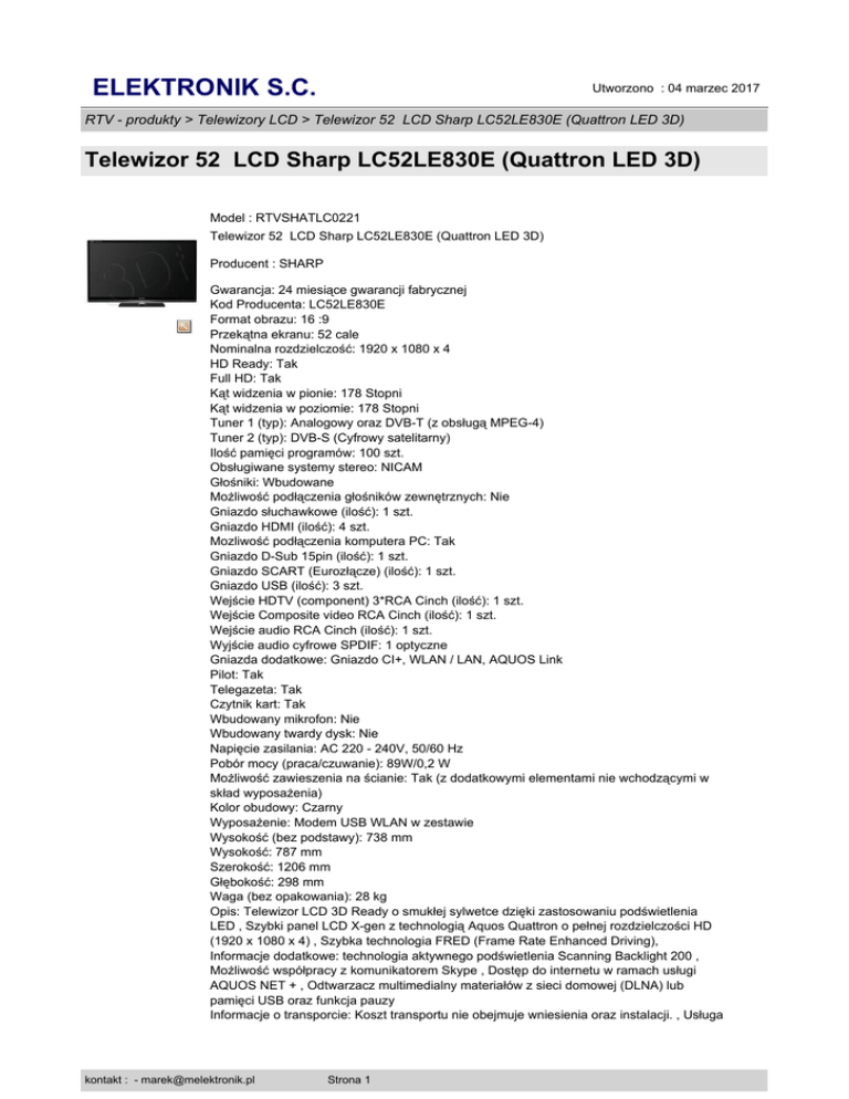 ELEKTRONIK S.C. Utworzono : 04 marzec 2017 RTV - produkty > Telewizory LCD > Telewizor 52 LCD Sharp LC52LE830E (Quattron LED 3D) Telewizor 52 LCD Sharp LC52LE830E (Quattron LED 3D) Model : RTVSHATLC0221 Telewizor 52 LCD Sharp LC52LE830E (Quattron LED 3D) Producent : SHARP Gwarancja: 24 miesiące gwarancji fabrycznej Kod Producenta: LC52LE830E Format obrazu: 16 :9 Przekątna ekranu: 52 cale Nominalna rozdzielczość: 1920 x 1080 x 4 HD Ready: Tak Full HD: Tak Kąt widzenia w pionie: 178 Stopni Kąt widzenia w poziomie: 178 Stopni Tuner 1 (typ): Analogowy oraz DVB-T (z obsługą MPEG-4) Tuner 2 (typ): DVB-S (Cyfrowy satelitarny) Ilość pamięci programów: 100 szt. Obsługiwane systemy stereo: NICAM Głośniki: Wbudowane Możliwość podłączenia głośników zewnętrznych: Nie Gniazdo słuchawkowe (ilość): 1 szt. Gniazdo HDMI (ilość): 4 szt. Mozliwość podłączenia komputera PC: Tak Gniazdo D-Sub 15pin (ilość): 1 szt. Gniazdo SCART (Eurozłącze) (ilość): 1 szt. Gniazdo USB (ilość): 3 szt. Wejście HDTV (component) 3*RCA Cinch (ilość): 1 szt. Wejście Composite video RCA Cinch (ilość): 1 szt. Wejście audio RCA Cinch (ilość): 1 szt. Wyjście audio cyfrowe SPDIF: 1 optyczne Gniazda dodatkowe: Gniazdo CI+, WLAN / LAN, AQUOS Link Pilot: Tak Telegazeta: Tak Czytnik kart: Tak Wbudowany mikrofon: Nie Wbudowany twardy dysk: Nie Napięcie zasilania: AC 220 - 240V, 50/60 Hz Pobór mocy (praca/czuwanie): 89W/0,2 W Możliwość zawieszenia na ścianie: Tak (z dodatkowymi elementami nie wchodzącymi w skład wyposażenia) Kolor obudowy: Czarny Wyposażenie: Modem USB WLAN w zestawie Wysokość (bez podstawy): 738 mm Wysokość: 787 mm Szerokość: 1206 mm Głębokość: 298 mm Waga (bez opakowania): 28 kg Opis: Telewizor LCD 3D Ready o smukłej sylwetce dzięki zastosowaniu podświetlenia LED , Szybki panel LCD X-gen z technologią Aquos Quattron o pełnej rozdzielczości HD (1920 x 1080 x 4) , Szybka technologia FRED (Frame Rate Enhanced Driving), Informacje dodatkowe: technologia aktywnego podświetlenia Scanning Backlight 200 , Możliwość współpracy z komunikatorem Skype , Dostęp do internetu w ramach usługi AQUOS NET + , Odtwarzacz multimedialny materiałów z sieci domowej (DLNA) lub pamięci USB oraz funkcja pauzy Informacje o transporcie: Koszt transportu nie obejmuje wniesienia oraz instalacji. , Usługa kontakt : - [email protected] Strona 1 ELEKTRONIK S.C. Utworzono : 04 marzec 2017 RTV - produkty > Telewizory LCD > Telewizor 52 LCD Sharp LC52LE830E (Quattron LED 3D) Telewizor 52 LCD Sharp LC52LE830E (Quattron LED 3D) transportowa nie obejmuje wniesienia i instalacji www: Link na stronę opisu technicznego Cena : 5.604,38 zł Brutto ( 4.593,75 zł Netto) Dostępność: Produkt dostępny w naszym sklepie od 27 październik 2011 kontakt : - [email protected] Strona 2