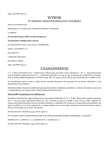 Sygn. akt IVRC 302/15 WYROK W IMIENIU RZECZYPOSPOLITEJ POLSKIEJ Dnia 24 września 2015r. Sąd Rejonowy w Wałbrzychu, Wydział IV Rodzinny i Nieletnich w składzie: Przewodniczący: SSR Urszula Dmytrasz Protokolant: Małgorzata Jawna po rozpoznaniu w dniu 10.09.2015r. w Wałbrzychu sprawy z powództwa J. J. przeciwko D. J. o obniżenie alimentów powództwo oddala. Sygn. akt IVRC 302/15 UZASADNIENIE J. J. w dniu 29 kwietnia 2015 r. wniósł pozew skierowany przeciwko swoim dzieciom D. i M. J.- reprezentowanym przez przedstawicielkę ustawową S. C. - o obniżenie alimentów z kwoty po 450 zł miesięcznie zasądzonych na każde z nich wyrokiem Sądu Okręgowego w Świdnicy sygn. akt o IC 2467/13 do kwoty po 330 zł miesięcznie na każde z nich. W uzasadnieniu pozwu podał, że jego obecna sytuacja finansowa nie pozwala mu na łożenie alimentów w ich dotychczasowej wysokości. Przedstawicielka ustawowa małoletnich pozwanych wniosła o oddalenie powództwa w całości. Zarzuciła, że pozwany w chwili obecnej nie wykorzystuje swoich możliwości finansowych. Sąd ustalił następujący stan faktyczny Wyrokiem rozwodowym z dnia 5 lutego 2014 r. rozwiązano małżeństwo S. i J. J.. W pkt . III wyroku zasądzono alimenty od J. J. na rzecz jego małoletnich dzieci: D. i M. w kwocie po 450 zł na każde z nich. W tym czasie małoletni D. uczęszczał do pierwszej klasy liceum o profilu strażackim, a małoletnia M. uczyła się w drugiej klasy gimnazjalnej. Ich ojciec zarabiał 2770 zł. netto miesięcznie, a matka średnio 1000 ,00 zł. netto miesięcznie oraz pracowała na umowę zlecenia otrzymując 35 zł. netto miesięcznie. Dowód: akta SO w Świdnicy sygn. akt IC 2467/13 Po rozwodzie rodzice małoletnich pozwanych nie dokonali podziału majątku małżeńskiego ./bezsporne/ Małoletni D. J. urodził się (...), a małoletnia M. J. urodziła się (...) Dowód: akta SO w Świdnicy sygn. akt IC 2467/13 Małoletni pozwani uczęszczają do szkół licealnych o tzw. profilu mundurowym. Zakup munduru kosztuje 430 zł. Ich matka w bieżącym roku szkolnym za używane książki zapłaciła około 1000zł. (bezsporne) Powód ma 42 lata i posiada wyuczony zawód kierowca-mechanik. Uprzednio pracował jako: kierowca, konwojent oraz wykonywał prace porządkowe. Obecnie jest pracownikiem lakierni. Zarabia 1607,50 zł netto miesięcznie. J. J. posiada prawo jazdy kategorii A, B, C i E, nie zna języków obcych. Dowód: -zaświadczenia o dochodach powoda k. 2, 28-63 -przesłuchanie powoda k.82-83 Zajmuje on lokal mieszkalny swojej matki ,przekazując jej kwotę 350 zł za mieszkanie i 80 zł. za energię elektryczną. Jego matka ma 68 lat , otrzymuje świadczenie z ZUS w kwocie 1200 zł miesięcznie. Mieszka w lokalu mieszkalnym swojej córki. Powód wraz ze swoją matką wspólnie ponoszą koszty związane z wyżywieniem. Jest właścicielem 15letniego samochodu. Zeznał, że była żona ogranicza mu kontakty z dziećmi. Dowód: przesłuchanie pozwanego k. 82-83 Powiatowy Urząd Pracy w W. w ofertach pracy podał zarobki kierowców mechaników w granicach od 1750 zł. – do 2800 zł. brutto miesięcznie. Dowód: zaświadczenie PUP k.68 Natomiast PUP w Ś. określił zarobki kierowców -bez znajomości języków obcych - na kwotę od 1750 zł.- do3000 zł. brutto miesięcznie . Dowód: zaświadczenie PUP k. 69-70 Pozwani mieszkają wraz z matką i jej mężem. S. C. zarabia 1282 zł. netto oraz z dodatkowej pracy otrzymuje 250 zł. miesięcznie. Jej mąż posiada świadczenie emerytalne w wysokości 1700 zł. netto miesięcznie. Ponadto pracuje i otrzymuje wynagrodzenie w wysokości najniższej krajowej . Wspólne z żoną sprawuje opiekę nad swoją chorą na raka matką, która ma 71 lat. S. C. nie posiada majątku, obecnie za mieszkanie płaci czynsz w wysokości 1150 zł. miesięcznie ( (...)) -za energię 86 zł. miesięcznie oraz opłaca inne media. Podała, że członkowie jej rodziny ubierają się w „secendhandach”. Ponadto zeznała, że powód nie kontaktuje się z małoletnimi pozwanymi. Określiła koszt ich utrzymania na 1200 zł. miesięcznie. Dowód: -przesłuchanie S. C. k.83, -zaświadczenia o zarobkach S. C. k.22,77, - zaświadczenie PIT k.62-63, - zaświadczenie US k. 73-76, -PIT A. C. k.78-79, - zaświadczenia o zarobkach A. C. k.80 Sąd zważył ,co następuje : Powództwo nie zasługuje na uwzględnienie. Zgodnie z treścią art. 138 k.r.o. w razie zmiany stosunków można żądać zmiany orzeczenia lub umowy dotyczącej obowiązku alimentacyjnego. Przez zmianę stosunków w sprawie o obniżenie alimentów rozumie się, istotne zmniejszenie lub ustanie możliwości zarobkowych i majątkowych zobowiązanego do alimentacji lub częściowe usamodzielnienie się finansowe uprawnionego do alimentacji. Zmiany te należy jednak rozpatrywać biorąc również pod uwagę przepis art. 135 k.r.o. mówiący o usprawiedliwionych potrzebach uprawnionego do alimentacji. Opierając się na zebranym w sprawie materiale dowodowym Sąd uznał, iż po stronie J. J. nie nastąpiła istotna zmiana stosunków w rozumieniu art. 138 k.r.o dająca podstawę do obniżenia alimentów na rzecz jego małoletnich dzieci. Z przedłożonych informacji przez PUP w W. i w Ś. wynika ,że w zawodzie powoda istnieje możliwość osiągnięcia wyższych zarobków od tych ,które w chwili obecnej otrzymuje. Jednakże nie wykazał on, że czynił w tym zakresie jakiekolwiek starania. Co do sytuacji majątkowej również nie podniósł kwestii jej pogorszenia. Tym bardziej, że od czasu zasądzenia alimentów w poprzedniej wysokości wzrosły potrzeby małoletnich pozwanych ze względu na ich wiek jak i kontynuacje nauki w szkołach mundurowych, co wiąże się z dodatkowymi kosztami wyposażenia w związku z zakupem odpowiedniej odzieży itp. Z doświadczenia życiowego sądowi wiadomo, że kwota podana przez matkę małoletnich pozwanych - jako miesięczny koszt ich utrzymania - nie jest wygórowana. Powszech