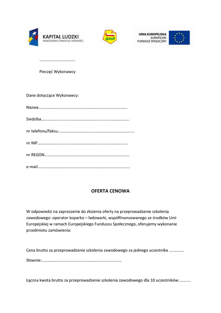 …………………………….. Pieczęć Wykonawcy Dane dotyczące Wykonawcy: Nazwa…………………………………………………………………………… Siedziba………………………………………………………………………….. nr telefonu/faksu………………………………………………………………… nr NIP……………………………………………………………………………. nr REGON……………………………………………………………………….. e-mail……………………………………………………………………………... OFERTA CENOWA W odpowiedzi na zaproszenie do złożenia oferty na przeprowadzenie szkolenia zawodowego: operator koparko – ładowarki, współfinansowanego ze środków Unii Europejskiej w ramach Europejskiego Funduszu Społecznego, oferujemy wykonanie przedmiotu zamówienia: Cena brutto za przeprowadzenie szkolenia zawodowego za jednego uczestnika …………… Słownie:…………………………………………………………………… Łączna kwota brutto za przeprowadzenie szkolenia zawodowego dla 10 uczestników:……….. Słownie:………………………………………………………………….. Oświadczamy, że zapoznaliśmy się z wymaganiami dotyczącymi szkolenia. Oferowana kwota zawiera wszystkie koszty niezbędne do realizacji zadania. W przypadku wybrania naszej oferty zobowiązujemy się do zawarcia umowy na warunkach, w miejscu i terminie określonym przez Zamawiającego. ……………..dnia………… …………………………………………… Imię, nazwisko, podpis osoby upoważnionej do składania oświadczenia woli