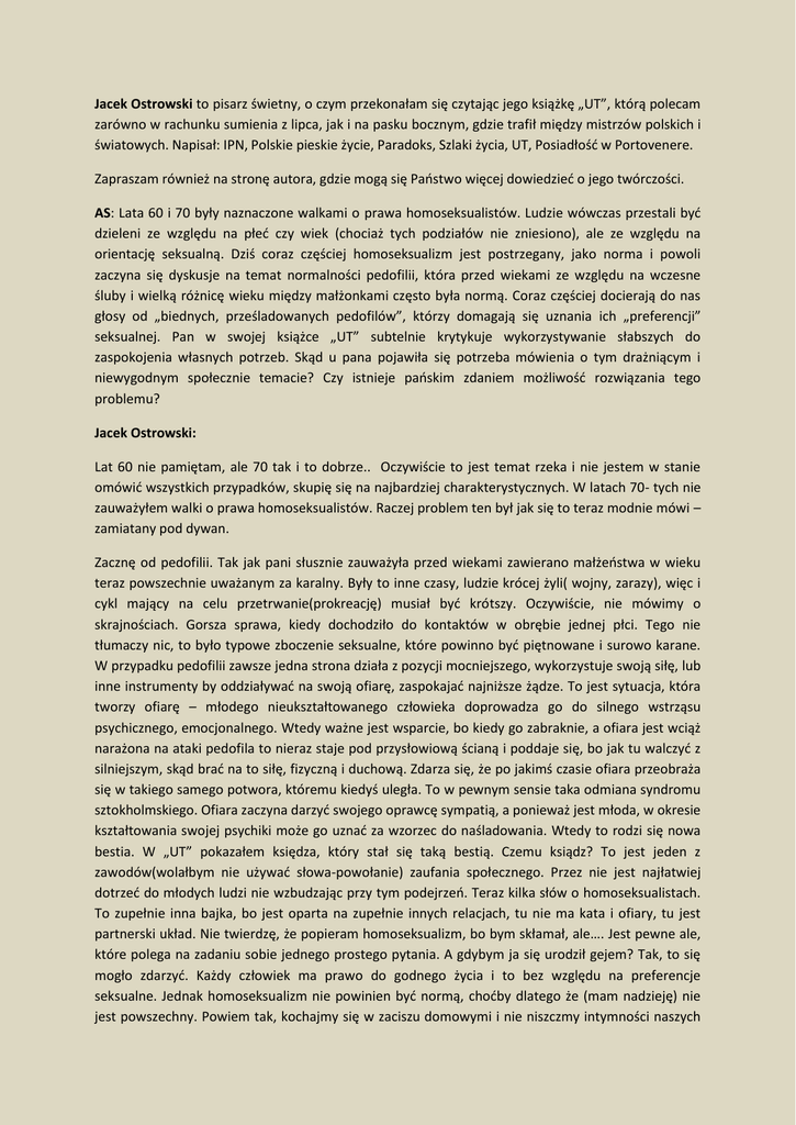 Jacek Ostrowski to pisarz świetny, o czym przekonałam się czytając jego książkę „UT”, którą polecam zarówno w rachunku sumienia z lipca, jak i na pasku bocznym, gdzie trafił między mistrzów polskich i światowych. Napisał: IPN, Polskie pieskie życie, Paradoks, Szlaki życia, UT, Posiadłość w Portovenere. Zapraszam również na stronę autora, gdzie mogą się Państwo więcej dowiedzieć o jego twórczości. AS: Lata 60 i 70 były naznaczone walkami o prawa homoseksualistów. Ludzie wówczas przestali być dzieleni ze względu na płeć czy wiek (chociaż tych podziałów nie zniesiono), ale ze względu na orientację seksualną. Dziś coraz częściej homoseksualizm jest postrzegany, jako norma i powoli zaczyna się dyskusje na temat normalności pedofilii, która przed wiekami ze względu na wczesne śluby i wielką różnicę wieku między małżonkami często była normą. Coraz częściej docierają do nas głosy od „biednych, prześladowanych pedofilów”, którzy domagają się uznania ich „preferencji” seksualnej. Pan w swojej książce „UT” subtelnie krytykuje wykorzystywanie słabszych do zaspokojenia własnych potrzeb. Skąd u pana pojawiła się potrzeba mówienia o tym drażniącym i niewygodnym społecznie temacie? Czy istnieje pańskim zdaniem możliwość rozwiązania tego problemu? Jacek Ostrowski: Lat 60 nie pamiętam, ale 70 tak i to dobrze.. Oczywiście to jest temat rzeka i nie jestem w stanie omówić wszystkich przypadków, skupię się na najbardziej charakterystycznych. W latach 70- tych nie zauważyłem walki o prawa homoseksualistów. Raczej problem ten był jak się to teraz modnie mówi – zamiatany pod dywan. Zacznę od pedofilii. Tak jak pani słusznie zauważyła przed wiekami zawierano małżeństwa w wieku teraz powszechnie uważanym za karalny. Były to inne czasy, ludzie krócej żyli( wojny, zarazy), więc i cykl mający na celu przetrwanie(prokreację) musiał być krótszy. Oczywiście, nie mówimy o skrajnościach. Gorsza sprawa, kiedy dochodziło do kontaktów w obrębie jednej płci. Tego nie tłumaczy nic, to było typowe zboczenie seksualne, które powinno być piętnowane i surowo karane. W przypadku pedofilii zawsze jedna strona działa z pozycji mocniejszego, wykorzystuje swoją siłę, lub inne instrumenty by oddziaływać na swoją ofiarę, zaspokajać najniższe żądze. To jest sytuacja, która tworzy ofiarę – młodego nieukształtowanego człowieka doprowadza go do silnego wstrząsu psychicznego, emocjonalnego. Wtedy ważne jest wsparcie, bo kiedy go zabraknie, a ofiara jest wciąż narażona na ataki pedofila to nieraz staje pod przysłowiową ścianą i poddaje się, bo jak tu walczyć z silniejszym, skąd brać na to siłę, fizyczną i duchową. Zdarza się, że po jakimś czasie ofiara przeobraża się w takiego samego potwora, któremu kiedyś uległa. To w pewnym sensie taka odmiana syndromu sztokholmskiego. Ofiara zaczyna darzyć swojego oprawcę sympatią, a ponieważ jest młoda, w okresie kształtowania swojej psychiki może go uznać za wzorzec do naśladowania. Wtedy to rodzi się nowa bestia. W „UT” pokazałem księdza, który stał się taką bestią. Czemu ksiądz? To jest jeden z zawodów(wolałbym nie używać słowa-powołanie) zaufania społecznego. Przez nie jest najłatwiej dotrzeć do młodych ludzi nie wzbudzając przy tym podejrzeń. Teraz kilka słów o homoseksualistach. To zupełnie inna bajka, bo jest oparta na zupełnie innych relacjach, tu nie ma kata i ofiary, tu jest partnerski układ. Nie twierdzę, że popieram homoseksualizm, bo bym skłamał, ale…. Jest pewne ale, które polega na zadaniu sobie jednego prostego pytania. A gdybym ja się urodził gejem? Tak, to się mogło zdarzyć. Każdy człowiek ma prawo do godnego życia i to bez względu na preferencje seksualne. Jednak homoseksualizm nie powinien być normą, choćby dlatego że (mam nadzieję) nie jest powszechny. Powiem tak, kochajmy się w zaciszu domowymi i nie niszczmy intymności naszych związków. Czy istnieje możliwość rozwiązania tego problemu? Po pierwsze, czy to jest naprawdę problem? Czy nie mamy większych zmartwień? Ważny jest człowiek, a nie jego orientacja. Niech pani wyobrazi sobie taką sytuację. Ma pani domek i oczywiście sąsiadów przez płot. Jedni to małżeństwo z dziesiątką wrzeszczących dzieci. On, paskudny gbur wciąż pije i wszystkich bije, jej zaś buzia się nie zamyka. Zimą palą w piecu starymi oponami, dzieciaki(wychowywane przez ulicę) psocą się nagminnie. Ich tata przez płot wrzuca pani śmieci do ogrodu, a raz cisnął zdechłego kota do studni. Co niedzielę cała ta rozkoszna rodzinka w równym szyku idzie na mszę do kościoła. Drugimi sąsiadami są dwaj panowie, lub dwie panie. Są zawsze uśmiechnięci, skorzy do pomocy. Nieraz z przyjemnością utnie sobie pani z nimi pogawędkę. Ich działka jest zadbana, aż miło spojrzeć. Zimą palą gazem a nieraz jak śnieg przysypie to i pani odśnieżą dojazd. Czy są homoseksualistami, tego nie wiemy, może tak, a może tylko bardzo się lubią, te tajemnice skrywa ich alkowa. Kto jest według pani cenniejszy jako człowiek? Wrócę do pytania, czy to jest problem? Homoseksualizm był i będzie, kwestią jest tylko to, jak często się o nim mówi i czy potrzebnie, zaś pedofilię tępiłbym z całą surowością prawa i dlatego o niej piszę. AS: Kolejną kwestią, jaką pan porusza w książce są eksperymenty koncernów farmaceutycznych. Obrońcy praw zwierząt regularnie protestują przeciw testowaniu lekarstw – które służą również ratowaniu zwierząt – na zwierzętach. Czy testowanie leków na ludziach czy nawet proponowanie takich badań nie jest niszczeniem naszego gatunku? Koncerny farmaceutyczne zarabiają wiele pieniędzy na wprowadzeniu kolejnych nowych lekarstw, które często są wprowadzane bezmyślnie lub bez wcześniejszych badań na osobach, które mają je przyjmowa