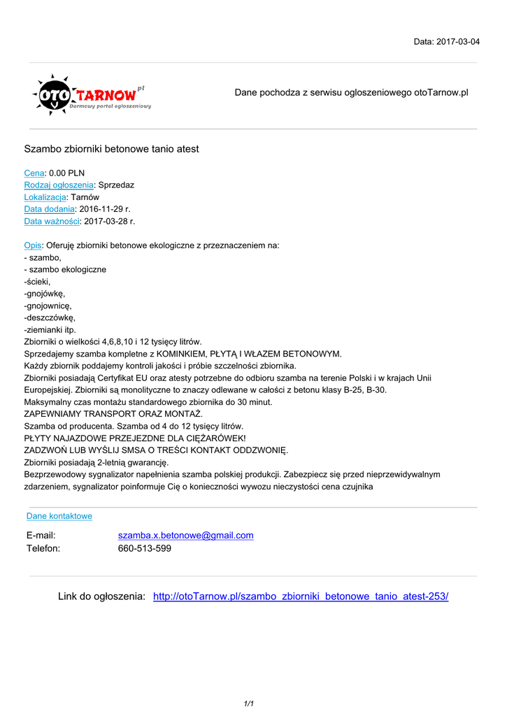 Data: 2017-03-04 Dane pochodza z serwisu ogloszeniowego otoTarnow.pl Szambo zbiorniki betonowe tanio atest Cena: 0.00 PLN Rodzaj ogłoszenia: Sprzedaz Lokalizacja: Tarnów Data dodania: 2016-11-29 r. Data ważności: 2017-03-28 r. Opis: Oferuję zbiorniki betonowe ekologiczne z przeznaczeniem na: - szambo, - szambo ekologiczne -ścieki, -gnojówkę, -gnojownicę, -deszczówkę, -ziemianki itp. Zbiorniki o wielkości 4,6,8,10 i 12 tysięcy litrów. Sprzedajemy szamba kompletne z KOMINKIEM, PŁYTĄ I WŁAZEM BETONOWYM. Każdy zbiornik poddajemy kontroli jakości i próbie szczelności zbiornika. Zbiorniki posiadają Certyfikat EU oraz atesty potrzebne do odbioru szamba na terenie Polski i w krajach Unii Europejskiej. Zbiorniki są monolityczne to znaczy odlewane w całości z betonu klasy B-25, B-30. Maksymalny czas montażu standardowego zbiornika do 30 minut. ZAPEWNIAMY TRANSPORT ORAZ MONTAŻ. Szamba od producenta. Szamba od 4 do 12 tysięcy litrów. PŁYTY NAJAZDOWE PRZEJEZDNE DLA CIĘŻARÓWEK! ZADZWOŃ LUB WYŚLIJ SMSA O TREŚCI KONTAKT ODDZWONIĘ. Zbiorniki posiadają 2-letnią gwarancję. Bezprzewodowy sygnalizator napełnienia szamba polskiej produkcji. Zabezpiecz się przed nieprzewidywalnym zdarzeniem, sygnalizator poinformuje Cię o konieczności wywozu nieczystości cena czujnika Dane kontaktowe E-mail: Telefon: [email protected] 660-513-599 Link do ogłoszenia: http://otoTarnow.pl/szambo_zbiorniki_betonowe_tanio_atest-253/ 1/1
