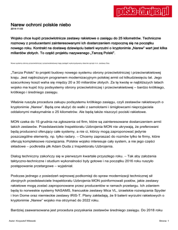 Narew ochroni polskie niebo 2014-11-03 Wojsko chce kupić przeciwlotnicze zestawy rakietowe o zasięgu do 25 kilometrów. Techniczne rozmowy z producentami zainteresowanymi ich dostarczeniem rozpoczną się na początku nowego roku. Kontrakt na dostawę dziewięciu baterii wyrzutni o kryptonimie „Narew” wart jest kilka miliardów złotych. To część projektu nazywanego „Tarczą Polski”. Nowe systemy obrony przeciwlotniczej i przeciwrakietowej mają zastąpić wykorzystywany obecnie sprzęt m.in. zestawy Osa. „Tarcza Polski” to projekt budowy nowego systemu obrony przeciwlotniczej i przeciwrakietowej kraju. Jest najdroższym programem modernizacyjnym polskiej armii od kilkudziesięciu lat. Jego szacunkowy koszt waha się między 20 a 30 miliardów złotych. Za tę kwotę w najbliższych latach wojsko ma kupić trzy podsystemy obrony przeciwlotniczej i przeciwrakietowej – bardzo krótkiego, krótkiego i średniego zasięgu. Właśnie ruszyła procedura zakupu podsystemu krótkiego zasięgu, czyli zestawów rakietowych o kryptonimie „Narew”. Będą one służyć do walki z samolotami i śmigłowcami nieprzyjaciela oddalonymi maksymalnie o 25 kilometrów. Ale będą także niszczyć pociski rakietowe. MON czeka do 15 grudnia na zgłoszenia od firm, które są zainteresowane dostarczeniem armii takich zestawów. Przedstawiciele Inspektoratu Uzbrojenia MON nie ukrywają, że preferowani będą producenci oferujący całe systemy, a nie ci, którzy mogą zaproponować jedynie poszczególne elementy, np. tylko radary. – Chcemy zapraszać do rozmów tylko te firmy, które oferują kompleksowe rozwiązania. Polskie wojsko interesuje cały system, a nie jego części składowe – podkreśla płk Adam Duda z Inspektoratu Uzbrojenia. Dialog techniczny zakończy się w pierwszym kwartale przyszłego roku. – Tak aby założenia taktyczno-techniczne i studium wykonalności były gotowe i na początku 2016 roku ruszyło postępowanie przetargowe – wyjaśniał. Podczas jednego z posiedzeń sejmowej podkomisji do spraw modernizacji technicznej sił zbrojnych przedstawiciele Inspektoratu Uzbrojenia MON poinformowali posłów, jakie zestawy rakietowe mogą zostać zaproponowane przez producentów w ramach przetargu. Ich zdaniem będą to norweskie systemy NASAMS, francuskie zestawy Mica VL, izraelskie rozwiązania Spyder i Iron Dome oraz niemieckie zestawy IRIS-T. Plany zakładają, że 9 baterii wyrzutni rakietowych o kryptonimie „Narew” wojsko ma otrzymać do 2022 roku. Bardziej zaawansowana jest procedura pozyskania zestawów średniego zasięgu. Do 2018 roku Autor: Krzysztof Wilewski Strona: 1 armia ma dostać 8 baterii wyrzutni o kryptonimie „Wisła”, mających największy, bo przekraczający 100 kilometrów, zasięg. Dialog techniczny z producentami tego uzbrojenia zakończył się już w połowie roku. Wojskowi zdecydowali, że zaproszenie do złożenia ofert wstępnych, co powinno nastąpić jeszcze jesienią, otrzymają: francuskie konsorcjum EUROSAM oferujące zestawy SAMP/T oraz firma Raytheon z USA oferująca zestawy Patriot. Podsystemy obrony przeciwlotniczej i przeciwrakietowej bardzo krótkiego zasięgu wojsko chce kupić w ciągu najbliższych czterech lat. Plany zakładają, że do 2019 roku armia otrzyma 6 baterii rakietowo-artyleryjskich zestawów bliskiego zasięgu o kryptonimie „Pilica”. Mają one umożliwiać zwalczanie celów oddalonych o kilka kilometrów, nie tylko samolotów czy śmigłowców, ale również dronów. Autor: Krzysztof Wilewski Strona: 2