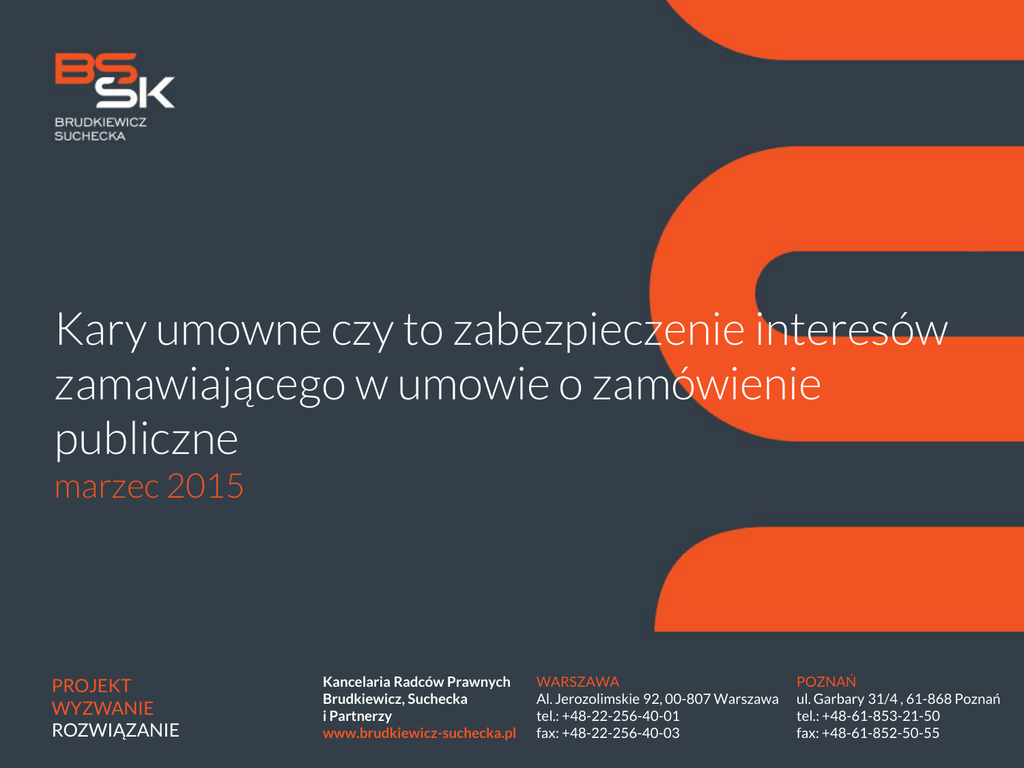 Kary umowne czy to zabezpieczenie interesów zamawiającego w umowie o zamówienie publiczne marzec 2015 PROJEKT WYZWANIE ROZWIĄZANIE Kancelaria Radców Prawnych Brudkiewicz, Suchecka i Partnerzy www.brudkiewicz-suchecka.pl WARSZAWA Al. Jerozolimskie 92, 00-807 Warszawa tel.: +48-22-256-40-01 fax: +48-22-256-40-03 POZNAŃ ul. Garbary 31/4 , 61-868 Poznań tel.: +48-61-853-21-50 fax: +48-61-852-50-55 Kary umowne jako zabezpieczenie interesów zamawiającego w umowie o zamówienie publiczne marzec 2015 SPIS TREŚCI: 1. Definicja kary umownej 2. Wysokość kary umownej 3. Przykładowe postanowienia ustalające kary 4. Kara umowna zamiast odszkodowania 5. Kumulowanie kar 6. Miarkowanie kar 7. Katalog mierników rażącego wygórowania kar Kary umowne jako zabezpieczenie interesów zamawiającego w umowie o zamówienie publiczne marzec 2015 1. Definicja kary umownej Kara umowna to określona w umowie kwota zastrzeżona w przypadku niewykonania lub nienależytego wykonania zobowiązania niepieniężnego Art. 483 kodeksu cywilnego Można zastrzec w umowie, że naprawienie szkody wynikłej z niewykonania lub nienależytego wykonania zobowiązania niepieniężnego nastąpi przez zapłatę określonej sumy (kara umowna). Kary umowne jako zabezpieczenie interesów zamawiającego w umowie o zamówienie publiczne marzec 2015 Opóźnienie a zwłoka •Opóźnienie to stan uchybienia terminowi wykonania zobowiązania przez dłużnika • Zwłoka – to takie opóźnienie, za które odpowiada dłużnik (zwana kwalifikowanym opóźnieniem) Wyrok KIO z dnia 9 listopada 2012 r. sygn. akt: 2333/12 Kary umowne jako zabezpieczenie interesów zamawiającego w umowie o zamówienie publiczne marzec 2015 Klauzla 8.7 Kary za zwłokę – czy na pewno? Jeżeli Wykonawca nie wypełni wymagań klauzuli 8.2 [Czas na Wykonanie] to będzie on zobowiązany do zapłacenia Zamawiającemu za to uchybienie kary na mocy klauzuli 2.5 [Roszczenia Zamawiającego]. Kara taka będzie równa kwocie ustalonej w Załączniku do Oferty i będzie płacona za każdy dzień, który upłynie między odpowiednim Czasem na Wykonanie i dniem ustalonym w Świadectwie Przejęcia. Łączna kwota kary należnej na mocy niniejszej klauzuli nie może jednak przekroczyć maksymalnej kwoty kary za zwłokę, jeśli taka jest ustalona w Załączniku do Oferty. Wymienione kary za zwłokę będą jedynymi karami należnymi od Wykonawcy za takie uchybienie poza przypadkami wypowiedzenia na mocy klauzuli 15.2 [Rozwiązanie przez Zamawiającego] przed wykonaniem Robót. Kary umowne jako zabezpieczenie interesów zamawiającego w umowie o zamówienie publiczne marzec 2015 2. Wysokość kary umownej • wysokość kar umownych określa umowa (strony umowy) • w ramach umów z zakresu prawa zamówień publicznych wysokość kar określana jest zazwyczaj przez zamawiających w projekcie umowy • w procedurze otwartej udzielania zamówień – wysokość kary nie podlega negocjacji przez strony Kary umowne jako zabezpieczenie interesów zamawiającego w umowie o zamówienie publiczne marzec 2015 2. Wysokość kary umownej Wyrok KIO 253/09 Izba nie podzieliła także stanowiska Odwołującego co do określenia wysokości kary umownej, wskazanej w § 7 ust. 2 tiret 4 w sposób wygórowany. Ustawa Pzp, jak również przepisy kodeksu cywilnego nie określają maksymalnej wysokości kar umownych, ani nie formułują definicji kary rażąco wysokiej. Kary umowne jako zabezpieczenie interesów zamawiającego w umowie o zamówienie publiczne marzec 2015 2. Wysokość kary umownej Wyrok KIO 1547/09 Zamawiający uprawniony jest do żądania zapłaty kary umownej nawet w razie, gdy wskutek zaistnienia okoliczności wskazanych w Subklauzuli 8.7. nie poniósł szkody. Postanowienie takie odpowiada obowiązującemu prawu i, wbrew stanowisku odwołującego się, nie jest nieważne z mocy art. 58 § 1 k. c. Podobnie wyroki: 1183/12, 1516/12 Kary umowne jako zabezpieczenie interesów zamawiającego w umowie o zamówienie publiczne marzec 2015 3. Przykładowe postanowienia ustalające kary • kary umowne za opóźnienie/zwłokę w wykonaniu określonych etapów umowy w stosunku do przyjętego harmonogramu • kary umowne za przekroczenie udostępnień (np. zamknięcia torowe) • kary umowne za odstąpienie od umowy z przyczyn leżących po stronie wykonawcy • kary umowne za brak dostarczenia w terminie dokumentów, opracowań, itp.; • kary umowne za brak stawiennictwa podczas spotkań, czynności w terenie Kary umowne jako zabezpieczenie interesów zamawiającego w umowie o zamówienie publiczne marzec 2015 4. Kara umowna zamiast odszkodowania Kara umowna lepsza od odszkodowania? Wyrok Sądu Apelacyjnego w Łodzi z dnia 11 września 2014 r. (sygn. akt: I ACa 309/14) Pogląd, że kara umowna jest tzw. surogatem odszkodowania, nie oznacza tego, że kara umowna ma zastąpić jedynie odszkodowanie w związku z powstającą po stronie wierzyciela szkodą majątkową. Sformułowanie "surogat odszkodowania" należy rozumieć w tym sensie, że strony przy zawarciu umowy określają z góry karę umowną na wypadek niewykonania lub nienależytego wykonania zobowiązania przez dłużnika i kara ta kompensuje wszystkie negatywne dla wierzyciela konsekwencje wynikające ze stanu naruszenia zobowiązania. Operuje się tu pojęciem tzw. szkody ogólnej, innej niż zindywidualizowana szkoda majątkowa wierzyciela. Kary umowne jako zabezpieczenie interesów zamawiającego w umowie o zamówienie publiczne marzec 2015 4. Kara umowna zamiast odszkodowania Zamawiający może dochodzić kary umownej, jeżeli: • przewidziane zostało w umowie zastrzeżenie o karach • wykaże (udowodni), że wykonawca (dłużnik) nie wykonał zobowiązania lub wykonał je nienależycie • w przypadku zastrzeżenia kary za zwłokę (nie za opóźnienie) – wykaże, że przyczyna niewykonania lub nienależytego wykonania leży po stronie wykonawcy Kary umowne jako zabezpieczenie interesów zamawiającego 