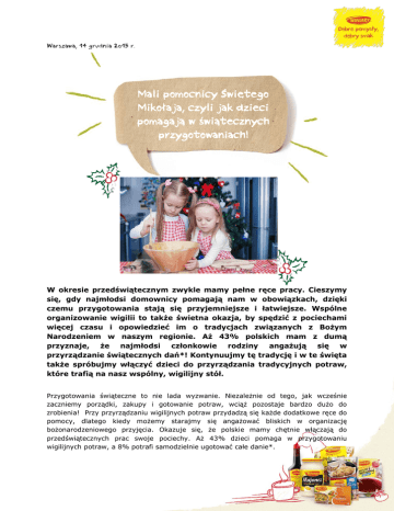 Warszawa, 14 grudnia 2015 r. Mali pomocnicy Świętego Mikołaja, czyli jak dzieci pomagają w świątecznych przygotowaniach! W okresie przedświątecznym zwykle mamy pełne ręce pracy. Cieszymy się, gdy najmłodsi domownicy pomagają nam w obowiązkach, dzięki czemu przygotowania stają się przyjemniejsze i łatwiejsze. Wspólne organizowanie wigilii to także świetna okazja, by spędzić z pociechami więcej czasu i opowiedzieć im o tradycjach związanych z Bożym Narodzeniem w naszym regionie. Aż 43% polskich mam z dumą przyznaje, że najmłodsi członkowie rodziny angażują się w przyrządzanie świątecznych dań*! Kontynuujmy tę tradycję i w te święta także spróbujmy włączyć dzieci do przyrządzania tradycyjnych potraw, które trafią na nasz wspólny, wigilijny stół. Przygotowania świąteczne to nie lada wyzwanie. Niezależnie od tego, jak wcześnie zaczniemy porządki, zakupy i gotowanie potraw, wciąż pozostaje bardzo dużo do zrobienia! Przy przyrządzaniu wigilijnych potraw przydadzą się każde dodatkowe ręce do pomocy, dlatego kiedy możemy starajmy się angażować bliskich w organizację bożonarodzeniowego przyjęcia. Okazuje się, że polskie mamy chętnie włączają do przedświątecznych prac swoje pociechy. Aż 43% dzieci pomaga w przygotowaniu wigilijnych potraw, a 8% potrafi samodzielnie ugotować całe danie*. Przygotowanie potraw z naszymi małymi pomocnikami sprawia, że gorący okres przedświąteczny jest zdecydowanie łatwiejszy i przyjemniejszy. Wspólne gotowanie przed Bożym Narodzeniem może być także doskonałą okazją do rozmów o świątecznych zwyczajach. Jednym z nich jest przyrządzanie tradycyjnego barszczu wigilijnego. Gotowanie świątecznej zupy od podstaw okazuje się jednak trudne i czasochłonne, dlatego podczas przedświątecznych zakupów 27% polskich pań domu sięga po barszcz czerwony*. Aby uzyskać intensywny kolor i idealny smak i doprawienie wigilijnego barszczu, warto przygotować go z Barszczem czerwonym Ekspresowa Zupa WINIARY. Dzięki niemu w łatwy sposób ugotujemy pyszny barszcz, a w przygotowaniach na pewno pomogą nam nasze pociechy! Możemy zaangażować je na przykład w przyrządzenie paluchów serowych, które idealnie smakują z tradycyjną wigilijną potrawą. Dzieci z pewnością pomogą nam także w przygotowaniu świątecznych sałatek. Starsze pociechy świetnie poradzą sobie z krojeniem warzyw, a młodsze pomogą nam w doprawieniu i udekorowaniu potrawy. Idealnym dodatkiem do wszelkiego rodzaju bożonarodzeniowych sałatek, zarówno warzywnych, jak i śledziowych, będzie Majonez Dekoracyjny WINIARY. Dzięki niemu nasza potrawa nie tylko będzie doskonale smakowała, ale także świetnie zaprezentuje się na wigilijnym stole. W te święta w przygotowanie tradycyjnych potraw postarajmy się włączyć nasze pociechy. Aby ułatwić przyrządzanie bożonarodzeniowych dań, wykorzystajmy produkty marki WINIARY, z którymi ugotowanie wigilijnego barszczu, przygotowanie pierogów czy sałatek okaże się samą przyjemnością. Przepisy na świąteczne potrawy znajdziemy na www.winiary.pl. * Badanie konsumenckie „Odkrywamy smaki rodzinnych chwil”, przeprowadzone przez firmę Millward Brown na zlecenie marki WINIARY, 2014. ### WINIARY to marka, która od lat jest gwarancją sukcesu w kuchni. Jej produkty inspirują współczesne panie domu do przygotowywania najsmaczniejszych potraw dla całej rodziny. Zupy, majonezy, buliony, sosy, Pomysły na…, dania instant, przyprawy, galaretki, kisiele czy budynie – w sumie ponad 230 różnych produktów kulinarnych WINIARY, które pozwalają w szybki i prosty sposób przyrządzić domowy posiłek. Na stronie www.winiary.pl panie domu znajdą przepisy oraz inspiracje kulinarne na każdy dzień. Produkty marki WINIARY rokrocznie zdobywają liczne nagrody przyznawane przez konsumentów i detalistów. W 2011 oraz 2012 roku redakcja „Rzeczpospolitej” przyznała marce WINIARY prestiżowy tytuł Najmocniejszej Marki Roku. Kontakt do biura prasowego: Kamila Dębniak kom. +48 508 988 861 Email: [email protected] Edyta Szyszło kom. +48 519 429 226 email: [email protected]