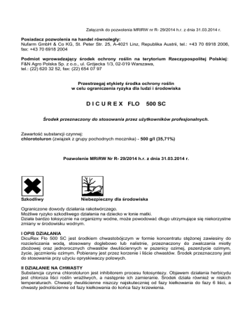 Załącznik do pozwolenia MRIRW nr R- 29/2014 h.r. z dnia 31.03.2014 r. Posiadacz pozwolenia na handel równoległy: Nufarm GmbH & Co KG, St. Peter Str. 25, A-4021 Linz, Republika Austrii, tel.: +43 70 6918 2006, fax: +43 70 6918 2004 Podmiot wprowadzający środek ochrony roślin na terytorium Rzeczypospolitej Polskiej: F&N Agro Polska Sp. z o.o., ul. Grójecka 1/3, 02-019 Warszawa, tel.: (22) 620 32 52, fax: (22) 654 07 97 Przestrzegaj etykiety środka ochrony roślin w celu ograniczenia ryzyka dla ludzi i środowiska D I C U R E X FLO 500 SC Środek przeznaczony do stosowania przez użytkowników profesjonalnych. Zawartość substancji czynnej: chlorotoluron (związek z grupy pochodnych mocznika) - 500 g/l (35,71%) Pozwolenie MRiRW Nr R- 29/2014 h.r. z dnia 31.03.2014 r. Szkodliwy Niebezpieczny dla środowiska Ograniczone dowody działania rakotwórczego. Możliwe ryzyko szkodliwego działania na dziecko w łonie matki. Działa bardzo toksycznie na organizmy wodne, może powodować długo utrzymujące się niekorzystne zmiany w środowisku wodnym. I OPIS DZIAŁANIA DicuRex Flo 500 SC jest środkiem chwastobójczym w formie koncentratu stężonej zawiesiny do rozcieńczania wodą, stosowany doglebowo lub nalistnie, przeznaczony do zwalczania miotły zbożowej oraz jednorocznych chwastów dwuliściennych w pszenicy ozimej, pszenżycie ozimym, życie, jęczmieniu ozimym. Pobierany jest przez korzenie i liście chwastów. Środek przeznaczony jest do stosowania przy użyciu opryskiwaczy polowych. II DZIAŁANIE NA CHWASTY Substancja czynna chlorotoluron jest inhibitorem procesu fotosyntezy. Objawem działania herbicydu jest chloroza liści roślin wrażliwych, a następnie ich zamieranie. Środek działa również w niskich temperaturach. Chwasty dwuliścienne niszczy najskuteczniej od fazy kiełkowania do fazy 6 liści, a chwasty jednoliścienne od fazy kiełkowania do końca fazy krzewienia. Chwasty wrażliwe: chaber bławatek, gwiazdnica pospolita, jasnota różowa, komosa biała, miotła zbożowa, rumian polny, tasznik pospolity, tobołki polne, wyczyniec polny. Chwasty średnio wrażliwe: przetacznik polny. Chwasty średnio odporne: bodziszek drobny, samosiewy rzepaku (w fazie kiełkowania). Chwasty odporne: dymnica pospolita, fiołek polny, mak polny, przytulia czepna. III ZASTOSOWANIE ŚRODKA Pszenica ozima, pszenżyto ozime, żyto, jęczmień ozimy A. Jesienią od fazy 3 liści zbóż do wystąpienia przymrozków (faza 3 liści ma miejsce wówczas, gdy liść trzeci jest dłuższy od drugiego i przestaje rosnąć). Maksymalna dawka dla jednorazowego zastosowania: 2 l/ha Zalecana dawka dla jednorazowego zastosowania: 2 l/ha W przypadku dużych wahań temperatury między dniem i nocą środek może spowodować okresowe żółknięcie liści zbóż. Maksymalna liczba zabiegów w sezonie wegetacyjnym – 1. Zalecana ilość wody: 200-300 l/ha. Zalecane opryskiwanie: niskociśnieniowe. B. Wiosną, bezpośrednio po rozpoczęciu wegetacji zbóż, do pełni fazy krzewienia. Maksymalna dawka dla jednorazowego zastosowania: 3 l/ha Zalecana dawka dla jednorazowego zastosowania: 3 l/ha Maksymalna liczba zabiegów w sezonie wegetacyjnym – 1. Zalecana ilość wody: 200-300 l/ha. Zalecane opryskiwanie: niskociśnieniowe. UWAGI: 1. Wyższą z zalecanych dawek stosować w warunkach niesprzyjających działaniu herbicydów, to jest podczas niskiej temperatury i suszy oraz na chwasty występujące w większym nasileniu. 2. Środek można stosować tylko na plantacjach o starannej uprawie przedsiewnej, przy wysiewie ziarna na jednakową głębokość 2-3 cm oraz wyrównanych wschodach. 3. Gdy wschody są nierównomierne środek może powodować uszkodzenie zbóż. 4. PRZECIWWSKAZANIA W celu niedopuszczenia do powstawania odporności chwastów na środek stosować przemiennie herbicydy należące do grup chemicznych o odmiennym mechanizmie działania. Podczas stosowania środka nie dopuścić do znoszenia cieczy użytkowej na sąsiadujące rośliny uprawne, szczególnie dwuliścienne. Opryskiwać podczas bezwietrznej pogody. Nie dopuścić do nakładania się cieczy użytkowej na stykach pasów zabiegowych i uwrociach. Środka nie stosować: - w temperaturze powyżej 20°C, - na glebach piaszczystych i torfowych oraz łatwo zamulających się, - na rośliny mokre lub zwiędnięte, - na rośliny uszkodzone przez choroby lub szkodniki, - po wschodach, wcześniej niż w fazie trzech liści pszenicy i jęczmienia, - w zbożach z wsiewką roślin motylkowych. 5. NASTĘPSTWO ROŚLIN Środek rozkłada się podczas okresu wegetacji do poziomu niestwarzającego zagrożenia dla roślin uprawianych następczo, z wyjątkiem rzepaku ozimego uprawianego na polu, na którym wiosną zastosowano Dicurex Flo 500 SC, który w niesprzyjających warunkach może reagować negatywnie. W przypadku konieczności wcześniejszej likwidacji plantacji (np. w wyniku uszkodzenia roślin przez szkodniki, choroby, przymrozki, suszę itd.) roślinami następczymi mogą być: jęczmień jary, pszenica jara, ziemniak, groch siewny. 6. OKRES OD OSTATNIEGO ZASTOSOWANIA ŚRODKA NA ROŚLINY DO DNIA, W KTÓRYM MOŻNA SIAĆ LUB SADZIĆ ROŚLINY UPRAWIANE NASTĘPCZO Nie dotyczy IV SPORZĄDZANIE CIECZY UŻYTKOWEJ Przed przystąpieniem do sporządzania cieczy użytkowej dokładnie ustalić potrzebną jej ilość. Zawartością opakowania przed użyciem wstrząsnąć. Odmierzoną ilość środka wlać do zbiornika opryskiwacza napełnionego częściowo wodą (z włączonym mieszadłem). Opróżnione opakowania przepłukać trzykrotnie wodą, a popłuczyny wlać do zbiornika opryskiwacza z cieczą użytkową. Następnie zbiornik opryskiwacza uzupełnić wodą do potrzebnej ilości. Po wlaniu środka do zbiornika opryskiwacza niewyposażonego w mieszadło hydrauliczne ciecz w zbiorniku mechanicznie wymieszać. W przypadku przerw w opryskiwaniu przed ponownym przystąpieniem do pracy, dokładnie wymieszać ciecz użytkową w zbiorniku opryskiwacza.