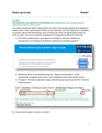 System ulg na myto Nowości _______________________________________________________________________ 14.1.2012 Jak postępywać przy zagubieniu albo kradzieży tablic rejestracyjnych, aby unikniąć utraty lub ograniczenia prawa do zniżki na myto Czy zostały skradzione tablice rejestracyjne lub numer rejestracyjny pojazdu jest zagubiony i nadano nowy numer rejestracyjny? Mimo, że się rozchodzi o ten sam pojazd, jest niezbędne w systemie ulg ten fakt zaewidować, aby nie doszło do utraty lub ograniczenia prawa do zniżki na myto. Jak w tym przypadku postępywać? Postępujcie według tych instrukcji: 1) Na Portale ewidencyjnym ulg wybierzcie możliwość „Jesteście Państwo już zaewidowani i potrzebujecie dodatkowo dopisać lub wykreślić pojazdy?“ 2) Wypełnicie dane o przewoźnikowi łącznie z danymi kontaktowymi. Jeżeli przewoźnika zastępuje osoba trzecia, jest niezbędne podać dane osoby trzeciej. 3) W części E formularza zgłoszeniowego wykreślicie pojazd pod poprzednim numerem rejestracyjnym: 4) Zarejestrujcie pojazd z nowym numerem: 1 5) Do pola dla notatki w części F formularza zgłoszeniowego wpiszcie fakt, że się rozchodzi o zmianę numeru rejestracyjnego pojazdu: 6) 7) 8) 9) Wypełnicie wszystkie pozostałe elementy wniosku Potwierdźcie wniosek sposobem standardowym (żądać PIN i wpisać go do formularza), Wydrukować przesłany wniosek i autoryzować, Dołączyć do wniosku kopię dowodu rejestracyjnego, z którego jest oczywiste, że się rozchodzi o zmianę numeru rejestracyjnego dla ten sam pojazd i tego samego użytkownika 10) Przesłać wniosek i z załącznikem Administratorowi systemu elektronicznego myta na opublikowany adres. Po otrzymaniu tego wniosku zostanie Państwa pojazd ewidowany w systemie ulg pod starym i nowym numerem rejestracyjnym i podstawą obliczenia zniżki będzie obliczenie dla obu tablic razem. 8. 1. 2013 Ustalenie początku okresu do obliczenia ulg dla 2013 rok Dla 2013 rok rozpoczyna się okres, za który jest obliczana podstawa do ustalenia wysokości ulgi w dniu odesłania wniosku elektronicznie do systemu ulg 8. 1. 2013 Jak mogę sprawdzić, czy mój wniosek został pomyślnie dostarczony do systemu ulg? Jeżeli został wysłany wydrukowany wniosek który zawiera numer identyfikacyjny, jest autoryzowany przez osobę upoważnioną i zawiera wszystkie wymagane załączniki 2 na adres Administratora eletronicznego myta RCz, w takim razie Państwa wniosek był w porządku dostarczony do Systemu ulg. Wymagania, które są konieczne, aby mieć pewność, że wniosek został pomyślnie dostarczony do systemu ulg, są opisane poniżej. Każdy wniosek złożony w Systemie ulg ma swój numer indetyfikacyjny. Jeśli wydruk Państwa wniosku taki numer nie zawiera, najprawdopodobniej żeście nie postępowali poprawnie. Numer identyfikacyjny jest zawsze 12 cyfrowy i pojawia się w nagłówku każdego ważnego wniosku: Numer identyfikacyjny jest do wniosku przydzielony w momencie, gdy zażądacie tzw. PIN. PIN służy do potwierdzienia odesłania wniosku elektronicznego do Systemu ulg i do poświadczenia funkcjonowania e-mailu kontaktowego wymienionego w wniosku. Rozchodzi się o czterocyfrowy numer generowany systemem. Przesłanie PIN żądacie ściśnięciem przycisku „Skontrolować i żądać PIN“. Ten przycisk znajdziecie w stopce formularza zgłoszeniowego: 3 PIN będzie Państwu natychmiast przesłany na dany e-mail kontaktowy. Znajdzicie go tutaj: Ten numer trzeba włożyć do pola, który jest wyświetlany w stopce formularza zgłoszeniowego i przesłać go do systemu poprzez naciśnięcie przycisku „Wysłać PIN / Send PIN“: Po wpisaniu i wysłaniu PIN jest Państwu na dany e-mail kontaktowy przesłany wniosek w formacie pdf przeznaczony do drukowania. Jeśliście otrzymali na dany e-mail kontaktowy wypełniony wniosek w formacie pdf, Wasz wniosek jest w tym momencie złożony w Systemie ulg. Jeśliście zażądali PIN i nie otrzymali e-mail z tym numerem, należy sprawdzić E-mail kontaktowy w formularzu nie jest napisany poprawnie: przepiście e-mail i żądajcie PIN ponownie E-mail z PIN jest w spamach: wpiście dane z poczty śmieciowej E-mail z PIN nie był dostarczony z powodu pełnej skrzyńki e-mailowej: uwolníć skrzyńkę dla e-mail kontaktowy i kontaktować infolinię Systemu ulg, Nie jest to ani jedna z powyższych opcji: kontaktować infolinię Systemu ulg. 4 Prosimy zwrócić zwłaszcza uwagę na wszystkie wymagane dane przy potwierdzaniu i wysyłaniu wniosku elektronicznego do systemu ulg. Wniosek, dla którego nie było wysłane żądanie przydzielenia PIN, nie jest jeszcze w Systemie ulg złożony. Przy drukowaniu nie potwierdzonego wniosku bez przydzielonego numeru identyfikacyjnebo prosto ze strony internetowej się może zdarzyć, że Państwa dane kontaktowe nie będą mogły być z powodu nie zupełnego wyświetlania stosowane obsługą Systemu ulg na wezwanie do właściwego ukończenia i złożenia wniosku. Zawsze się więc trzeba upewnić, ze wydrukowany wniosek ma przydzielony numer identyfikacyjny. Jeśli nie, będzie trzeba wniosek wypełnić ponownie i wysłać do systemu poprawnym sposobem. Żeby wniosek o zaewidowanie do systemu ulg był ważny, jest niezbędne przesłać jego autoryzowaną wydrukowaną wersję Administratorowi Systemu elektronicznego poboru opłat. Wniosek musi być podpisany osobą upoważnioną do działania w imieniu użytkownika pojazdu, konieczne jest również określić funkcję /stanowisko tej osoby w firmię użytkownika. Jeżeli obsługa Systemu ulg znajdzie w Państwa wniosku nieprawidłości, będziecie skontaktowani na danym e-mailowi kontaktowym albo numerze telefonicznym. Dopełnienie lub wyjaśnienie nieprawidłości nie ma wpływ na datę początku ewidencji przewoźnika i pojazdów w systemie ulg. Data początku ewidencji jest datą pierwszego wysłania danych. 5