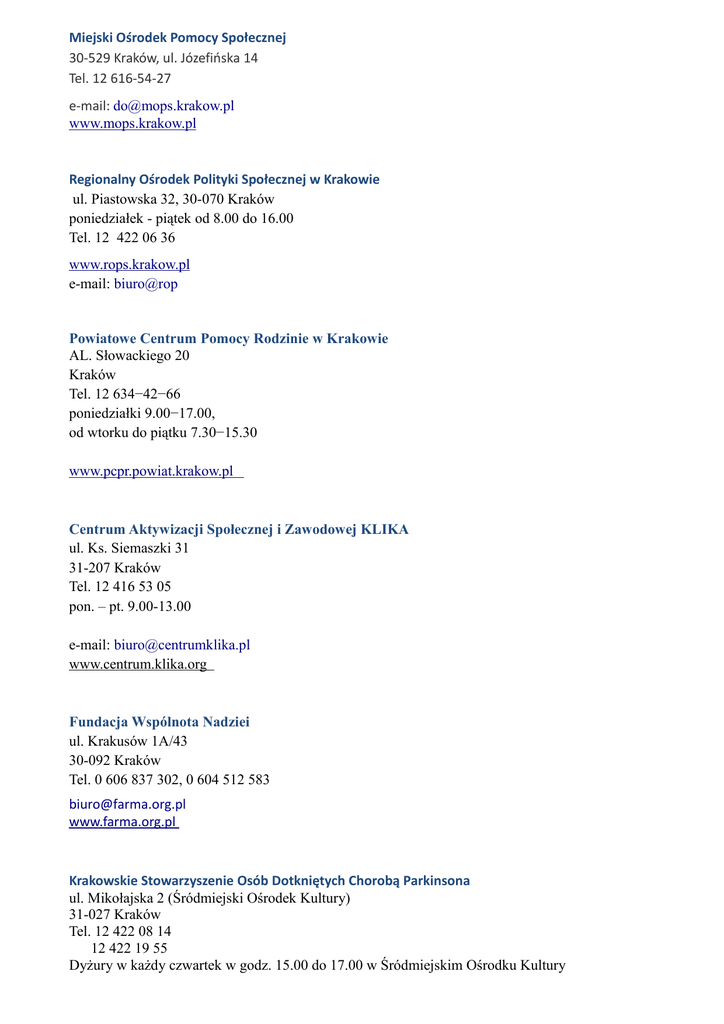 Miejski Ośrodek Pomocy Społecznej 30-529 Kraków, ul. Józefińska 14 Tel. 12 616-54-27 e-mail: [email protected] www.mops.krakow.pl Regionalny Ośrodek Polityki Społecznej w Krakowie ul. Piastowska 32, 30-070 Kraków poniedziałek - piątek od 8.00 do 16.00 Tel. 12 422 06 36 www.rops.krakow.pl e-mail: biuro@rop Powiatowe Centrum Pomocy Rodzinie w Krakowie AL. Słowackiego 20 Kraków Tel. 12 634−42−66 poniedziałki 9.00−17.00, od wtorku do piątku 7.30−15.30 www.pcpr.powiat.krakow.pl Centrum Aktywizacji Społecznej i Zawodowej KLIKA ul. Ks. Siemaszki 31 31-207 Kraków Tel. 12 416 53 05 pon. – pt. 9.00-13.00 e-mail: [email protected] www.centrum.klika.org Fundacja Wspólnota Nadziei ul. Krakusów 1A/43 30-092 Kraków Tel. 0 606 837 302, 0 604 512 583 [email protected] www.farma.org.pl Krakowskie Stowarzyszenie Osób Dotkniętych Chorobą Parkinsona ul. Mikołajska 2 (Śródmiejski Ośrodek Kultury) 31-027 Kraków Tel. 12 422 08 14 12 422 19 55 Dyżury w każdy czwartek w godz. 15.00 do 17.00 w Śródmiejskim Ośrodku Kultury Małopolska Fundacja Pomocy Ludziom Dotkniętym Chorobą Alzheimera ul. Dobrego Pasterza 110/22 31-416 Kraków Tel. 12 41 54 20 w godz. 8:00-16:00 Ośrodek Wsparcia dla Osób Starszych Caritas Archidiecezji Krakowskiej ul. Komandosów 18 30-334 Kraków Ośrodek mieści się w budynkach parafii MB Fatimskiej Tel. 12 26 98 612 [email protected] Stowarzyszenie Akademia Pełni Życia ul. Juliusza Lea 5a/4 30-046 Kraków Tel: 12 294 18 35 wtorki i czwartki godz. 09.00 - 12.00 [email protected] www.apz.org.pl Stowarzyszenie na rzecz Domu Pomocy Społecznej ul. Kluzeka 6 31-222 Kraków Tel. 12 415 58 24 Stowarzyszenie Senior Aktywny StoSA Kraków pl. Kleparski 15 30-961 Kraków Tel. 0 601 958 948 [email protected] www.stosa.pl www.binfo.com.pl www.senior-krakowski.pl www.senior.małopolska.pl Miejski Dzienny Dom Pomocy Społecznej Centrum Kultury i Rekreacji Seniorów os. Szkolne 20 Kraków Tel: 12 644 20 52, 12 425 04 75 [email protected] www.mddps.krakow.pl Dom Nr 1 - Socjus ul. Jana Sas - Zubrzyckiego 10 30-611 Kraków Tel./fax 12 655 21 76 Dom Nr 2 ul. Ks. Gurgacza 5 31-523 Kraków Tel. 12 411 00 50 Tel. 12 634 24 74 Dom Nr 3 ul. Korczaka 4 31-215 Kraków tel. 0 12 416 15 60 Dom Nr 4 ul. Sudolska 7 31-423 Kraków Tel. 12 412 62 34 Tel. 12 637 29 44 Dom Nr 5 ul. Nad Sudołem 32 31-228 Kraków Tel: 12 415 54 15 Dom Pomocy Społecznej im Antoniego Żychowskiego ul. Łanowa 43a 30-725 Kraków Tel. 12 296 77 42 Tel. 12 296 77 43 [email protected] www.dps.kaila.biz Dom Pomocy Społecznej im. św. Antoniego Prowincji Matki Boskiej Anielskiej Zakonu Braci Mniejszych ul. Krowoderska 7 31-141 Kraków Tel. 12 422 25 03 (całodobowy) Tel. 12 430 03 28 [email protected] www.dps-antoni-ofm.pl Dom Pomocy Społecznej Zgromadzenia Sióstr Służebniczek N.M.P.(Starowiejskich) ul. Podgórki Tynieckie 96 30-375 Kraków Tel/fax.: 12 267 50 55 [email protected] Prywatny ośrodek opieki nad osobami starszymi ul. Armii Krajowej 2 l. 126 30-150 Kraków Tel. 12 638 71 03 Rodzinny Dom Pomocy Zgromadzenia Sióstr św. Feliksa z Kantalicjo ul. Dziewiarzy 11 30-375 Kraków Tel. 12 267 55 36 Dom Pomocy Społecznej ul. Babińskiego 25 30-393 Kraków Centrala: 12 262 48 72, 12 262 02 27 [email protected] www.babinski.org.pl Dom Pomocy Społecznej ul. Kluzeka 6 31-222 Kraków Tel. 12 415 25 92 [email protected] www.dpskluzeka.pl Dom Pomocy Społecznej ul. Praska 25 30-329 Kraków Tel. 12 266 03 64 Tel. 12 267 01 72 [email protected] Dom Pomocy Społecznej ul. Radziwiłłowska 8 31-026 Kraków Tel. 12 422 99 56 [email protected] www.dpsradziwillowska.krakow.pl Dom Pomocy Społecznej os. Sportowe 9 31-965 Kraków Tel. 12 644 31 10 Tel. 12 425 93 07 [email protected] Dom Pomocy Społecznej ul. Łanowa 39 30-725 Kraków Tel. 12 653 22 47 [email protected] www.dpsLanowa39.republika.pl Dom Pomocy Społecznej im. L.A. Helclów ul. Helclów 2 31-141 Kraków Tel. 12 634 42 55 [email protected] www.helcle.republika.pl Dom Pomocy Społecznej im. św. Brata Alberta ul. Nowaczyńskiego 1 30-336 Kraków Tel.12 266 66 60, 12 266 13 17 [email protected] [email protected] www.dpsnowaczynskiego.pl