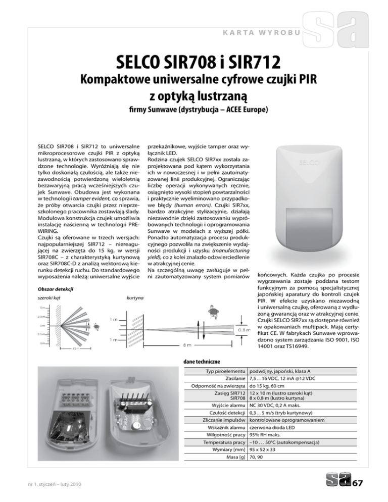 k a r ta w y r o b u SELCO SIR708 i SIR712 Kompaktowe uniwersalne cyfrowe czujki PIR z optyką lustrzaną firmy Sunwave (dystrybucja – ACEE Europe) SELCO SIR708 i SIR712 to uniwersalne mikroprocesorowe czujki PIR z optyką lustrzaną, w których zastosowano sprawdzone technologie. Wyróżniają się nie tylko doskonałą czułością, ale także niezawodnością potwierdzoną wieloletnią bezawaryjną pracą wcześniejszych czujek Sunwave. Obudowa jest wykonana w technologii tamper evident, co sprawia, że próby otwarcia czujki przez nieprzeszkolonego pracownika zostawiają ślady. Modułowa konstrukcja czujek umożliwia instalację naścienną w technologii PREWIRING. Czujki są oferowane w trzech wersjach: najpopularniejszej SIR712 – niereagującej na zwierzęta do 15 kg, w wersji SIR708C – z charakterystyką kurtynową oraz SIR708C-D z analizą wektorową kierunku detekcji ruchu. Do standardowego wyposażenia należą: uniwersalne wyjście przekaźnikowe, wyjście tamper oraz wyłącznik LED. Rodzina czujek SELCO SIR7xx została zaprojektowana pod kątem wykorzystania ich w nowoczesnej i w pełni zautomatyzowanej linii produkcyjnej. Ograniczając liczbę operacji wykonywanych ręcznie, osiągnięto wysoki stopień powtarzalności i praktycznie wyeliminowano przypadkowe błędy (human errors). Czujki SIR7xx, bardzo atrakcyjne stylizacyjnie, działają niezawodnie dzięki zastosowaniu wypróbowanych technologii i oprogramowania Sunwave w modelach z wyższej półki. Ponadto automatyzacja procesu produkcyjnego pozwoliła na zwiększenie wydajności produkcji i uzysku (manufacturing yield), co z kolei znalazło odzwierciedlenie w atrakcyjnej cenie. Na szczególną uwagę zasługuje w pełni zautomatyzowany system pomiarów Obszar detekcji szeroki kąt kurtyna końcowych. Każda czujka po procesie wygrzewania zostaje poddana testom funkcyjnym za pomocą specjalistycznej japońskiej aparatury do kontroli czujek PIR. W efekcie uzyskano niezawodną i uniwersalną czujkę, oferowaną z wydłużoną gwarancją oraz w atrakcyjnej cenie. Czujki SELCO SIR7xx są dostępne również w opakowaniach multipack. Mają certyfikat CE. W fabrykach Sunwave wprowadzono system zarządzania ISO 9001, ISO 14001 oraz TS16949. dane techniczne Typ piroelementu podwójny, japoński, klasa A Zasilanie 7,5 ... 16 VDC, 12 mA @12 VDC Odporność na zwierzęta do 15 kg, 60 cm Zasięg SIR712 12 x 10 m (lustro szeroki kąt) SIR708 8 x 0,8 m (lustro kurtyna) Wyjście alarmu NC 30 VDC, 0,2 A maks. Czułość detekcji 0,3 ... 5 m/s (tryb kurtynowy) Zliczanie impulsów kontrolowane oprogramowaniem Wskaźnik alarmu czerwona dioda LED Wilgotność pracy 95% RH maks. Temperatura pracy –10 … 50°C (autokompensacja) Wymiary [mm] 95 x 52 x 33 Masa [g] 70, 90 nr 1, styczeń – luty 2010 67