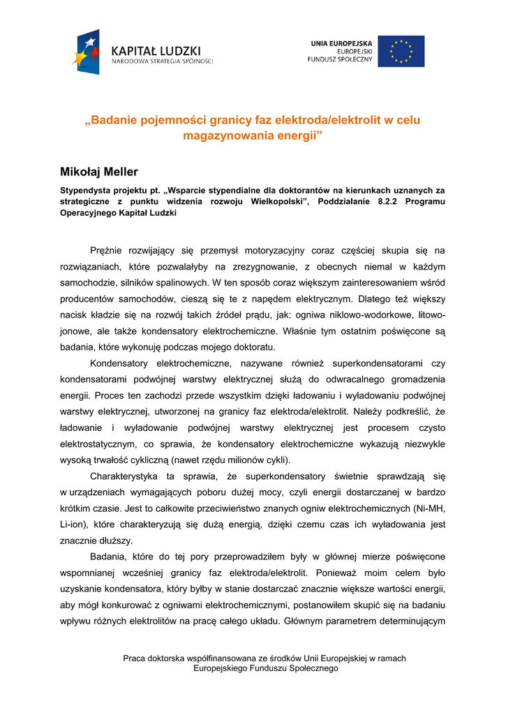 „Badanie pojemności granicy faz elektroda/elektrolit w celu magazynowania energii” Mikołaj Meller Stypendysta projektu pt. „Wsparcie stypendialne dla doktorantów na kierunkach uznanych za strategiczne z punktu widzenia rozwoju Wielkopolski”, Poddziałanie 8.2.2 Programu Operacyjnego Kapitał Ludzki Prężnie rozwijający się przemysł motoryzacyjny coraz częściej skupia się na rozwiązaniach, które pozwalałyby na zrezygnowanie, z obecnych niemal w każdym samochodzie, silników spalinowych. W ten sposób coraz większym zainteresowaniem wśród producentów samochodów, cieszą się te z napędem elektrycznym. Dlatego też większy nacisk kładzie się na rozwój takich źródeł prądu, jak: ogniwa niklowo-wodorkowe, litowojonowe, ale także kondensatory elektrochemiczne. Właśnie tym ostatnim poświęcone są badania, które wykonuję podczas mojego doktoratu. Kondensatory elektrochemiczne, nazywane również superkondensatorami czy kondensatorami podwójnej warstwy elektrycznej służą do odwracalnego gromadzenia energii. Proces ten zachodzi przede wszystkim dzięki ładowaniu i wyładowaniu podwójnej warstwy elektrycznej, utworzonej na granicy faz elektroda/elektrolit. Należy podkreślić, że ładowanie i wyładowanie podwójnej warstwy elektrycznej jest procesem czysto elektrostatycznym, co sprawia, że kondensatory elektrochemiczne wykazują niezwykle wysoką trwałość cykliczną (nawet rzędu milionów cykli). Charakterystyka ta sprawia, że superkondensatory świetnie sprawdzają się w urządzeniach wymagających poboru dużej mocy, czyli energii dostarczanej w bardzo krótkim czasie. Jest to całkowite przeciwieństwo znanych ogniw elektrochemicznych (Ni-MH, Li-ion), które charakteryzują się dużą energią, dzięki czemu czas ich wyładowania jest znacznie dłuższy. Badania, które do tej pory przeprowadziłem były w głównej mierze poświęcone wspomnianej wcześniej granicy faz elektroda/elektrolit. Ponieważ moim celem było uzyskanie kondensatora, który byłby w stanie dostarczać znacznie większe wartości energii, aby mógł konkurować z ogniwami elektrochemicznymi, postanowiłem skupić się na badaniu wpływu różnych elektrolitów na pracę całego układu. Głównym parametrem determinującym Praca doktorska współfinansowana ze środków Unii Europejskiej w ramach Europejskiego Funduszu Społecznego wielkość energii jest napięcie pracy kondensatora, zatem jego rozszerzenie pozwala na uzyskanie znacznie większych wartości energii. W tym celu można zastosować elektrolity organiczne, które pozwalają na rozszerzenie napięcia pracy nawet do 2,7 – 2,8V. Niestety ich użycie wiąże się z dużym ryzykiem, ponieważ są one łatwopalne i szkodliwe. Dodatkowym mankamentem jest konieczność stosowania specjalnych warunków ochronnych w fazie konstrukcyjnej superkondensatorów (komora rękawicowa) Oczywiście wiąże się z tym wszystkim znaczny wzrost ceny układu. Z kolei elektrolity wodne, które są znacznie bezpieczniejsze oraz tańsze, ze względu na elektrolizę wody, ograniczają w praktyce napięcie pracy kondensatora do wartości 0.7 – 0.8V. Jednakże przewaga korzyści płynąca ze stosowania elektrolitów wodnych skłoniła mnie do ich dokładnego przebadania. Wynikiem było uzyskanie kondensatora elektrochemicznego, który po odpowiednim przygotowaniu jest w stanie pracować w środowisku wodnym przy napięciu rozszerzonym nawet do 2.2V. Najlepszym elektrolitem okazał się 1mol/L Li2SO4, dający zadowalające wartości pojemności oraz energii i mogący pracować przez ponad 15000 cykli bez pogorszenia sprawności (99%). Dodatkowymi zaletami, przemawiającymi za użyciem tego elektrolitu są jego niska cena, obojętny charakter (ph = 7) pozwalający na użycie tanich kolektorów prądowych oraz co bardzo ważne, są bardziej przyjazne dla środowiska niż elektrolity organiczne. Należy pamiętać, że Wielkopolska jest województwem, w którym znaleźć można wiele firm i instytucji powiązanych z dziedziną elektrochemii. Daje to ogromne możliwości na współpracę przedsiębiorstw z sektorem nauki, której owocem byłoby wprowadzenie w życie zrealizowanych projektów i ich dalszą komercjalizację. Praca doktorska współfinansowana ze środków Unii Europejskiej w ramach Europejskiego Funduszu Społecznego