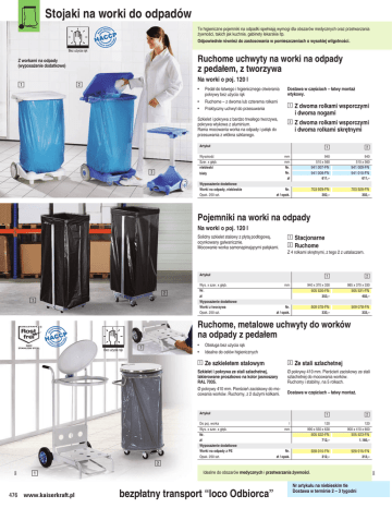 Stojaki na worki do odpadów Te higieniczne pojemniki na odpadki spełniają wymogi dla obszarów medycznych oraz przetwarzania żywności, takich jak kuchnie, gabinety lekarskie itp. Odpowiednie również do zastosowania w pomieszczeniach o wysokiej wilgotności. Bez użycia rąk Ruchome uchwyty na worki na odpady z pedałem, z tworzywa Z workami na odpady (wyposażenie dodatkowe) 1 Na worki o poj. 120 l 2 • Pedał do łatwego i higienicznego otwierania pokrywy bez użycia rąk • Ruchome – z dwoma lub czterema rolkami • Praktyczny uchwyt do przesuwania Szkielet i pokrywa z bardzo trwałego tworzywa, pokrywa wtykowa z aluminium. Rama mocowania worka na odpady i pałąk do przesuwania z włókna szklanego. Dostawa w częściach – łatwy montaż wtykowy. 1 Z dwoma rolkami wsporczymi i dwoma nogami 2 Z dwoma rolkami wsporczymi i dwoma rolkami skrętnymi Artykuł Wysokość Szer. x głęb. niebieski 2 mm mm Nr. Nr. zł biały Wyposażenie dodatkowe Worki na odpady, niebieskie Opak. 250 szt. Nr. zł / opak. 1 2 940 510 x 560 940 510 x 560 941 007-FN 941 008-FN 941 009-FN 941 010-FN 611,– 611,– 703 929-FN 703 929-FN 302,– 302,– Pojemniki na worki na odpady Na worki o poj. 120 l Solidny szkielet stalowy z płytą podłogową, ocynkowany galwanicznie. Mocowanie worka samonapinającymi pałąkami. 1 Stacjonarne 2 Ruchome Z 4 rolkami skrętnymi, z tego 2 z ustalaczem. Artykuł Wys. x szer. x głęb. Nr. zł Wyposażenie dodatkowe Worki z tworzywa Opak. 250 szt. 2 1 mm 1 2 940 x 370 x 330 985 x 370 x 330 505 520-FN 505 521-FN 353,– 402,– 509 078-FN 509 078-FN 333,– 333,– Nr. zł / opak. Ruchome, metalowe uchwyty do worków na odpady z pedałem Bez użycia rąk 1 • Obsługa bez użycia rąk • Idealne do celów higienicznych 1 Ze szkieletem stalowym 2 Ze stali szlachetnej Szkielet i pokrywa ze stali szlachetnej, lakierowane proszkowo na kolor jasnoszary RAL 7035. Ø pokrywy 410 mm. Pierścień zaciskowy do mocowania worków. Ruchomy, z 2 dużymi kółkami. Ø pokrywy 410 mm. Pierścień zaciskowy ze stali szlachetnej do mocowania worków. Ruchomy i stabilny, na 5 rolkach. Dostawa w częściach – łatwy montaż. Artykuł Do poj. worka Wys. x szer. x głęb. Nr. zł Wyposażenie dodatkowe Worki na odpady z PE Opak. 250 szt. l mm 1 2 120 990 x 550 x 630 120 900 x 410 x 600 505 522-FN 505 523-FN 712,– 1.160,– 928 015-FN 928 015-FN 312,– 312,– Nr. zł / opak. 1 476 www.kaiserkraft.pl Idealne do obszarów medycznych i przetwarzania żywności. bezpłatny transport “loco Odbiorca” Nr artykułu na niebieskim tle Dostawa w terminie 2 – 3 tygodni 2900 2900 2