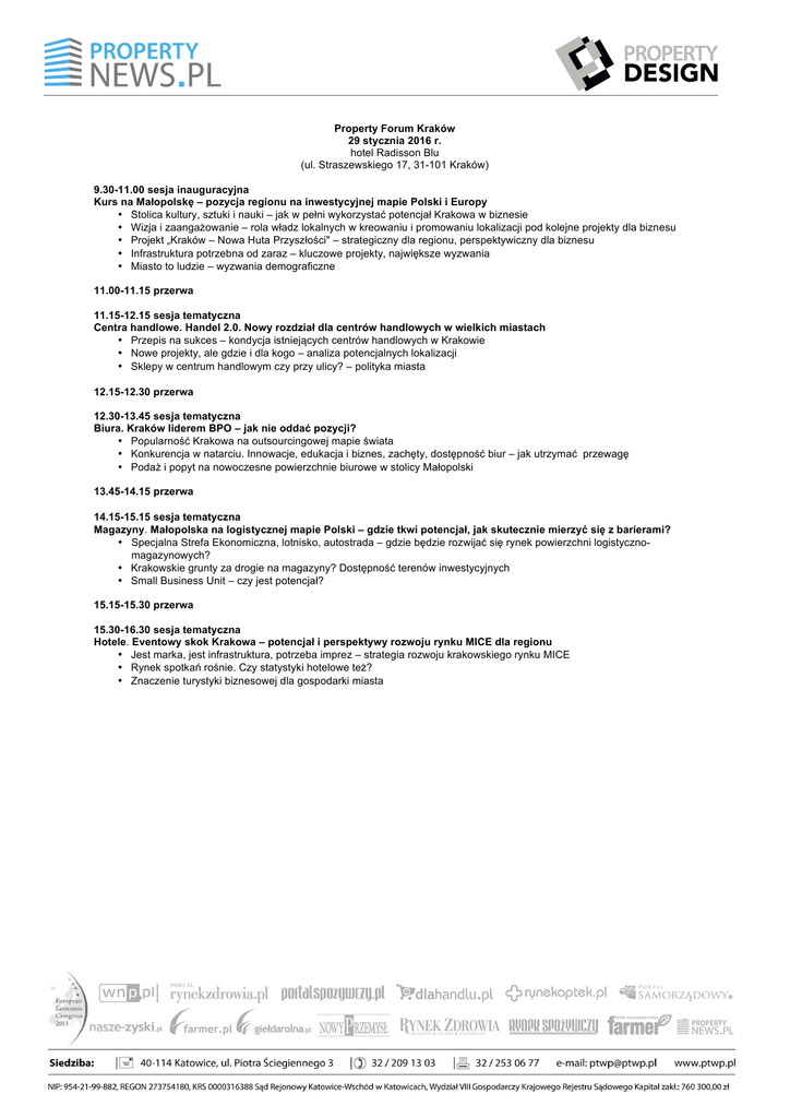 Property Forum Kraków 29 stycznia 2016 r. hotel Radisson Blu (ul. Straszewskiego 17, 31-101 Kraków) 9.30-11.00 sesja inauguracyjna Kurs na Małopolskę – pozycja regionu na inwestycyjnej mapie Polski i Europy • Stolica kultury, sztuki i nauki – jak w pełni wykorzystać potencjał Krakowa w biznesie • Wizja i zaangażowanie – rola władz lokalnych w kreowaniu i promowaniu lokalizacji pod kolejne projekty dla biznesu • Projekt „Kraków – Nowa Huta Przyszłości" – strategiczny dla regionu, perspektywiczny dla biznesu • Infrastruktura potrzebna od zaraz – kluczowe projekty, największe wyzwania • Miasto to ludzie – wyzwania demograficzne 11.00-11.15 przerwa 11.15-12.15 sesja tematyczna Centra handlowe. Handel 2.0. Nowy rozdział dla centrów handlowych w wielkich miastach • Przepis na sukces – kondycja istniejących centrów handlowych w Krakowie • Nowe projekty, ale gdzie i dla kogo – analiza potencjalnych lokalizacji • Sklepy w centrum handlowym czy przy ulicy? – polityka miasta 12.15-12.30 przerwa 12.30-13.45 sesja tematyczna Biura. Kraków liderem BPO – jak nie oddać pozycji? • Popularność Krakowa na outsourcingowej mapie świata • Konkurencja w natarciu. Innowacje, edukacja i biznes, zachęty, dostępność biur – jak utrzymać przewagę • Podaż i popyt na nowoczesne powierzchnie biurowe w stolicy Małopolski 13.45-14.15 przerwa 14.15-15.15 sesja tematyczna Magazyny. Małopolska na logistycznej mapie Polski – gdzie tkwi potencjał, jak skutecznie mierzyć się z barierami? • Specjalna Strefa Ekonomiczna, lotnisko, autostrada – gdzie będzie rozwijać się rynek powierzchni logistycznomagazynowych? • Krakowskie grunty za drogie na magazyny? Dostępność terenów inwestycyjnych • Small Business Unit – czy jest potencjał? 15.15-15.30 przerwa 15.30-16.30 sesja tematyczna Hotele. Eventowy skok Krakowa – potencjał i perspektywy rozwoju rynku MICE dla regionu • Jest marka, jest infrastruktura, potrzeba imprez – strategia rozwoju krakowskiego rynku MICE • Rynek spotkań rośnie. Czy statystyki hotelowe też? • Znaczenie turystyki biznesowej dla gospodarki miasta