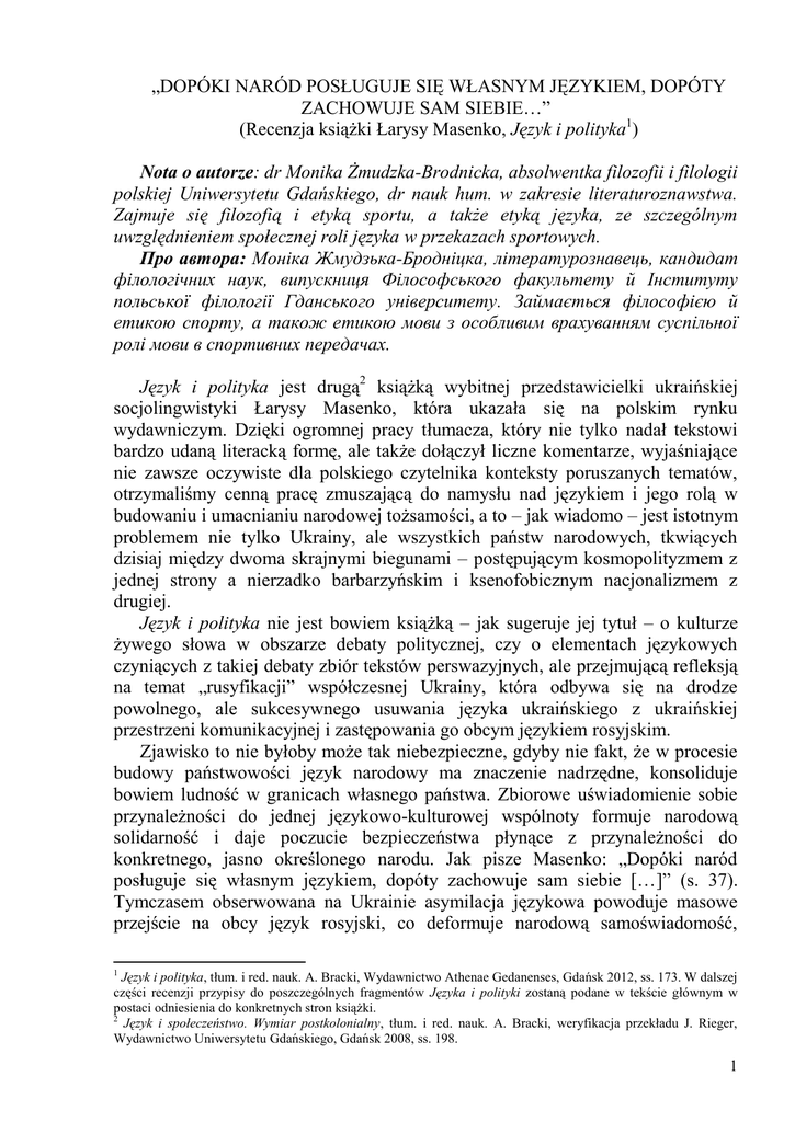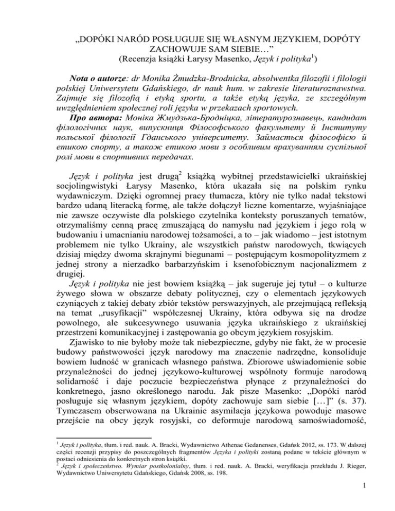 „DOPÓKI NARÓD POSŁUGUJE SIĘ WŁASNYM JĘZYKIEM, DOPÓTY ZACHOWUJE SAM SIEBIE…” (Recenzja książki Łarysy Masenko, Język i polityka1) Nota o autorze: dr Monika Żmudzka-Brodnicka, absolwentka filozofii i filologii polskiej Uniwersytetu Gdańskiego, dr nauk hum. w zakresie literaturoznawstwa. Zajmuje się filozofią i etyką sportu, a także etyką języka, ze szczególnym uwzględnieniem społecznej roli języka w przekazach sportowych. Про автора: Моніка Жмудзька-Бродніцка, літературознавець, кандидат філологічних наук, випускниця Філософського факультету й Інституту польської філології Гданського університету. Займається філософією й етикою спорту, а також етикою мови з особливим врахуванням суспільної ролі мови в спортивних передачах. Język i polityka jest drugą2 książką wybitnej przedstawicielki ukraińskiej socjolingwistyki Łarysy Masenko, która ukazała się na polskim rynku wydawniczym. Dzięki ogromnej pracy tłumacza, który nie tylko nadał tekstowi bardzo udaną literacką formę, ale także dołączył liczne komentarze, wyjaśniające nie zawsze oczywiste dla polskiego czytelnika konteksty poruszanych tematów, otrzymaliśmy cenną pracę zmuszającą do namysłu nad językiem i jego rolą w budowaniu i umacnianiu narodowej tożsamości, a to – jak wiadomo – jest istotnym problemem nie tylko Ukrainy, ale wszystkich państw narodowych, tkwiących dzisiaj między dwoma skrajnymi biegunami – postępującym kosmopolityzmem z jednej strony a nierzadko barbarzyńskim i ksenofobicznym nacjonalizmem z drugiej. Język i polityka nie jest bowiem książką – jak sugeruje jej tytuł – o kulturze żywego słowa w obszarze debaty politycznej, czy o elementach językowych czyniących z takiej debaty zbiór tekstów perswazyjnych, ale przejmującą refleksją na temat „rusyfikacji” współczesnej Ukrainy, która odbywa się na drodze powolnego, ale sukcesywnego usuwania języka ukraińskiego z ukraińskiej przestrzeni komunikacyjnej i zastępowania go obcym językiem rosyjskim. Zjawisko to nie byłoby może tak niebezpieczne, gdyby nie fakt, że w procesie budowy państwowości język narodowy ma znaczenie nadrzędne, konsoliduje bowiem ludność w granicach własnego państwa. Zbiorowe uświadomienie sobie przynależności do jednej językowo-kulturowej wspólnoty formuje narodową solidarność i daje poczucie bezpieczeństwa płynące z przynależności do konkretnego, jasno określonego narodu. Jak pisze Masenko: „Dopóki naród posługuje się własnym językiem, dopóty zachowuje sam siebie […]” (s. 37). Tymczasem obserwowana na Ukrainie asymilacja językowa powoduje masowe przejście na obcy język rosyjski, co deformuje narodową samoświadomość, 1 Język i polityka, tłum. i red. nauk. A. Bracki, Wydawnictwo Athenae Gedanenses, Gdańsk 2012, ss. 173. W dalszej części recenzji przypisy do poszczególnych fragmentów Języka i polityki zostaną podane w tekście głównym w postaci odniesienia do konkretnych stron książki. 2 Język i społeczeństwo. Wymiar postkolonialny, tłum. i red. nauk. A. Bracki, weryfikacja przekładu J. Rieger, Wydawnictwo Uniwersytetu Gdańskiego, Gdańsk 2008, ss. 198. 1 nieuchronnie osłabiając niewidzialne więzi duchowe narodu z własną ziemią. Jaki będzie tego skutek? Autorka Języka i polityki odpowiada na to pytanie jednym, ale jakże przejmującym zdaniem: „Kraj, w którym panuje język i kultura byłego kolonizatora nie będzie rozwijał się tak jak kraj niepodległy, tylko jak kraj postkolonialny” (s. 12). Przyczyną współczesnej „niewymuszonej rusyfikacji” Ukrainy jest dwujęzyczność (biligwizm) jej mieszkańców. Zjawisko to – szczegółowo opisane w rozdziale pierwszym książki pt. „Czym jest masowa dwujęzyczność?” – autorka rozumie jako naprzemienne używanie dwóch języków. Istotne jest jednak odróżnienie bilingwizmu indywidualnego od masowego (totalnego). O ile bowiem bilingwizm indywidualny wzbogaca człowieka i czyni go pośrednikiem między kulturą obcą i swoją, o tyle bilingwizm masowy staje się dla wspólnoty narodowej zagrożeniem. Dzieje się tak wówczas, gdy obcy język (w tym przypadku rosyjski) przejmuje wszystkie funkcje języka rodzimego, wskutek czego języki, którymi posługuje się osoba dwujęzyczna tracą jednakowy status – jeden z nich staje się dominujący, a drugi podrzędny. Jak pisze Masenko: „Język dominujący wypiera ten podporządkowany wprost proporcjonalnie do objętości informacji, przekazywanej za pośrednictwem owych języków, i odwrotnie proporcjonalnie do zróżnicowania strukturalnego języków, co oznacza, że bliskość genetyczna struktury języka podporządkowanego ułatwia językowi dominującemu reces wchłaniania tego pierwszego” (s. 24–25). Dwujęzyczność Ukraińców, będąca – niestety – etapem przejściowym ku rosyjskiej jednojęzyczności, jest – jak dowodzi Autorka – wynikiem asymilacji wynikającej z polityki językowej Rosji wobec nierosyjskich narodów Związku Radzieckiego. Czym jest asymilacja? W rozdziale „Język i świadomość” autorka wyjaśnia: „Asymilować naród znaczy tyle, co zmuszać go do odejścia od własnego języka, zwyczajów, tradycyjnej kultury, czyli przymuszać, by przestał być sobą, upodobnił się do narodu-kolonizatora i w ostatecznym rozrachunku rozpłynął się w tamtym narodzie” (s. 55). Na Ukrainie owo przymuszanie nie odbywa się jednak siłą, ale – można by rzec – sposobem. Ukraińcy mają pokochać język rosyjski, mają uznać go za swój. Język rosyjski dominuje więc w kontaktach naukowych, płynie z głośników kinowych, dobrze się ma na scenach teatrów. Także w wydawnict