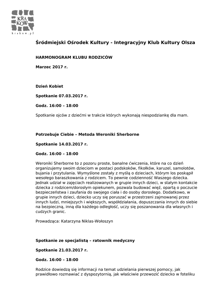 Śródmiejski Ośrodek Kultury - Integracyjny Klub Kultury Olsza HARMONOGRAM KLUBU RODZICÓW Marzec 2017 r. Dzień Kobiet Spotkanie 07.03.2017 r. Godz. 16:00 – 18:00 Spotkanie ojców z dziećmi w trakcie których wykonają niespodziankę dla mam. Potrzebuje Ciebie – Metoda Weroniki Sherborne Spotkanie 14.03.2017 r. Godz. 16:00 – 18:00 Weroniki Sherborne to z pozoru proste, banalne ćwiczenia, które na co dzień organizujemy swoim dzieciom w postaci podskoków, fikołków, karuzel, samolotów, bujania i przytulania. Wymyślone zostały z myślą o dzieciach, którym los poskąpił wesołego baraszkowania z rodzicem. To pewnie codzienność Waszego dziecka. Jednak udział w zajęciach realizowanych w grupie innych dzieci, w stałym kontakcie dziecka z rodzicem/dorosłym opiekunem, pozwala budować więź, opartą o poczucie bezpieczeństwa i zaufania do swojego ciała i do osoby dorosłego. Dodatkowo, w grupie innych dzieci, dziecko uczy się poruszać w przestrzeni zajmowanej przez innych ludzi, mniejszych i większych, współdziałania, dopuszczania innych do siebie na bezpieczną, inną dla każdego odległość, uczy się poszanowania dla własnych i cudzych granic. Prowadząca: Katarzyna Niklas-Wołoszyn Spotkanie ze specjalistą – ratownik medyczny Spotkanie 21.03.2017 r. Godz. 16:00 – 18:00 Rodzice dowiedzą się informacji na temat udzielania pierwszej pomocy, jak prawidłowo rozmawiać z dyspozytornią, jak właściwie przewozić dziecko w foteliku samochodem. Prowadzący: Szymon Królik KONTAKT: Integracyjny Klub Kultury Olsza ul. Stanisława ze Skalbmierza 7 31-436 Kraków tel. 12 446 73 18 [email protected] https://www.facebook.com/IKOlsza/ Powered by TCPDF (www.tcpdf.org)