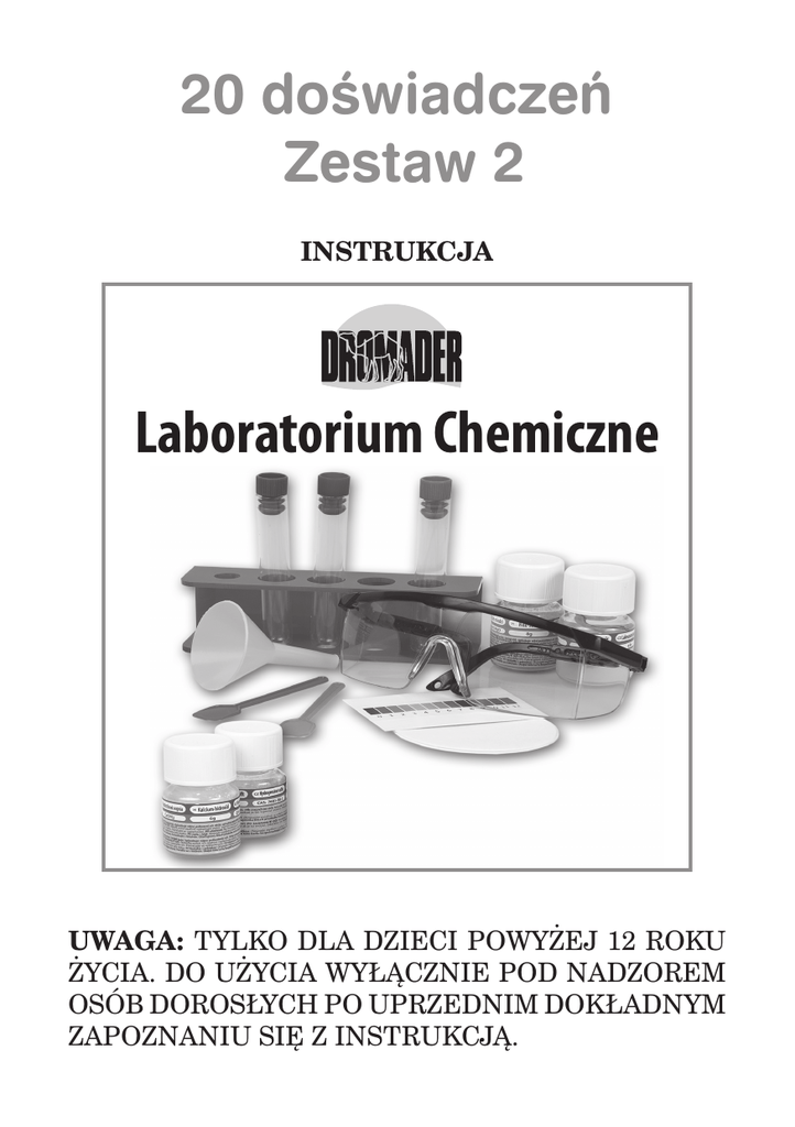 20 doÊwiadczeƒ Zestaw 2 INSTRUKCJA Laboratorium Chemiczne UWAGA: TYLKO DLA DZIECI POWY˚EJ 12 ROKU ˚YCIA. DO U˚YCIA WY¸ÑCZNIE POD NADZOREM OSÓB DOROS¸YCH PO UPRZEDNIM DOK¸ADNYM ZAPOZNANIU SI¢ Z INSTRUKCJÑ. Ogólne zasady udzielania pierwszej pomocy medycznej • W przypadku przedostania si´ substancji chemicznej do oka - otwarte oko przemyj du˝à iloÊcià wody. Zg∏oÊ si´ natychmiast do lekarza. • W przypadku po∏kni´cia substancji chemicznej - wyp∏ucz usta wodà, daj wod´ do wypicia. Nie wywo∏uj wymiotów. Zg∏oÊ si´ natychmiast do lekarza. • W przypadku zatrucia wziewnego - wyprowadê osob´ na Êwie˝e powietrze. • W przypadku kontaktu substancji chemicznej ze skórà lub oparzeƒ - przemywaj wodà miejsce kontaktu przez pi´ç minut. • W przypadku jakichkolwiek wàtpliwoÊci - zg∏oÊ si´ niezw∏ocznie do lekarza.Weê ze sobà pojemnik wraz z podejrzanà substancja chemicznà. UTYLIZACJA ODCZYNNIKÓW CHEMICZNYCH MUSI BYå PRZEPROWADZANA ZGODNIE Z OBOWIÑZUJÑCYMI PRZEPISAMI DORAèNA POMOC LEKARSKA PROSIMY OSOBY NADZORUJÑCE DZIECI PRZY PRZEPROWADZANIU EKSPERYMENTÓW O ZAPISANIE W PONI˚SZEJ RAMCE NUMERU TELEFONU DO DORAèNEJ POMOCY LEKARSKIEJ, Z KTÓREGO MO˚NA B¢DZIE SKORZYSTAå W RAZIE KONIECZNOÂCI. Twoje LABORATORIUM CHEMICZNE Zestaw „Laboratorium Chemiczne”, pozwoli Ci poznaç tajniki chemii i odkryç mnóstwo ciekawych substancji chemicznych, tak˝e tych znajdujàcych si´ w Twoim otoczeniu. Poprzez zmieszanie ró˝nych zwiàzków chemicznych b´dziesz otrzymywaç nowe substancje, uczàc si´ przy okazji o zachodzàcych reakcjach chemicznych. Pami´taj, najlepsze wyniki osiàgniesz przeprowadzajàc doÊwiadczenia samodzielnie i uwa˝nie obserwujàc zachodzàce reakcje. Kto wie, mo˝e te poczàtki doprowadzà ci´ kiedyÊ do wielkich odkryç. Prowadê dokumentacj´ swoich eksperymentów, zapisuj co robisz, co zaobserwowa∏eÊ i jaki uzyska∏eÊ rezultat. Pami´taj, przed rozpocz´ciem doÊwiadczeƒ zapoznaj si´ koniecznie ze Êrodkami ostro˝noÊci zawartymi w Rozdziale 1. Pomo˝e Ci to uchroniç si´ od niebezpiecznego wypadku. Zorganizuj swoje ma∏e laboratorium. Na poczàtek mo˝e to byç stary stó∏ w gara˝u lub w warsztacie. Szczegó∏owo dowiesz si´ jak to zrobiç w Rozdziale 2 i 3. Tam te˝ opisane jest w jaki sposób przeprowadzaç eksperymenty. W miar´ nabywanego doÊwiadczenia dowiesz si´, ˝e praktyczne zastosowanie wiedzy chemicznej jest niezwykle kreatywne i polega na tworzeniu zupe∏nie nowych substancji: tworzyw sztucznych, syntetycznego kauczuku, w∏ókien, lekarstw, farb, barwników itp. I chocia˝ niektóre reakcje chemiczne przypominajà magiczne sztuczki, to w rzeczywistoÊci z wykorzystaniem tego zestawu odkryjesz ich prawdziwà, naukowà natur´. 2 SPIS TREÂCI Str. ZAWARTOÂå ZESTAWU. . . . . . . . . . . . . . . . . . . . . . . . . . . . . . . . . . . . . . . . . . . . . 4 Rozdzia∏ 1 Ârodki bezpieczeƒstwa. . . . . . . . . . . . . . . . . . . . . . . . . . . . . . . . . . . 6 Rozdzia∏ 2 Jak urzàdziç swoje laboratorium. . . . . . . . . . . . . . . . . . . . . . . . . . 8 Rozdzia∏ 3 Jak przeprowadzaç doÊwiadczenia. . . . . . . . . . . . . . . . . . . . . . . . 9 Rozdzia∏ 4 DoÊwiadczenia. . . . . . . . . . . . . . . . . . . . . . . . . . . . . . . . . . . . . . . . . . 11 Pierwsze kroki - proste doÊwiadczenia. . . . . . . . . . . . . . . . . . . . . . . . 12 Kwasy i zasady. . . . . . . . . . . . . . . . . . . . . . . . . . . . . . . . . . . . . . . . . . . 13 Kwasy i zasady - neutralizacja. . . . . . . . . . . . . . . . . . . . . . . . . . . . . . . 14 Sole . . . . . . . . . . . . . . . . . . . . . . . . . . . . . . . . . . . . . . . . . . . . . . . . . . . . 15 Oznaczanie i rozdzielanie substancji. . . . . . . . . . . . . . . . . . . . . . . . . . 15 Zele . . . . . . . . . . . . . . . . . . . . . . . . . . . . . . . . . . . . . . . . . . . . . . . . . . . . 17 Barwniki. . . . . . . . . . . . . . . . . . . . . . . . . . . . . . . . . . . . . . . . . . . . . . . . 17 Notatki . . . . . . . . . . . . . . . . . . . . . . . . . . . . . . . . . . . . . . . . . . . . . . . . . . . . . . . . 18 S∏owniczek nazw chemicznych. . . . . . . . . . . . . . . . . . . . . . . . . . . . . . . . . . . . . . . . . 21 Uk∏ad okresowy pierwiastków . . . . . . . . . . . . . . . . . . . . . . . . . . . . . . . . . . . . . . . . . 23 UWAGA: DoÊwiadczenia nale˝y przeprowadzaç w dobrze wentylowanym miejscu. Jest to szczególnie istotne w przypadku reakcji chemicznych, podczas których powstawaç mogà wyziewy. 3 ZAWARTOÂå ZESTAWU 3 odczynniki chemiczne ODCZYNNIKI kwaÊny siarczan sodu CAS: 7681-38-1 siarczan miedzi CAS: 7758-99-8 wodorotlenek wapnia CAS: 1305-62-0 WE: 231-665-7 WE: 231-847-6 WE: 215-137-3 Inne elementy zestawu: Probówki – 3szt Stojak do probówek– 1szt Łyżeczki do odmierzania substancji – 2szt Okulary ochronne– 1szt Papierki lakmusowe (długie paski) – 6szt Filtr papierowy – 5szt Korek bez otworu – 3szt Lejek – 1szt Instrukcja – 1szt Lista substancji stosowanych w gospodarstwie domowym. Istnieje wiele substancji stosowanych na codzieƒ w gospodarstwie domowym, które z powodzeniem mogà zostaç u˝yte do doÊwiadczeƒ. Niektóre z nich sà potrzebne do eksperymentów opisanych w instrukcji. alkohol (etanol), atrament, balonik, barwniki spożywcze, benzyna lakowa, butelka, cukier (sacharoza), drut miedziany, folia aluminiowa, gwóźdź, jedwab, kwasek cytrynowy, lupa lub mikroskop, mydło, nylon, ocet (kwas octowy), olej, soda oczyszczona (wodorowęglan sodu), sok z cytryny, sól kuchenna (chlorek sodu), świeczka lub „tea light”, wełna Potrzebna jest też pęseta którą wygodnie można trzymać przygotowane wcześniej odcięte kałwałki papierków lakmusowych podczas badania doświadczeń. 4 BEZPIECZE¡STWO UWAGI DLA OSÓB NADZORUJÑCYCH DZIECI PODCZAS DOÂWIADCZE¡ • Zestaw przeznaczony jest dla dzieci od 12 roku ˝ycia. • Przeczytaj i stosuj zasady bezpiecz