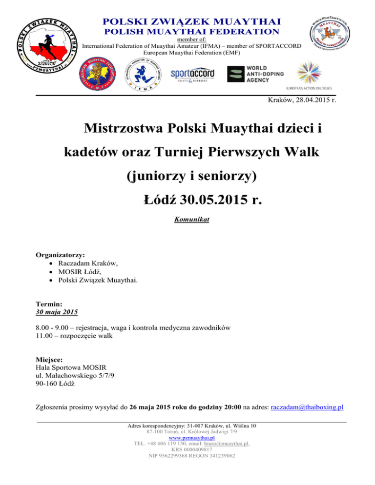 POLSKI ZWIĄZEK MUAYTHAI POLISH MUAYTHAI FEDERATION member of: International Federation of Muaythai Amateur (IFMA) – member of SPORTACCORD European Muaythai Federation (EMF) Kraków, 28.04.2015 r. Mistrzostwa Polski Muaythai dzieci i kadetów oraz Turniej Pierwszych Walk (juniorzy i seniorzy) Łódź 30.05.2015 r. Komunikat Organizatorzy: Raczadam Kraków, MOSIR Łódź, Polski Związek Muaythai. Termin: 30 maja 2015 8.00 - 9.00 – rejestracja, waga i kontrola medyczna zawodników 11.00 – rozpoczęcie walk Miejsce: Hala Sportowa MOSIR ul. Małachowskiego 5/7/9 90-160 Łódź Zgłoszenia prosimy wysyłać do 26 maja 2015 roku do godziny 20:00 na adres: [email protected] __________________________________________________________________________________ Adres korespondencyjny: 31-007 Kraków, ul. Wiślna 10 87-100 Toruń, ul. Królowej Jadwigi 7/9 www.pzmuaythai.pl TEL. +48 606 119 150, email: [email protected], KRS 0000409817 NIP 9562299368 REGON 341239062 Ilość miejsc na Turnieju Pierwszych walk z uwagi na odbywające się Mistrzostwa Polski dzieci i kadetów jest OGRANICZONA. Decyduje data zgłoszenia. Kontakt: Dawid Zięba 606-119-150 [email protected] Zgłoszenia: Zainteresowane startem kluby prosimy o zgłaszanie drogą mailową swoich zawodników, podając w mailu informacje według poniższego schematu: Mistrzostwa Polski Muaythai dzieci i kadetów oraz Turniej Pierwszych Walk (juniorzy i seniorzy) Imię i nazwisko - klub - kategoria wiekowa (oraz data urodzenia – KONIECZNIE!) - kategoria wagowa ilość stoczonych walk z dopiskiem Mistrzostwa Polski lub TPW UWAGA ! Podanie daty urodzenia jest obowiązkowe WAŻNE: 1. Sprzęt ochronny do walki zapewnia organizator. 2. Zawodnik musi posiadać - spodenki, koszulkę na ramiączkach (niebieską i czerwoną), ochraniacz krocza (metalowy), ochraniacz szczęki, bandaże bokserskie (bawełniane, zakaz używania plastrów!). Koszulki tylko na ramiączkach! ochraniacz krocza TYLKO METALOWE - wiązane (zgodnie z przepisami IFMA) obowiązkowy mongkom - WŁASNY (klubowy) Proszę pamiętać że warunkiem udziału w turnieju jest: - posiadanie książeczki sportowo-lekarskiej lub zaświadczenia od lekarza sportowego z aktualnymi badaniami z wpisem „zdolny do treningów i startów w zawodach w dyscyplinie muaythai”, - ubezpieczenie NNW z datą ważności pokrywającą się z datą turnieju, - w przypadku zawodników i zawodniczek niepełnoletnich podpisana zgoda rodziców do udziału w turnieju, - wypełniony formularz zgłoszeniowy (posiadany przy rejestracji), - w przypadku zawodników zrzeszonych posiadanie licencji na dany rok kalendarzowy (możliwość wykupienia na miejscu koszt 30zł/rok), - w przypadku zawodników niezrzeszonych wykupienie na miejscu licencji jednorazowej koszt 30 zł, - dokonana opłata startowa: 50 zł zrzeszeni / 100 zł niezrzeszeni Mistrzostwa Polski, 30 zł Turniej Pierwszych Walk, - w przypadku braku sędziego powołanego na zawody klub uiszcza opłatę w wysokości 100 zł. Poniżej link do formularzy, które należy mieć uzupełnione ze sobą w dniu ważenia i rejestracji do pobrania pliki Dla Juniora i dla Seniora. __________________________________________________________________________________ Adres korespondencyjny: 31-007 Kraków, ul. Wiślna 10 87-100 Toruń, ul. Królowej Jadwigi 7/9 www.pzmuaythai.pl TEL. +48 606 119 150, email: [email protected], KRS 0000409817 NIP 9562299368 REGON 341239062