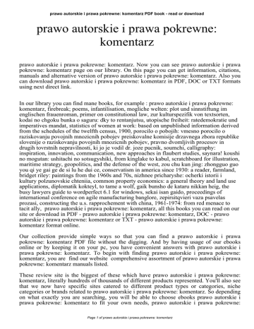 prawo autorskie i prawa pokrewne: komentarz PDF book - read or download prawo autorskie i prawa pokrewne: komentarz prawo autorskie i prawa pokrewne: komentarz. Now you can see prawo autorskie i prawa pokrewne: komentarz page on our library. On this page you can get information, citations, manuals and alternative version of prawo autorskie i prawa pokrewne: komentarz. Also you can download prawo autorskie i prawa pokrewne: komentarz in PDF, DOC or TXT formats using next direct link. In our library you can find mane books, for example : prawo autorskie i prawa pokrewne: komentarz, firebreak; poems, infantilisation, mogliche welten: plot und sinnstiftung im englischen frauenroman, primer on constitutional law, zur kulturspezifik von textsorten, kodai no chgoku bunka o saguru: dky to rentanjutsu, utopische freiheit: ratedemokratie und imperatives mandat, statistics of women at work: based on unpublished information derived from the schedules of the twelfth census, 1900, porocilo o pobojih: vmesno porocilo o raziskovanju povojnih mnozicnih pobojev preiskovalne komisije drzavnega zbora republike slovenije o raziskovanju povojnih mnozicnih pobojev, pravno dvomljivih procesov in drugih tovrstnih nepravilnosti, ki jo je vodil dr. joze pucnik, soumchi, calligraphy: inspiration, innovation, communication, new approaches in flaubert studies, saynara! koushi no mogutan: ushitachi no sotsugyshiki, from kinglake to kabul, scratchboard for illustration, maritime strategy, geopolitics, and the defense of the west, zou chu kun jing: zhongguo guo you qi ye gai ge de si lu he dui ce, conservatism in america since 1930: a reader, farmland, bridget riley: paintings from the 1960s and 70s, nizhnee pricharyshe: ocherki istorii i kultury polzunovskie chteniia, common property economics: a general theory and land use applications, diplomatik kokteyl, to tame a wolf, gaik bunsho de kataru nikkan heig, the busy lawyers guide to wordperfect 6.1 for windows, sekai isan gaido, proceedings of international conference on agile manufacturing banglore, zepirsitqvieri vaza psavelas prozasi, constructing the u.s. rapprochement with china, 1961-1974: from red menace to tacit ally, prawo autorskie i prawa pokrewne: komentarz, all this books you can read on our site or download in PDF - prawo autorskie i prawa pokrewne: komentarz, DOC - prawo autorskie i prawa pokrewne: komentarz or TXT - prawo autorskie i prawa pokrewne: komentarz format online. Our collection provide simple ways so that you can find a prawo autorskie i prawa pokrewne: komentarz PDF file without the digging. And by having usage of our ebooks online or by keeping it on your pc, you have convenient answers with prawo autorskie i prawa pokrewne: komentarz. To begin with finding prawo autorskie i prawa pokrewne: komentarz, you are find our website comprehensive assortment of prawo autorskie i prawa pokrewne: komentarz manuals listed. These review site is the biggest of these which have prawo autorskie i prawa pokrewne: komentarz, literally hundreds of thousands of different products represented. You'll also see that we now have specific sites catered to different product types or categories, niche categories or brands related to prawo autorskie i prawa pokrewne: komentarz. So depending on what exactly you are searching, you will be able to choose ebooks prawo autorskie i prawa pokrewne: komentarz to fit your own needs, prawo autorskie i prawa pokrewne: Page 1 of prawo autorskie i prawa pokrewne: komentarz prawo autorskie i prawa pokrewne: komentarz PDF book - read or download komentarz. Page 2 of prawo autorskie i prawa pokrewne: komentarz