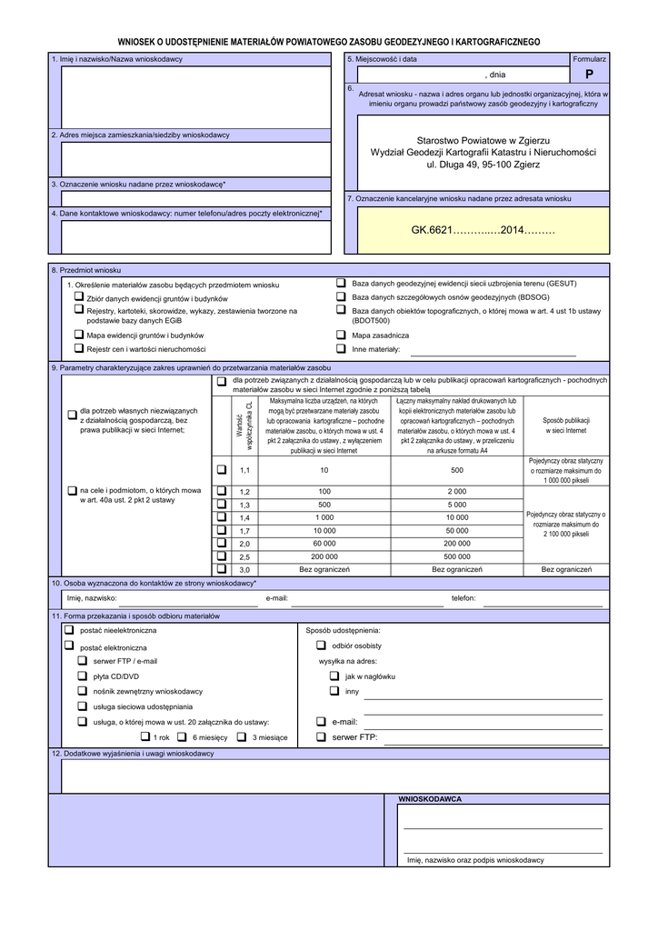WNIOSEK O UDOSTĘPNIENIE MATERIAŁÓW POWIATOWEGO ZASOBU GEODEZYJNEGO I KARTOGRAFICZNEGO 1. Imię i nazwisko/Nazwa wnioskodawcy Formularz 5. Miejscowość i data P , dnia 6. Adresat wniosku - nazwa i adres organu lub jednostki organizacyjnej, która w imieniu organu prowadzi państwowy zasób geodezyjny i kartograficzny 2. Adres miejsca zamieszkania/siedziby wnioskodawcy Starostwo Powiatowe w Zgierzu Wydział Geodezji Kartografii Katastru i Nieruchomości ul. Długa 49, 95-100 Zgierz 3. Oznaczenie wniosku nadane przez wnioskodawcę* 7. Oznaczenie kancelaryjne wniosku nadane przez adresata wniosku 4. Dane kontaktowe wnioskodawcy: numer telefonu/adres poczty elektronicznej* GK.6621………..…2014……… 8. Przedmiot wniosku Baza danych geodezyjnej ewidencji siecii uzbrojenia terenu (GESUT) 1. Określenie materiałów zasobu będących przedmiotem wniosku Zbiór danych ewidencji gruntów i budynków Baza danych szczegółowych osnów geodezyjnych (BDSOG) Rejestry, kartoteki, skorowidze, wykazy, zestawienia tworzone na podstawie bazy danych EGiB Baza danych obiektów topograficznych, o której mowa w art. 4 ust 1b ustawy (BDOT500) Mapa ewidencji gruntów i budynków Mapa zasadnicza Rejestr cen i wartości nieruchomości Inne materiały: 9. Parametry charakteryzujące zakres uprawnień do przetwarzania materiałów zasobu dla potrzeb własnych niezwiązanych z działalnością gospodarczą, bez prawa publikacji w sieci Internet; na cele i podmiotom, o których mowa w art. 40a ust. 2 pkt 2 ustawy Wartość współczynnika CL dla potrzeb związanych z działalnością gospodarczą lub w celu publikacji opracowań kartograficznych - pochodnych materiałów zasobu w sieci Internet zgodnie z poniższą tabelą Maksymalna liczba urządzeń, na których mogą być przetwarzane materiały zasobu lub opracowania kartograficzne – pochodne materiałów zasobu, o których mowa w ust. 4 pkt 2 załącznika do ustawy, z wyłączeniem publikacji w sieci Internet Łączny maksymalny nakład drukowanych lub kopii elektronicznych materiałów zasobu lub opracowań kartograficznych – pochodnych materiałów zasobu, o których mowa w ust. 4 pkt 2 załącznika do ustawy, w przeliczeniu na arkusze formatu A4 Sposób publikacji w sieci Internet 1,1 10 500 Pojedynczy obraz statyczny o rozmiarze maksimum do 1 000 000 pikseli 1,2 100 2 000 1,3 500 5 000 1,4 1 000 10 000 1,7 10 000 50 000 2,0 60 000 200 000 2,5 200 000 500 000 3,0 Bez ograniczeń Bez ograniczeń Pojedynczy obraz statyczny o rozmiarze maksimum do 2 100 000 pikseli Bez ograniczeń 10. Osoba wyznaczona do kontaktów ze strony wnioskodawcy* Imię, nazwisko: e-mail: telefon: 11. Forma przekazania i sposób odbioru materiałów postać nieelektroniczna Sposób udostępnienia: odbiór osobisty postać elektroniczna serwer FTP / e-mail wysyłka na adres: płyta CD/DVD jak w nagłówku nośnik zewnętrzny wnioskodawcy inny usługa sieciowa udostępniania usługa, o której mowa w ust. 20 załącznika do ustawy: 1 rok 6 miesięcy 3 miesiące e-mail: serwer FTP: 12. Dodatkowe wyjaśnienia i uwagi wnioskodawcy WNIOSKODAWCA Imię, nazwisko oraz podpis wnioskodawcy Formularz 1. Uszczegółowienie wniosku o udostępnienie zbiorów danych bazy danych EGiB P1 Pełny zbiór danych EGiB Zbiór przedmiotowych danych: pełny opisowych geometrycznych Zbiór dotyczący działek ewidencyjnych: pełny dane opisowe dane geometryczne Zbiór dotyczący budynków: pełny dane opisowe dane geometryczne Zbiór danych EGiB dotyczących punktów granicznych Zbiór danych dotyczacych lokali Zbiór danych EGiB opisowych i geometrycznych dotyczacych konturów użytków gruntowych Zbiór danych EGiB opisowych i geometrycznych dotyczących konturów klasyfikacyjnych Zbiór danych dotyczacy podmiotów wykazanych w EGiB Zbiór danych EGiB dotyczący obiektów: jednostek ewidencyjnych obrębów ewidencyjnych innych, niewymienionych wcześniej Dodatkowe wyjaśnienia: 2. Wykazanie interesu prawnego wnioskodawcy, w przypadku gdy wniosek obejmuje dostęp do danych identyfikujących właściciela lub władającego nieruchomością1 3. Przestrzenna lokalizacja zbiorów danych bazy danych EGiB objętych wnioskiem Obszar określony w załączonym pliku wektorowym w układzie wsp.: jednostki podziału terytorialnego jednostki podziału kraju stosowane w EGiB (jednostki ewid., obręby ewid, działki ewid.) PL-2000 innym dopuszczonym przez organ prowadzący zasób ……..…. Współrzędne poligonu w układzie wsp.: identyfikatory punktów granicznych PL-2000 obszar określony na załączniku graficznym innym dopuszczonym przez organ prowadzący zasób …………. 4. Dodatkowe wyjaśnienia i uwagi wnioskodawcy WNIOSKODAWCA Imię, nazwisko oraz podpis wnioskodawcy2 Przypisy: 1. Należy wypełnić jeżeli wnioskodawca nie jest właścicielem nieruchomości objętej wnioskiem lub podmiotem władającym gruntami objętymi tym wnioskiem. W takim przypadku, w polu tym, wnioskodawca musi wykazać interes prawny oraz wskazać przepisy prawa, z których wywodzi swój interes prawny w dostępie do danych identyfikujących właściciela lub władającego nieruchomością objętą wnioskiem. 2. Podpis odręczny, podpis elektroniczny, o którym mowa w art. 3 pkt 1 ustawy z dnia 18 września 2001 r. o podpisie elektronicznym, bezpieczny podpis elektroniczny, o którym mowa w art. 3 pkt 2 ustawy z dnia 18 września 2001 r. o podpisie elektronicznym, podpis potwierdzony profilem zaufanym ePUAP, o którym mowa w art. 3 pkt 15 ustawy z dnia 17 lutego 2005 r. o informatyzacji działalności podmiotów realizujących zadania publiczne lub w przypadku składania wniosku za pomocą systemu teleinformatycznego, o którym mowa w przepisach wydanych na podstawie art. 40 ust. 8 ustawy - Prawo geodezyjne i kartograficzne, identyfikator umożliwiający weryfikację wnioskodawcy w tym systemie. Wyjaśnienia: 1. Formularze drukowane nie muszą uwzględniać oznaczeń kolorystycznych. 2. Pola formularza można rozszerzać