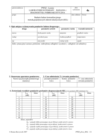 sprawozdawca PWSZ - Leszno LABORATORIUM POMIARY , BADANIA i DIAGNOSTYKA WIBROAKUSTYCZNA grupa data wykonania data oddania 4s Ocena Badanie hałasu komunikacyjnego metodą pojedynczych zdarzeń akustycznych (SEL) 1. Opis miejsce wykonywania pomiarów hałasu drogowego : droga parametry arterii parametry ruchu warunki meteorol. nazwa liczba pasów ruchu natęŜenie prędkość wiatru rodzaj szerokość pasa średnia prędkość temperatura typ stan jezdni rodzaj ruchu opady Szkic sytuacyjny( zaznacz połoŜenie mikrofonu) odległość wysokość ) odległość od zabudowy 2. Stosowana aparatura pomiarowa Nazwa typ przyrządu pomiarowego (nastawy) 3. Czas odniesienia T ( trwania pomiarów) początek pomiarów h:m:s Koniec pomiarów h:m:s T - czas odniesienia (trwania pomiarów) 4. Zestawienie wyników pomiarów poziomów ekspozycyjnych SEL (czas pomiaru SEL minimum 6 s) LAE [dB] 1 2 3 4 5 6 7 8 9 10 klasa LAE [dB] 11 12 13 14 15 16 17 18 19 20 klasa LAE [dB] klasa 21 22 23 24 25 26 27 28 29 30 Klasy pojazdów Lp – pojazdy lekkie poruszające się po bliŜszej jezdni arterii w prawo Ll – pojazdy lekkie poruszające się po dalszej jezdni arterii w prawo Cp - pojazdy cięŜkie poruszające się po bliŜszej jezdni arterii w prawo Cl - pojazdy cięŜkie poruszające się po dalszej jezdni arterii w lewo © Roman Barczewski 2007 PWSZ_pbwa_R04s 1/2 5. Obliczenia i ilustracja graficzna uzyskanych wyników pomiarów nr klasy k Wzory: Średni poziomu ekspozycyjny dla danej klasy k n 1 0,1⋅LAEki L AEk = 10 log 10 n 1 ∑ n - liczba pojazdów danej klasy (liczba pojed. zdarzeń akust. w klasie) LAEki - zmierzony poziom LAE i-tego pojazdu klasy k Odchylenie standardowe σ LAEk = 1 n oznaczenie liczba średni Odchyl. klasy pojazdów poziom standard. w klasie eksp. LAEk σLAE [dB] pojazd. Nk 1 Lp 2 Ll 3 LP 4 Cl Obliczony równowaŜny poziom dźwięku [dB] Ilustracja graficzna (średni poziom ekspozycyjny. dla klas pojazdów) n ∑ (L AEki − LAEk )2 i =1 RównowaŜny poziom dźwięku m 1 L Aeq,T = 10 ⋅ log N k ⋅ 10 0,1⋅ L AEk T k =1 m- liczba klas pojazdów (pojedynczych zdarzeń akust.) T -czas odniesienia (pomiarów w sekundach) ∑ 5. Wnioski z eksperymentu, Ocena hałasu i odniesienie do wartości dopuszczalnych . data © Roman Barczewski 2007 podpis sprawozdawcy PWSZ_pbwa_R04s 2/2
