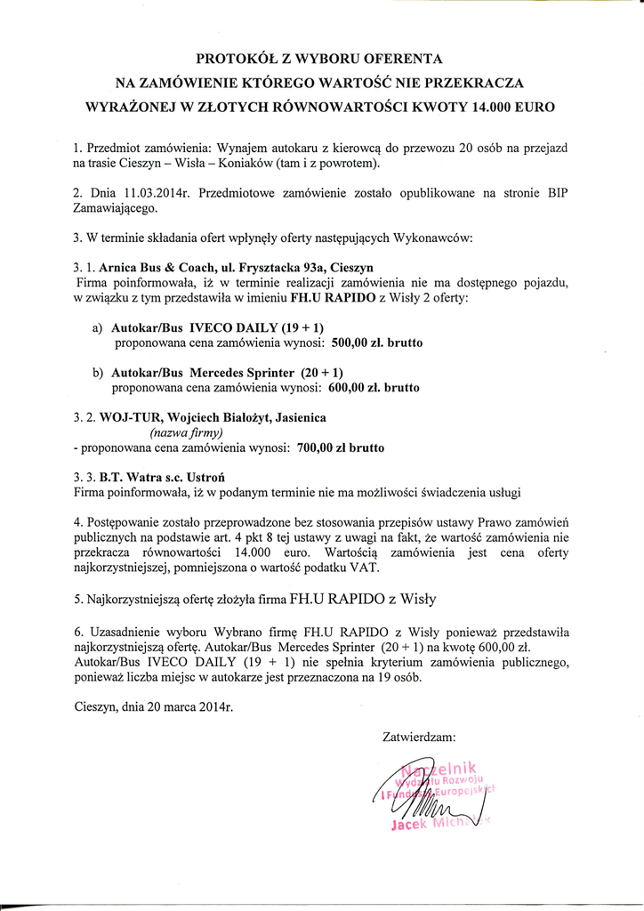PROTOKOL Z WYBORU OFERENTA N A Z A M O W I E N I E K T O R E G O W A R T O S C NIE P R Z E K R A C Z A W Y R A Z O N E J W Z L O T Y C H R O W N O W A R T O S C I K W O T Y 14.000 E U R O 1. Przedmiot zamowienia: Wynajem autokaru z kierowc^ do przewozu 20 osob na przejazd na trasie Cieszyn - Wisla - Koniakow (tarn i z powrotem). 2. Dnia 11.03.2014r. Przedmiotowe zamowienie zostalo opublikowane na stronie BIP Zamawiaj^cego. 3. W terminie skladania ofert wpiyn^ly oferty nast^puj^cych Wykonawcow: 3.1. Arnica Bus & Coach, ul. Frysztacka 93a, Cieszyn Firma poinformowala, iz w terminie realizacji zamowienia nie ma dost^pnego pojazdu, w zwi^zku z tym przedstawiia w imieniu FH.U RAPIDO z Wisly 2 oferty: a) Autokar/Bus IVECO DAILY (19 + 1) proponowana cena zamowienia wynosi: 500,00 zl. brutto b) Autokar/Bus Mercedes Sprinter (20 + 1) proponowana cena zamowienia wynosi: 600,00 zl. brutto 3.2. WOJ-TUR, Wojciech Bialozyt, Jasienica (nazwa flrmy) - proponowana cena zamowienia wynosi: 700,00 zl brutto 3.3. B.T. Watra s.c. Ustron Firma poinformowala, iz w podanym terminie nie ma mozliwosci swiadczenia uslugi 4. Post^powanie zostalo przeprowadzone bez stosowania przepisow ustawy Prawo zamowien publicznych na podstawie art. 4 pkt 8 tej ustawy z uwagi na fakt, ze wartosc zamowienia nie przekracza rownowartosci 14.000 euro. Wartosci^ zamowienia jest cena oferty najkorzystniejszej, pomniejszona o wartosc podatku V A T . 5. Najkorzystniejsz^ ofert? zlozyla firma FH.U RAPIDO z Wisiy 6. Uzasadnienie wyboru Wybrano firm? F H . U RAPIDO z Wisly poniewaz przedstawiia najkorzystniejsz4 ofert?. Autokar/Bus Mercedes Sprinter (20 + 1) na kwot? 600,00 zl. Autokar/Bus IVECO D A I L Y (19 + 1) nie spelnia kryterium zamowienia publicznego, poniewaz liczba miejsc w autokarze jest przeznaczona na 19 osob. Cieszyn, dnia 20 marca 2014r. Zatwierdzam: