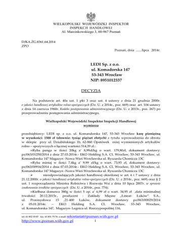 WIELKOPOLSKI WOJEWÓDZKI INSPEKTOR INSPEKCJI HANDLOWEJ Al. Marcinkowskiego 3, 60-967 Poznań D/KA.ŻG.8361.64.2014 ZPO Poznań, dnia .......lipca 2014r. LEDI Sp. z o.o. ul. Komadorska 147 53-343 Wrocław NIP: 8951012337 DECYZJA Na podstawie art. 40a ust. 1 pkt 3 oraz ust. 4 ustawy z dnia 21 grudnia 2000r. o jakości handlowej artykułów rolno-spożywczych (Dz. U. z 2014r., poz. 669) oraz art. 104 ustawy z dnia 14 czerwca 1960r. Kodeks postępowania administracyjnego (Dz. U. z 2013r., poz. 267) po przeprowadzeniu postępowania administracyjnego, Wielkopolski Wojewódzki Inspektor Inspekcji Handlowej wymierza przedsiębiorcy: LEDI sp. z o.o. ul. Komandorska 147, 53-343 Wrocław karę pieniężną w wysokości: 1500 zł (słownie: tysiąc pięćset złotych) z tytułu wprowadzenia do obrotu w sklepie przy ul. Dziubińskiego 1b, 62-860 Opatówek niżej wymienionych artykułów rolno – spożywczych o łącznej wartości 514,39 zł.: • Ryba panga w ilości 20kg a’ 8,99zł/kg o wart. 179,80zł, dokument dostawy: pz/063/01250/2014 z dnia 27.03.2014r.- EKO Holding S.A. CL Wrocław, 53-343 Wrocław, ul. Komandorska 147 Magazyn -Nowa Wieś Wrocławska ul. Ryszarda Chomicza 13C • Ryba mintaj w ilości 7,4kg a’ 9,99 zł/kg o wart. 73,93 zł, dokument dostawy: pz/063/00916/2014 z dnia 07.03.2014r.- EKO Holding S.A. CL Wrocław, 53-343 Wrocław, ul. Komandorska 147 Magazyn -Nowa Wieś Wrocławska ul. Ryszarda Chomicza 13C nieodpowiadających jakości handlowej określonej w art. 6 i 7 ustawy z dnia 21.12.2000r. o jakości handlowej artykułów rolno-spożywczych (Dz. U. z 2014r., poz. 669) oraz § 2 ust. 1 rozporządzenia Ministra Rolnictwa i Rozwoju Wsi z dnia 10 lipca 2007r. w sprawie znakowania środków spożywczych (Dz. U. z 2014r., poz. 774). • Kiełbasa domowa 380g w ilości 5 op. a’ 6,99 zł o wart. 34,95 zł ,data minimalnej trwałości 20.12.2015r., producent : Zakłady Mięsne „Łmeat- Łuków” S.A., ul. Przemysłowa 15 ,21-400 Łuków, dokument dostawy pz/063/00029/2014 z 05.01.2014r. – EKO Holding S.A. CL Wrocław, 53-343 Wrocław, ul. Komandorska 147, Magazyn- Legnica ul. Rzeczypospolitej 116, tel. 61 852 35 07 fax. 61 851 75 76 e-mail: [email protected] http://www.poznan.wiih.gov.pl 1 WIELKOPOLSKI WOJEWÓDZKI INSPEKTOR INSPEKCJI HANDLOWEJ Al. Marcinkowskiego 3, 60-967 Poznań • Krupnik tradycyjny z kaszą 650g w ilości 2 op. a’ 4,99 zł o wart. 9,98 zł, data minimalnej trwałości 23.03.2015r. producent : „Rolnik” sp. z o. o. Zakład Przetwórstwa Mięsnego ul. Pszczyńska 10, 43-187 Orzesze, dostawy pz/063/00371/2014 z 31.01.2014r. – Drogeria i Market Grupa EKO Sp. z o. o. Dobrzyca, 63-300 Dobrzyca, ul. Klonów 1, nieodpowiadających jakości handlowej określonej w art. 6 ust. 2 ustawy z dnia 21.12.2000r. o jakości handlowej artykułów rolno-spożywczych (Dz. U. z 2014r., poz. 669) w związku z art. 46 ust. 1 pkt.1 ustawy z dnia 25 sierpnia 2006r. o bezpieczeństwie żywności i żywienia (Dz. U. z 2010r. Nr 136, poz. 914 ze zm.). •surówka wiosenna w ilości 3 kg a’ 7,99 zł/kg zł o wart. 71,91zł, •surówka porowa w ilości 3 kg a’ 7,99 zł/kg zł o wart. 71,91zł, •surówka koperkowa w ilości 3 kg a’ 7,99 zł/kg zł o wart. 71,91zł, dokument dostawy pz/063/01310/2014 z 31.03.2014r. – Firma Grześkowiak spółka jawna, 62-035 Kórnik, ul. Śremska 29. nieodpowiadających jakości handlowej określonej w § 17 ust. 1 pkt. 1 i 2 rozporządzenia Ministra Rolnictwa i Rozwoju Wsi z dnia 10 lipca 2007r. w sprawie znakowania środków spożywczych (Dz. U. z 2014r., poz. 774). Art. 40a ust. 1 pkt 3 ustawy z dnia 21.12.2000 r. o jakości handlowej artykułów rolno – spożywczych (Dz. U. z 2014, poz. 669), każdy kto wprowadza do obrotu artykuły rolnospożywcze nieodpowiadające jakości handlowej określonej w przepisach o jakości handlowej lub deklarowanej przez producenta w oznakowaniu tych artykułów, podlega karze pieniężnej w wysokości do pięciokrotnej wartości korzyści majątkowej uzyskanej lub która mogłaby zostać uzyskana przez wprowadzenie tych artykułów rolno-spożywczych do obrotu, nie niższej jednak niż 500 zł. UZASADNIENIE W dniach od 01.04.2014r. do 04.04.2014r. na podstawie upoważnienia Wielkopolskiego Wojewódzkiego Inspektora Inspekcji Handlowej nr D/KA.ŻG.8361.64.2014 z dnia 1 kwietnia 2014r. inspektorzy Wojewódzkiego Inspektoratu Inspekcji Handlowej w Poznaniu Delegatura w Kaliszu przeprowadzili kontrolę u przedsiębiorcy LEDI sp. z o.o. ul. Komandorska 147, 53-343 Wrocław – punkt sprzedaży Opatówku, ul. Dziubińskiego 1b, 62-860 Opatówek, na podstawie przepisów art. 3 ust. 1-3 rozporządzenia Parlamentu Europejskiego i Rady (WE) Nr 882/2004 z dnia 29 kwietnia 2004r. w sprawie kontroli urzędowych przeprowadzanych w celu sprawdzenia zgodności z prawem paszowym i żywnościowym oraz regułami dotyczącymi zdrowia zwierząt i dobrostanu zwierząt (Dz. Urz. UE L 165 z 30.04.2004r. ze zm.), art. 17 ust. 3 ustawy z dnia 21 grudnia 2000r. o jakości handlowej artykułów rolno-spożywczych (Dz. U. z 2005r. nr 187, poz. 1577, ze zm.) w związku z art. 3 ust. 1 pkt 1, 2 i 6 ustawy z dnia 15 grudnia 2000r. o Inspekcji Handlowej (Dz. U. z 2014r., poz. 148). W toku kontroli stwierdzono, że oferowano do sprzedaży wyroby: tel. 61 852 35 07 fax. 61 851 75 76 e-mail: [email protected] http://www.poznan.wiih.gov.pl 1 WIELKOPOLSKI WOJEWÓDZKI INSPEKTOR INSPEKCJI HANDLOWEJ Al. Marcinkowskiego 3, 60-967 Poznań • Ryba panga w ilości 20kg a’ 8,99zł/kg o wart. 179,80zł, dokument dostawy: pz/063/01250/2014 z dnia 27.03.2014r.- EKO Holding S.A. CL Wrocław, 53-343 Wrocław, ul. Komandorska 147 Magazyn -Nowa Wieś Wrocławska ul. Ryszarda Chomicza 13C • Ryba mintaj w ilości 7,4kg a’ 9,99 zł/kg o wart. 73,93 zł, dokument dostawy: pz/063/00916/2014 z dnia 07.03.2014r.- EKO Holding S.A. CL Wrocław, 53-343 Wrocław, ul. Komandorska 147 Magazyn -Nowa Wieś Wrocławska ul. Ryszarda Chomicza 13C nieodpowi