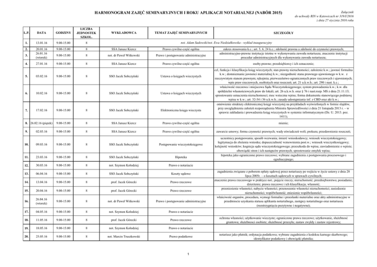 HARMONOGRAM ZAJĘĆ SEMINARYJNYCH I ROKU APLIKACJI NOTARIALNEJ (NABÓR 2015) L.P. DATA GODZINY LICZBA JEDNOSTEK SZKOL. 1. 13.01.16 9.00-15.00 8 2. 20.01.16 26.01.16 (wtorek) 9.00-15.00 27.01.16 3. 4. WYKŁADOWCA TEMAT ZAJĘĆ SEMINARYJNYCH 8 SSA Janusz Kiercz Prawo cywilne-część ogólna 9.00-15.00 8 not. dr Paweł Witkowski Prawo i postępowanie administracyjne 9.00-15.00 8 SSA Janusz Kiercz Prawo cywilne-część ogólna Załącznik do uchwały RIN w Katowicach nr 319/I/2016 z dnia 27 stycznia 2016 roku SZCZEGÓŁY not. Adam Sadowski/not. Ewa Niedziałkowska - wykład inauguracyjny zakres stosowania k.c.; art. 5, 6, 24 k.c.; zdolność prawna a zdolność do czynności prawnych; administracyjno-prawne instytucje istotne w wykonywaniu zawodu notariusza; znaczenie instytucji procedur administracyjnych dla wykonywania zawodu notariusza; osoby prawne; przedsiębiorcy i ich oznaczenie; cel, funkcja i klasyfikacja ksiąg wieczystych; stan prawny nieruchomości; założenie k.w.; jawnoć formalna k.w.; domniemanie jawności materialnej k.w.; niezgodność stanu prawnego ujawnionego w k.w. z rzeczywistym stanem prawnym; rękojmia; pierwszeństwo ograniczonych praw rzeczowych i ujawnionych; wpis praw rzeczowych, osobistych oraz roszczeń; art. 21 u.k.w.h.; art. 290 i nast. k.c.; właściwość rzeczowa i miejscowa Sądu Wieczystoksięgowego; system prowadzenia k.w.; k.w. dla spółdzielni własnościowych praw do lokali; art. 26 u.k.w.h. oraz § 76 i nast.rozp. MS z dnia 21.11.13; sprostowanie oznaczenia nieruchomosci; moc wsteczna wpisu; forma dokumentu stanowiącego podstawę wpisu w k.w.; art. 32-34 i 36 u.k.w.h.; zasady udostępniania inf. z CBD oraz akt k.w.; omówienie struktury elektronicznej księgi wieczystej na przykładach wyświetlonych w formie slajdów, przy uwzględnieniu założeń rozporządzenia Ministra Sprawiedliwości z dnia 21 listopada 2013 r. – w sprawie zakładania i prowadzenia ksiąg wieczystych w systemie informatycznym (Dz. U. 2013. poz. 1411); 5. 03.02.16 9.00-15.00 8 SSO Jacek Sobczyński Ustawa o księgach wieczystych 6. 10.02.16 9.00-15.00 8 SSO Jacek Sobczyński Ustawa o księgach wieczystych 7. 17.02.16 9.00-15.00 8 SSO Jacek Sobczyński Elektroniczna księga wieczysta 9.00-15.00 8 SSA Janusz Kiercz Prawo cywilne-część ogólna mienie; 9.00-15.00 8 SSA Janusz Kiercz Prawo cywilne-część ogólna zawarcie umowy; forma czynności prawnych; wady oświadczeń woli; prokura; przedawnienie roszczeń; 8. 26.02.16 (piątek) 9. 02.03.16 10. 09.03.16 9.00-15.00 8 SSO Jacek Sobczyński Postępowanie wieczystoksięgowe 11. 23.03.16 9.00-15.00 8 SSO Jacek Sobczyński Hipoteka 12. 30.03.16 9.00-15.00 8 not. Szymon Kołodziej Prawo o notariacie 13. 06.04.16 9.00-15.00 8 SSO Jacek Sobczyński Koszty sądowe 14. 13.04.16 9.00-15.00 8 prof. Jacek Górecki Prawo rzeczowe 15. 20.04.16 9.00-15.00 8 prof. Jacek Górecki Prawo rzeczowe 16. 26.04.16 (wtorek) 9.00-15.00 8 not. dr Paweł Witkowski Prawo i postępowanie administracyjne 17. 04.05.16 9.00-15.00 8 not. Szymon Kołodziej Prawo o notariacie 18. 11.05.16 9.00-15.00 8 prof. Jacek Górecki Prawo rzeczowe 19. 18.05.16 9.00-15.00 8 not. Szymon Kołodziej Prawo o notariacie 20. 25.05.16 9.00-15.00 8 not. Marcin Truszkowski Prawo podatkowe 1 uczestnicy postępowania; sposób wezwania; śmierć wnioskodawcy; wniosek wieczystoksięgowy; legitymacja do złożenia wniosku; dopuszczalność wznownienia post.w.; wniosek wieczystkosięgowy; kolejność wniosków; kognicja sądu wieczystoksięgowego; przeszkoda do wpisu; zawiadomienie o wpisie; obowiązki stron i ich następców prawnych; sprostowanie omyłek wpisu; hipoteka jako ograniczone prawo rzeczowe; wybrane zagadnienia z postępowania procesowego i egzekucyjnego; zagadnienia związane z poborem opłaty sądowej przez notariuszy po wejściu w życie ustawy z dnia 28 lipca 2005r. – o kosztach sądowych w sprawach cywilnych; znaczenie prawa rzeczowego w praktyce not.; pojęcie rzeczy; nieruchomość; przedsiębiorstwo; posiadanie; dzierżenie; prawa rzeczowe i ich klasyfikacja; własność; przeniesienie własności; nabycie własności; przenoszenie własności nieruchomości; zasiedzenie nieruchomości; współwłasność; zniesienie współwłasności; właściwość organów, procedura, wymogi formalne i przesłanki materialne oraz akty administracyjne w przedmiocie uzyskania statusu aplikanta notarialnego, zastępcy notarialnego oraz notariusza (rozstrzygnięcia pozytywne i negatywne); ochrona własności; użytkowanie wieczyste; ograniczone prawa rzeczowe; użytkowanie, służebnosć gruntowa; służebnosci osobiste; służebnosć przesyłu; zastaw zwykły i zastaw rejestrowy; notariusz jako płatnik; ordynacja podatkowa; wybrane zagadnienia z kodeksu karnego skarbowego; identyfikator podatkowy i obowiązki płatnika; HARMONOGRAM ZAJĘĆ SEMINARYJNYCH I ROKU APLIKACJI NOTARIALNEJ (NABÓR 2015) Załącznik do uchwały RIN w Katowicach nr 319/I/2016 z dnia 27 stycznia 2016 roku ustawa o dochodach jednostek samorządu terytorialnego; ustawa o podatku dochodowym od osób fizycznych w praktyce not.; ustawa o podatku od towarów i usług; ustawa o podatku od czynności cywilnoprawnych; ustawa o podatku od spadków i darowizn; 21. 01.06.16 9.00-15.00 8 not. Marcin Truszkowski Prawo podatkowe 22. 08.06.16 9.00-15.00 8 not. Marcin Truszkowski Prawo podatkowe 23. 15.06.16 9.00-15.00 8 prof.zw dr hab. Ryszard Małajny Prawo konstytucyjne 24. 22.06.16 10.00-16.00 8 mgr Agata Otrębska Sztuka komunikowania się (erystyka) 25. 05.10.16 9.00-15.00 8 not. Jacek Wojdyło Struktura aktu notarialnego wymogi formalne; części aktu notarialnego (komparycja, osnowa, część końcowa); 26. 12.10.16 9.00-15.00 8 not. Arkadiusz Szkurłat KRiO stosunki majątkowe małżeńskie; 27. 19.10.16 9.00-15.00 8 not. Jacek Darowski Prawo pierwokupu i odkupu prawo pierwokupu: ustawowego i umownego, z ustawy o gospodarce nieruchomościami, z ustawy o specjalnych strefach ekonomicznych, z ustawy o spółd