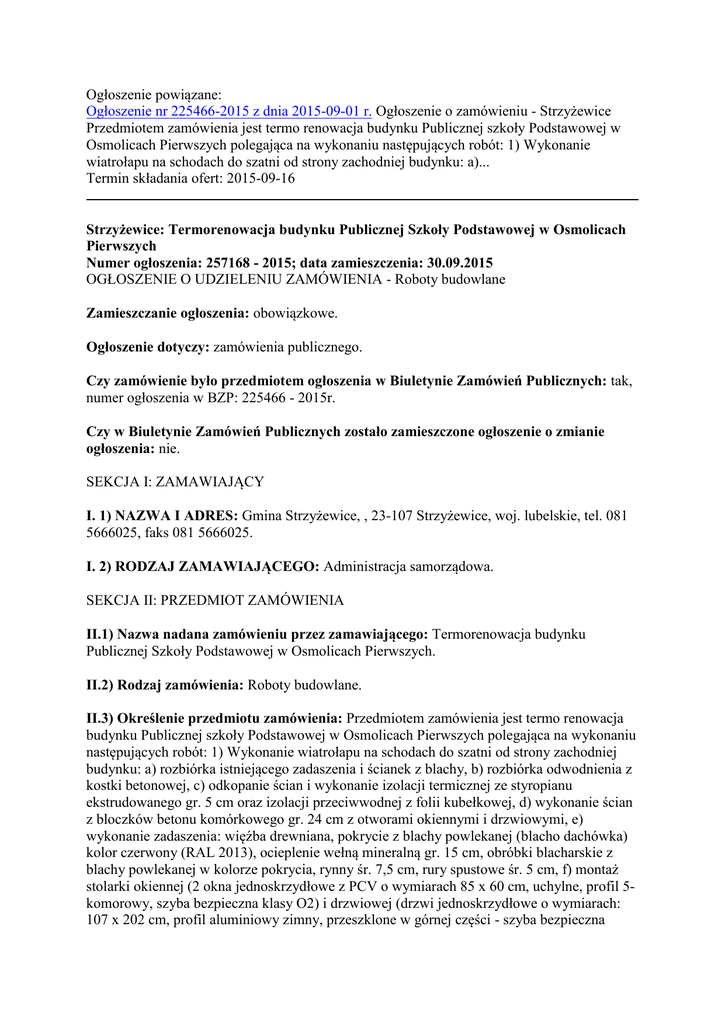 Ogłoszenie powiązane: Ogłoszenie nr 225466-2015 z dnia 2015-09-01 r. Ogłoszenie o zamówieniu - Strzyżewice Przedmiotem zamówienia jest termo renowacja budynku Publicznej szkoły Podstawowej w Osmolicach Pierwszych polegająca na wykonaniu następujących robót: 1) Wykonanie wiatrołapu na schodach do szatni od strony zachodniej budynku: a)... Termin składania ofert: 2015-09-16 Strzyżewice: Termorenowacja budynku Publicznej Szkoły Podstawowej w Osmolicach Pierwszych Numer ogłoszenia: 257168 - 2015; data zamieszczenia: 30.09.2015 OGŁOSZENIE O UDZIELENIU ZAMÓWIENIA - Roboty budowlane Zamieszczanie ogłoszenia: obowiązkowe. Ogłoszenie dotyczy: zamówienia publicznego. Czy zamówienie było przedmiotem ogłoszenia w Biuletynie Zamówień Publicznych: tak, numer ogłoszenia w BZP: 225466 - 2015r. Czy w Biuletynie Zamówień Publicznych zostało zamieszczone ogłoszenie o zmianie ogłoszenia: nie. SEKCJA I: ZAMAWIAJĄCY I. 1) NAZWA I ADRES: Gmina Strzyżewice, , 23-107 Strzyżewice, woj. lubelskie, tel. 081 5666025, faks 081 5666025. I. 2) RODZAJ ZAMAWIAJĄCEGO: Administracja samorządowa. SEKCJA II: PRZEDMIOT ZAMÓWIENIA II.1) Nazwa nadana zamówieniu przez zamawiającego: Termorenowacja budynku Publicznej Szkoły Podstawowej w Osmolicach Pierwszych. II.2) Rodzaj zamówienia: Roboty budowlane. II.3) Określenie przedmiotu zamówienia: Przedmiotem zamówienia jest termo renowacja budynku Publicznej szkoły Podstawowej w Osmolicach Pierwszych polegająca na wykonaniu następujących robót: 1) Wykonanie wiatrołapu na schodach do szatni od strony zachodniej budynku: a) rozbiórka istniejącego zadaszenia i ścianek z blachy, b) rozbiórka odwodnienia z kostki betonowej, c) odkopanie ścian i wykonanie izolacji termicznej ze styropianu ekstrudowanego gr. 5 cm oraz izolacji przeciwwodnej z folii kubełkowej, d) wykonanie ścian z bloczków betonu komórkowego gr. 24 cm z otworami okiennymi i drzwiowymi, e) wykonanie zadaszenia: więźba drewniana, pokrycie z blachy powlekanej (blacho dachówka) kolor czerwony (RAL 2013), ocieplenie wełną mineralną gr. 15 cm, obróbki blacharskie z blachy powlekanej w kolorze pokrycia, rynny śr. 7,5 cm, rury spustowe śr. 5 cm, f) montaż stolarki okiennej (2 okna jednoskrzydłowe z PCV o wymiarach 85 x 60 cm, uchylne, profil 5komorowy, szyba bezpieczna klasy O2) i drzwiowej (drzwi jednoskrzydłowe o wymiarach: 107 x 202 cm, profil aluminiowy zimny, przeszklone w górnej części - szyba bezpieczna klasy P-4, z pochwytem i samozamykaczem, zamek wpuszczany z wkładką bębenkową), g) wykonanie opaski odwodnieniowej z kostki betonowej z rozbiórki na podsypce cementowo piaskowej gr. 5 cm wraz z ułożeniem obrzeży, h) tynkowanie i malowanie ścian wewnętrznych 2) Wykonanie wiatrołapu na schodach do kotłowni od strony wschodniej budynku: a) rozbiórka istniejącego zadaszenia z blachy, b) rozbiórka odwodnienia z kostki betonowej, c) wykonanie ścian z bloczków betonu komórkowego gr. 24 cm z otworami okiennymi i drzwiowymi, d) wykonanie zadaszenia: więźba drewniana, pokrycie z blachy powlekanej (blacho dachówka) kolor czerwony (RAL 2013), ocieplenie wełną mineralną gr. 15 cm, obróbki blacharskie z blachy powlekanej w kolorze pokrycia, rynny śr. 7,5 cm, rury spustowe śr. 5 cm, e) montaż stolarki okiennej (z demontażu: 2 okna jednoskrzydłowe z PCV o wymiarach 85 x 60 cm, uchylne) i drzwiowej (drzwi jednoskrzydłowe o wymiarach: 100 x 202 cm, profil aluminiowy zimny, pełne, z klamką, zamek wpuszczany z wkładką bębenkową), f) wykonanie opaski odwodnieniowej z kostki betonowej z rozbiórki na podsypce cementowo - piaskowej gr. 5 cm wraz z ułożeniem obrzeży, g) tynkowanie i malowanie ścian wewnętrznych 3) Wykonanie nowej elewacji: a) roboty rozbiórkowe: rozbiórka cokołu z płytek terakotowych przy wejściu głównym, rozbiórka obróbek blacharskich (parapety zewnętrzne), demontaż rur spustowych b) wykucie z muru i wstawienie nowych okien - 3 szt. (okna jednoskrzydłowe z PCV o wymiarach 85 x 60 cm, uchylne, profil 5- komorowy, szyba bezpieczna klasy O2), c) przewody wentylacyjne z PCV przedłużenie rur śr. 10 cm i montaż kratek wentylacyjnych okrągłych - 3 szt., d) odbicie uszkodzonych tynków zewnętrznych, e) ustawienie rusztowań, f) oczyszczenie i gruntowanie ścian, osłona okien folią polietylenową, g) ocieplenie ścian styropianem EPS 100 gr. 12 cm współczynniku przenikania ciepła 0,038 W/m2K, ościeża gr. 2 cm, metodą lekką mokrą bezspoinową, wyprawa elewacyjna - tynk nanosilokonowy barwiony w masie, faktura baranek gr. 2 mm, kolor żółty - 2 odcienie, cokół do wysokości 60 cm - tynk mozaikowy żywiczny, h) obróbki blacharskie pod rynnami oraz parapety zewnętrzne z blachy powlekanej, i) ponowny montaż rur spustowych j) dostawa i montaż łukowego daszku z poliwęglanu o wymiarach: długość: 200 cm, szerokość: 100 cm, k) wschodnia elewacja: rozbiórka nawierzchni z koski betonowej wraz z rozbiórką podsypki, ponowne ułożenie kostki na podsypce cementowo - piaskowej gr. 10 cm. Szczegółowy zakres, wymagania oraz warunki wykonania robót objętych przedmiotowym zamówieniem określone zostały w przedmiarze robót oraz specyfikacji technicznej wykonania i odbioru robót budowlanych, stanowiących załączniki do niniejszej SIWZ. Uwaga: - wskazane w specyfikacji technicznej wykonania i odbioru robót i przedmiarze robót parametry materiałów określają jedynie minimalne oczekiwane parametry jakościowe oraz wymagany standard, dopuszczalne jest zaproponowanie parametrów lepszych, - do każdej z nazw firm, znaków firmowych itp., które zostały wymienione w projekcie budowlano - wykonawczym, specyfikacji technicznej wykonania i odbioru robót oraz przedmiarach robót (stanowiących załącznik do niniejszej specyfikacji) dodaje się słowa lub równoważne - Zamawiający dopuszcza składanie ofert z użyciem materiałów i urządzeń równoważnych do określonych w dokumentacji pr