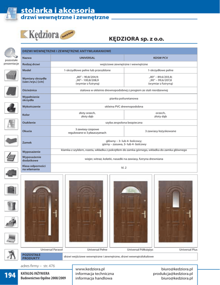 stolarka i akcesoria st drzwi wewnętrzne i zewnętrzne KĘDZIORA sp. z o.o. DRZWI WEWNĘTRZNE I ZEWNĘTRZNE ANTYWŁAMANIOWE pozostałe prezentacje Nazwa UNIVERSAL Rodzaj drzwi KDSW PCV wejściowe zewnętrzne i wewnętrzne Model 1-skrzydłowe pełne lub przeszklone 1-skrzydłowe pełne „80” – 90,8/204,9; „90”– 100,8/208,9 (wymiar z futryną) „80“ – 89,6/203,8; „90“ – 99,6/207,8 (wymiar z futryną) Wymiary skrzydła (szer./wys.) [cm] Ościeżnica stalowa w okleinie drewnopodobnej z progiem ze stali nierdzewnej Wypełnienie skrzydła pianka poliuretanowa Wykończenie okleina PVC drewnopodobna złoty orzech, złoty dąb Kolor Oszklenie orzech, złoty dąb szyba zespolona bezpieczna 3 zawiasy czopowe regulowane w 3 płaszczyznach Okucia główny – 3- lub 4- bolcowy; górny – zasuwa, 3- lub 4- bolcowy Zamek klamka z szyldem, rozeta, wkładka z pokrętłem do zamka górnego, wkładka do zamka głównego Wyposażenie Wyposażenie dodatkowe wizjer, witraż, kołatki, nasadki na zawiasy, futryna drewniana Klasa odporności na włamania kl. 2 Universal Parasol POZOSTAŁE PRODUKTY Universal Pełne Universal Półksiężyc Universal Plus drzwi wejściowe wewnętrzne i zewnętrzne, drzwi wewnątrzlokalowe adres firmy – str. 476 194 3 zawiasy łożyskowane KATALOG INŻYNIERA Budownictwo Ogólne 2008/2009 www.kedziora.pl informacja techniczna informacja handlowa [email protected] [email protected] [email protected]