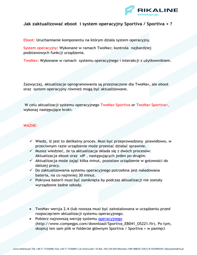 Jak zaktualizować eboot i system operacyjny Sportiva / Sportiva + ? Eboot: Uruchamianie komponentu na którym działa system operacyjny. System operacyjny: Wykonane w ramach TwoNav; kontrola najbardziej podstawowych funkcji urządzenia. TwoNav: Wykonane w ramach systemu operacyjnego i interakcji z użytkownikiem. Zazwyczaj, aktualizacje oprogramowania są przeznaczone dla TwoNav, ale eboot oraz system operacyjny również mogą być aktualizowane. W celu aktualizacji systemu operacyjnego TwoNav Sportiva or TwoNav Sportiva+, wykonaj następujące kroki: WAŻNE: Wiedz, iż jest to delikatny proces. Musi być przeprowadzony prawidłowo, w przeciwnym razie urządzenie może przestać działać sprawnie. Musisz wiedzieć, że ta aktualizacja składa się z dwóch procesów: Aktualizacja eboot oraz xIP , następujących jeden po drugim. Aktualizacja może zająć kilka minut, pozostaw urządzenie w gotowości do dalszej pracy. Do zaktualizowania systemu operacyjnego potrzebna jest naładowana bateria, na co najmniej 30 minut. Pokrywa baterii musi być zamknięta by podczas aktualizacji nie zostały wyrządzone żadne szkody. TwoNav wersja 2.4 (lub nowsza musi być zainstalowana w urządzeniu przed rozpoczęciem aktualizacji systemu operacyjnego. Pobierz najnowszą wersję systemu operacyjnego (http://www.compegps.com/download/Sportiva_EB041_OS221.fir). Po tym, skopiuj ten sam plik w folderze głównym Sportiva / Sportiva + w pamięci wewnętrznej. (Niektóre przeglądarki mogą pobrać ten sam plik spakowany "Sportiva_EB041_OS221.zip", w takim przypadku należy zmienić nazwę pliku na "Sportiva_EB041_OS221.fir") Włącz urządzenie Idź do "Menu> Ustawienia> System> Update OS". Pojawi się okno aktualizacji. Postępuj zgodnie z instrukcjami wyświetlanymi na ekranie i nie wyłączaj urządzenia, dopóki proces eboot się nie zakończy. Po zakończeniu eboot należy nacisnąć przycisk POWER KEY w celu wyłączenia urządzenia (na ekranie pojawi się instrukcja kiedy to zrobić). Uwaga: Poniżej instrukcji włącz opcję "Naciśnij przycisk zasilania, aby ponownie uruchomić", urządzenie tylko się wyłączy. Użytkownik będzie musiał uruchomić urządzenie ponownie. Aktualizacja Xip.bin. Urządzenie zapyta o potwierdzenie: "Czy chcesz zaktualizować OS (xip.bin )?".. Użytkownik nie musi stosować żadnych opcji z wyjątkiem potwierdzenia wiadomości. Po xip.bin został zaktualizowany, urządzenie zostanie uruchomione ponownie. Aby sprawdzić, czy system operacyjny został zaktualizowany można wejść na "System Settings> About". Zaleca się wyłączanie urządzenia na co najmniej 1 minutę po wykonaniu procesu aktualizacji. Ważne: Po zakończeniu aktualizacji, może zajść konieczność ponownej kalibracji ekranu urządzenia. Aktualizacja firmware’u w przypadku normalnej procedury aktualizacji nie powiedzie się tylko w przypadku awarii. Ten proces jest krytyczny, wykonuj go tylko na własną odpowiedzialność. Musisz mieć akumulator w stanie naładowania i prawidłowo umieszczoną kartę microSD. 1) Zaktualizuj do TwoNav 2.4, kopiując pliki TwoNav 2.4. do pamięci wewnętrznej Sportiva / Sportiva +. 2) Zmień nazwę "Sportiva_EB041_OS221.fir" na "Sportiva_EB041_OS221.zip" 3) Rozpakuj Sportiva_EB041_OS221.zip w celu uzyskania dwóch plików: EBOOT.BIN i XIP.BIN 4) Skopiuj EBOOT.BIN i XIP.BIN do katalogu głównego karty microSD. 5) Włóż kartę microSD, baterię i tylną pokrywę urządzenia do Sportiva / Sportiva +. 6) Naciśnij i przytrzymaj przycisk Menu, a następnie podłącz urządzenie do komputera za pomocą kabla USB. 7) Pojawi się czarny ekran menu. Przycisk Menu Release. Opcja 1 jest domyślnie zaznaczona, naciśnij przycisk ON / OFF, aby rozpocząć proces aktualizacji. Czasami urządzenie nie wykrywa karty SD, spróbuj wtedy z inną kartą microSD. 8) Nastapi aktualizacja eboot a następnie XIP, może to potrwać 2 minuty. Nie wyłączaj urządzenia ani nie naciskaj żadnego przycisku. 9) Po zakończeniu procesu, naciśnij przycisk włączania/wyłączania, aby włączyć urządzenie. Następujące kroki w celu kalibracji ekranu urządzenia: 10) Włącz urządzenie. 11 Ustawienia > System > Kalibracja >Kalibracja Ekranu > Przycisk ‘Potwierdź’ 12) Postępuj zgodnie z instrukcjami wyświetlanymi na ekranie ekranie.