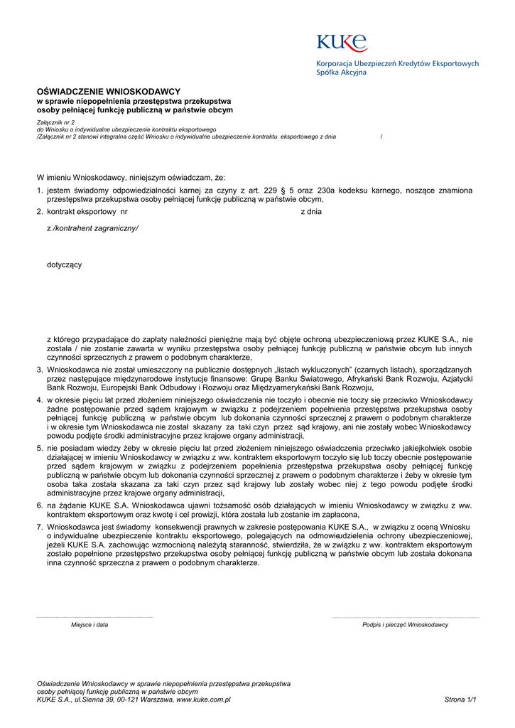 Korporacja Ubezpieczeń Kredytów Eksportowych Spółka Akcyjna OŚWIADCZENIE WNIOSKODAWCY w sprawie niepopełnienia przestępstwa przekupstwa osoby pełniącej funkcję publiczną w państwie obcym Załącznik nr 2 do Wniosku o indywidualne ubezpieczenie kontraktu eksportowego /Załącznik nr 2 stanowi integralna część Wniosku o indywidualne ubezpieczenie kontraktu eksportowego z dnia / W imieniu Wnioskodawcy, niniejszym oświadczam, że: 1. jestem świadomy odpowiedzialności karnej za czyny z art. 229 § 5 oraz 230a kodeksu karnego, noszące znamiona przestępstwa przekupstwa osoby pełniącej funkcję publiczną w państwie obcym, 2. kontrakt eksportowy nr z dnia z /kontrahent zagraniczny/ dotyczący z którego przypadające do zapłaty należności pieniężne mają być objęte ochroną ubezpieczeniową przez KUKE S.A., nie została / nie zostanie zawarta w wyniku przestępstwa osoby pełniącej funkcję publiczną w państwie obcym lub innych czynności sprzecznych z prawem o podobnym charakterze, 3. Wnioskodawca nie został umieszczony na publicznie dostępnych „listach wykluczonych” (czarnych listach), sporządzanych przez następujące międzynarodowe instytucje finansowe: Grupę Banku Światowego, Afrykański Bank R ozwoju, Azjatycki Bank Rozwoju, Europejski Bank Odbudowy i Rozwoju oraz Międzyamerykański Bank Rozwoju, 4. w okresie pięciu lat przed złożeniem niniejszego oświadczenia nie toczyło i obecnie nie toczy się przeciwko Wnioskodawcy żadne postępowanie przed sądem krajowym w związku z podejrzeniem popełnienia przestępstwa przekupstwa osoby pełniącej funkcję publiczną w państwie obcym lub dokonania czynności sprzecznej z prawem o podobnym charakterze i w okresie tym Wnioskodawca nie został skazany za taki czyn przez sąd krajowy, ani nie zostały wobec Wnioskodawcy powodu podjęte środki administracyjne przez krajowe organy administracji, 5. nie posiadam wiedzy żeby w okresie pięciu lat przed złożeniem niniejszego oświadczenia przeciwko jakiejkolwiek osobie działającej w imieniu Wnioskodawcy w związku z ww. kontraktem eksportowym toczyło się lub toczy obecnie postępowanie przed sądem krajowym w związku z podejrzeniem popełnienia przestępstwa przekupstwa osoby pełniącej funkcję publiczną w państwie obcym lub dokonania czynności sprzecznej z prawem o podobnym charakterze i żeby w okresie tym osoba taka została skazana za taki czyn przez sąd krajowy lub zostały wobec niej z tego powodu podjęte środki administracyjne przez krajowe organy administracji, 6. na żądanie KUKE S.A. Wnioskodawca ujawni tożsamość osób działających w imieniu Wnioskodawcy w związku z ww. kontraktem eksportowym oraz kwotę i cel prowizji, która została lub zostanie im zapłacona, 7. Wnioskodawca jest świadomy konsekwencji prawnych w zakresie postępowania KUKE S.A., w związku z oceną Wniosku o indywidualne ubezpieczenie kontraktu eksportowego, polegających na odmowieudzielenia ochrony ubezpieczeniowej, jeżeli KUKE S.A. zachowując wzmocnioną należytą staranność, stwierdziła, że w związku z ww. kontraktem eksportowym zostało popełnione przestępstwo przekupstwa osoby pełniącej funkcję publiczną w państwie obcym lub została dokonana inna czynność sprzeczna z prawem o podobnym charakterze. Miejsce i data Oświadczenie Wnioskodawcy w sprawie niepopełnienia przestępstwa przekupstwa osoby pełniącej funkcję publiczną w państwie obcym KUKE S.A., ul.Sienna 39, 00-121 Warszawa, www.kuke.com.pl Podpis i pieczęć Wnioskodawcy Strona 1/1