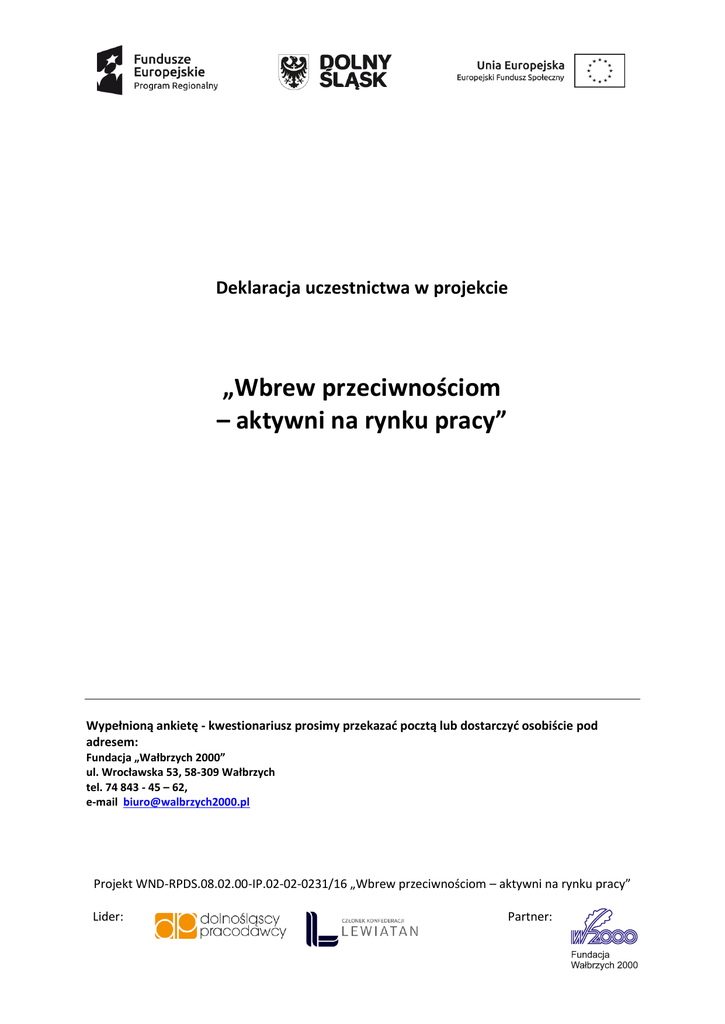 Deklaracja uczestnictwa w projekcie „Wbrew przeciwnościom – aktywni na rynku pracy” Wypełnioną ankietę - kwestionariusz prosimy przekazać pocztą lub dostarczyć osobiście pod adresem: Fundacja „Wałbrzych 2000” ul. Wrocławska 53, 58-309 Wałbrzych tel. 74 843 - 45 – 62, e-mail [email protected] Projekt WND-RPDS.08.02.00-IP.02-02-0231/16 „Wbrew przeciwnościom – aktywni na rynku pracy” Lider: Partner: Jeżeli jest Pan/Pani zainteresowany/a udziałem w projekcie „Wbrew przeciwnościom – aktywni na rynku pracy”, prosimy o zapoznanie się z informacjami umieszczonymi poniżej oraz wypełnienie Deklaracji uczestnictwa w projekcie, której dokładne i rzetelne informacje ułatwią proces rekrutacji. Projekt „Wbrew przeciwnościom – aktywni na rynku pracy” – adresowany jest do mieszkańców powiatów: lwóweckiego, jaworskiego, jeleniogórskiego ziemskiego, lubańskiego, złotoryjskiego, legnickiego ziemskiego, dzierżoniowskiego, kłodzkiego, wałbrzyskiego ziemskiego i ząbkowickiego w wieku powyżej 30 lat, pozostających bez zatrudnienia, w szczególnie trudnej sytuacji na rynku pracy, chcących zdobyć pracę. Warunkiem udziału w projekcie jest wypełnienie Deklaracji uczestnictwa w projekcie, spełnienie wymagań formalnych oraz pozytywne przejście procesu rekrutacji. Oświadczenie Ja …………………………………… ur. …………………… w ……………………………………….. jestem zainteresowany/a udziałem w projekcie „Wbrew przeciwnościom – aktywni na rynku pracy”. Jednocześnie oświadczam, że: zapoznałem /am się z warunkami udziału w projekcie, zostałem/am poinformowany/a, że projekt „Wbrew przeciwnościom – aktywni na rynku pracy” uzyskał dofinansowanie w ramach Regionalnego Programu Operacyjnego Województwa Dolnośląskiego 20142020 współfinansowanego ze środków Europejskiego Funduszu Społecznego, wyrażam zgodę na udział w postępowaniu rekrutacyjnym, mam świadomość, że w przypadku zakwalifikowania do udziału w projekcie, jestem zobowiązany/a do uczestnictwa w proponowanych formach wsparcia, a rezygnacja z nieuzasadnionych przyczyn, skutkować będzie koniecznością zwrotu przeze mnie kosztów mojego udziału w projekcie, wyrażam zgodę na gromadzenie, przetwarzanie i przekazywanie moich danych osobowych, w tym danych wrażliwych w ramach bazy danych związanych z realizowaniem zadań Instytucji Zarządzającej przez Zarząd Województwa Dolnośląskiego w ramach RPO WD 2014-2020 oraz dalszego powierzenia przetwarzania danych osobowych w ramach centralnego systemu teleinformatycznego wspierającego realizację programów operacyjnych w związku z realizacją Regionalnego Programu Operacyjnego Województwa Dolnośląskiego 2014-2020. W związku z powyższym mam świadomość celu zbierania tych danych, prawie wglądu do swoich danych oraz możliwości ich poprawiania. ………………………………………….. ( Miejscowość , data) ………………………………………………………………………………………... (Czytelny podpis) Projekt WND-RPDS.08.02.00-IP.02-02-0231/16 „Wbrew przeciwnościom – aktywni na rynku pracy” Lider: Partner: KWESTIONARIUSZ (prosimy o czytelne wypełnienie) I. DANE OGÓLNE Płeć ……………………….. Imię/ona ………………………………………………………………………..… Nazwisko ………………………………………………………..…… PESEL …………………………………………… Data i miejsce urodzenia …………………………………..……………………………………….. Imiona rodziców: matki …………………………………………………..…. ojca ……………………………………………………………..……… Adres zamieszkania Miejscowość …………………………………….……………….. Kod pocztowy ………………………………………………………….……… Ulica, nr …………………………………………………………….. Powiat …………………………………………………………….……….……… Tel. kontaktowy ……………………….………………………….. e-mail ………………………………………………………………..……….….. Liczba dzieci na utrzymaniu …………………………….. Sytuacja gospodarstwa domowego (dochód na 1 członka rodziny)…………………………………………………………………… II .WYKSZTAŁCENIE Poziom dotychczasowego wykształcenia: Podstawowe Średnie ( ogólne, zawodowe) Zawodowe Wyższe( licencjat, magisterskie) 1. nazwa szkoły …………………………………………………………………………………………………………………………………. - kierunek kształcenia ………………………………………………………………..…………………………………………………... - zawód wyuczony w systemie szkolnym ……………………………………………………..…………………………………. - uzyskany dyplom/tytuł ………………………………………………………. Data ukończ. ………………………….………. 3. Ukończone kursy/ szkolenia (daty): ……………………………………………………………………………………......................................................................... ……………………………………………………………………………………………………………………………………………….……….... Projekt WND-RPDS.08.02.00-IP.02-02-0231/16 „Wbrew przeciwnościom – aktywni na rynku pracy” Lider: Partner: III. SYTUACJA ZAWODOWA - Status na rynku pracy: osoba bezrobotna (1.osoba zarejestrowana w PUP lub 2.pozostająca bez pracy i gotowa
