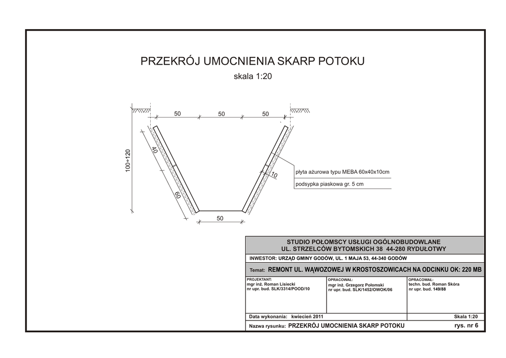 PRZEKRÓJ UMOCNIENIA SKARP POTOKU skala 1:20 50 50 40 100÷120 50 płyta ażurowa typu MEBA 60x40x10cm 10 podsypka piaskowa gr. 5 cm 60 50 STUDIO POŁOMSCY USŁUGI OGÓLNOBUDOWLANE UL. STRZELCÓW BYTOMSKICH 38 44-280 RYDUŁOTWY INWESTOR: URZĄD GMINY GODÓW, UL. 1 MAJA 53, 44-340 GODÓW Temat: REMONT UL. WĄWOZOWEJ W KROSTOSZOWICACH NA ODCINKU OK: 220 MB PROJEKTANT: OPRACOWAŁ: OPRACOWAŁ: mgr inż. Roman Lisiecki nr upr. bud. SLK/3314/POOD/10 mgr inż. Grzegorz Połomski nr upr. bud. SLK/1452/OWOK/06 techn. bud. Roman Skóra nr upr. bud. 149/88 Data wykonania: kwiecień 2011 Nazwa rysunku: PRZEKRÓJ UMOCNIENIA SKARP POTOKU Skala 1:20 rys. nr 6 Szczegół "A” skala 1:10 12 ±0,00 20 10 3 10 5 8 25 - 0,02 3 20 kostka brukowa betonowa gr. 8 cm podsypka cem.-piask. gr. 5 cm podbudowa z kruszywa łamanego gr. 20 cm krawężnik najazdowy 25x12cm podsypka cem.-piask. gr. 3 cm ława z betonu B-15 gr. 10 cm STUDIO POŁOMSCY USŁUGI OGÓLNOBUDOWLANE UL. STRZELCÓW BYTOMSKICH 38 44-280 RYDUŁOTWY INWESTOR: URZĄD GMINY GODÓW, UL. 1 MAJA 53, 44-340 GODÓW Temat: REMONT UL. WĄWOZOWEJ W KROSTOSZOWICACH NA ODCINKU OK: 220 MB PROJEKTANT: OPRACOWAŁ: OPRACOWAŁ: mgr inż. Roman Lisiecki nr upr. bud. SLK/3314/POOD/10 mgr inż. Grzegorz Połomski nr upr. bud. SLK/1452/OWOK/06 techn. bud. Roman Skóra nr upr. bud. 149/88 Data wykonania: kwiecień 2011 Nazwa rysunku: SZCZEGÓŁ "A" Skala 1:10 rys. nr 7 Szczegół "B” w-wa ścieralna z asfaltobetonu gr. 4 cm skala 1:10 w-wa wiążąca z asfaltobetonu gr. 4 cm istniejąca podbudowa wzmocniona cementem gr. 30 cm 12 ±0,00 3 20 10 3 10 25 30 20 8 5 8 - 0,04 kostka brukowa betonowa gr. 8 cm podsypka cem.-piask. gr. 5 cm krawężnik najazdowy 25x12cm podbudowa z kruszywa łamanego gr. 20 cm podsypka cem.-piask. gr. 3 cm ława z betonu B-15 gr. 10 cm STUDIO POŁOMSCY USŁUGI OGÓLNOBUDOWLANE UL. STRZELCÓW BYTOMSKICH 38 44-280 RYDUŁOTWY INWESTOR: URZĄD GMINY GODÓW, UL. 1 MAJA 53, 44-340 GODÓW Temat: REMONT UL. WĄWOZOWEJ W KROSTOSZOWICACH NA ODCINKU OK: 220 MB PROJEKTANT: OPRACOWAŁ: OPRACOWAŁ: mgr inż. Roman Lisiecki nr upr. bud. SLK/3314/POOD/10 mgr inż. Grzegorz Połomski nr upr. bud. SLK/1452/OWOK/06 techn. bud. Roman Skóra nr upr. bud. 149/88 Data wykonania: kwiecień 2011 Nazwa rysunku: SZCZEGÓŁ "B" Skala 1:10 rys. nr 8 PRZEKRÓJ TYPOWY JEZDNI skala 1:20 50 -0,07 2% 300 -0,06 50 ±0,00 2% 2% +0,01 pobocze z kruszywa łam. 0÷30 gr. 8cm pobocze z kruszywa łam. 0÷30 gr. 8cm w-wa ścieralna z asfaltobetonu gr. 4 cm w-wa wiążąca z asfaltobetonu gr. 4 cm istniejąca podbudowa wzmocniona cementem gr. 30 cm STUDIO POŁOMSCY USŁUGI OGÓLNOBUDOWLANE UL. STRZELCÓW BYTOMSKICH 38 44-280 RYDUŁOTWY INWESTOR: URZĄD GMINY GODÓW, UL. 1 MAJA 53, 44-340 GODÓW Temat: REMONT UL. WĄWOZOWEJ W KROSTOSZOWICACH NA ODCINKU OK: 220 MB PROJEKTANT: OPRACOWAŁ: OPRACOWAŁ: mgr inż. Roman Lisiecki nr upr. bud. SLK/3314/POOD/10 mgr inż. Grzegorz Połomski nr upr. bud. SLK/1452/OWOK/06 techn. bud. Roman Skóra nr upr. bud. 149/88 Data wykonania: kwiecień 2011 Nazwa rysunku: PRZEKRÓJ TYPOWY JEZDNI Skala 1:20 rys. nr 4 REPER ROBOCZY NR 1 - góra betonowa słupa telefonicznego km 0+053 H=250,00 słup telefoniczny H Rp nr 1=250,00 STUDIO POŁOMSCY USŁUGI OGÓLNOBUDOWLANE UL. STRZELCÓW BYTOMSKICH 38 44-280 RYDUŁOTWY INWESTOR: URZĄD GMINY GODÓW, UL. 1 MAJA 53, 44-340 GODÓW Temat: REMONT UL. WĄWOZOWEJ W KROSTOSZOWICACH NA ODCINKU OK: 220 MB PROJEKTANT: OPRACOWAŁ: OPRACOWAŁ: mgr inż. Roman Lisiecki nr upr. bud. SLK/3314/POOD/10 mgr inż. Grzegorz Połomski nr upr. bud. SLK/1452/OWOK/06 techn. bud. Roman Skóra nr upr. bud. 149/88 Data wykonania: kwiecień 2011 Nazwa rysunku: REPER ROBOCZY rys. nr 9 PRZEKRÓJ TYPOWY ZJAZDU skala 1:20 w-wa ścieralna z asfaltobetonu gr. 4 cm w-wa wiążąca z asfaltobetonu gr. 4 cm zmienne 12 istniejąca podbudowa wzmocniona cementem gr. 30 cm 12 % zmienne -0,04 ±0,00 SZCZEGÓŁ "A" SZCZEGÓŁ "B" kostka brukowa betonowa gr. 8 cm krawężnik najazdowy 25x12cm krawężnik najazdowy 25x12cm podsypka cem.-piask. gr. 5 cm podsypka cem.-piask. gr. 3 cm podbudowa z kruszywa łamanego gr. 20 cm podsypka cem.-piask. gr. 3 cm ława z betonu B-15 gr. 10 cm ława z betonu B-15 gr. 10 cm STUDIO POŁOMSCY USŁUGI OGÓLNOBUDOWLANE UL. STRZELCÓW BYTOMSKICH 38 44-280 RYDUŁOTWY INWESTOR: URZĄD GMINY GODÓW, UL. 1 MAJA 53, 44-340 GODÓW Temat: REMONT UL. WĄWOZOWEJ W KROSTOSZOWICACH NA ODCINKU OK: 220 MB PROJEKTANT: OPRACOWAŁ: OPRACOWAŁ: mgr inż. Roman Lisiecki nr upr. bud. SLK/3314/POOD/10 mgr inż. Grzegorz Połomski nr upr. bud. SLK/1452/OWOK/06 techn. bud. Roman Skóra nr upr. bud. 149/88 Data wykonania: kwiecień 2011 Nazwa rysunku: PRZEKRÓJ TYPOWY ZJAZDU Skala 1:20 rys. nr 5