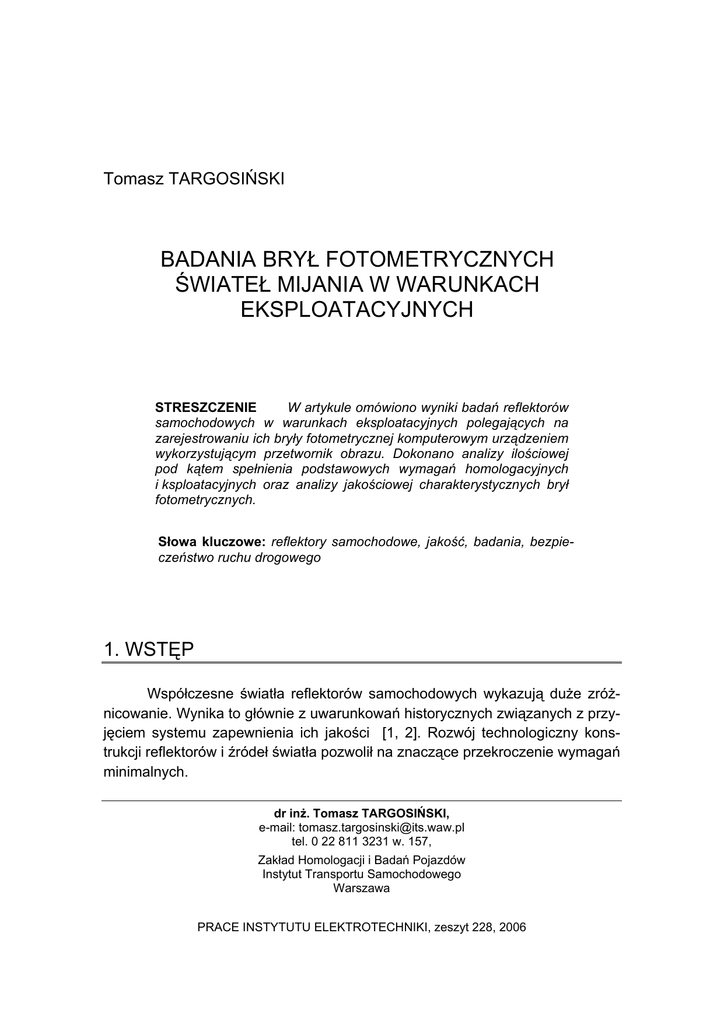 Tomasz TARGOSIŃSKI BADANIA BRYŁ FOTOMETRYCZNYCH ŚWIATEŁ MIJANIA W WARUNKACH EKSPLOATACYJNYCH STRESZCZENIE W artykule omówiono wyniki badań reflektorów samochodowych w warunkach eksploatacyjnych polegających na zarejestrowaniu ich bryły fotometrycznej komputerowym urządzeniem wykorzystującym przetwornik obrazu. Dokonano analizy ilościowej pod kątem spełnienia podstawowych wymagań homologacyjnych i ksploatacyjnych oraz analizy jakościowej charakterystycznych brył fotometrycznych. Słowa kluczowe: reflektory samochodowe, jakość, badania, bezpieczeństwo ruchu drogowego 1. WSTĘP Współczesne światła reflektorów samochodowych wykazują duże zróżnicowanie. Wynika to głównie z uwarunkowań historycznych związanych z przyjęciem systemu zapewnienia ich jakości [1, 2]. Rozwój technologiczny konstrukcji reflektorów i źródeł światła pozwolił na znaczące przekroczenie wymagań minimalnych. dr inż. Tomasz TARGOSIŃSKI, e-mail: [email protected] tel. 0 22 811 3231 w. 157, Zakład Homologacji i Badań Pojazdów Instytut Transportu Samochodowego Warszawa PRACE INSTYTUTU ELEKTROTECHNIKI, zeszyt 228, 2006 328 T. Targosiński Natomiast koncepcja wymagań homologacyjnych dostosowanych do pierwotnej konstrukcji paraboloidalnej z żarówką dwuwłóknową w sposób bardzo uproszczony odzwierciedla rzeczywiste właściwości świateł. W efekcie w warunkach eksploatacyjnych zdarza się, że jakość wiązki światła konkretnego pojazdu znacznie przekracza minimalne wymagania homologacyjne, chociaż często spotykana jest sytuacja, że wymagania te nie są spełnione Wynika to ze zróżnicowanych konstrukcji reflektorów, nieprecyzyjnych wymagań homologacyjnych, rozrzutów parametrów reflektorów i żarówek masowej produkcji, a także obecnych na rynku reflektorów i żarówek o niewystarczającej jakości. Badania zagraniczne potwierdzają występowanie problemu także w innych krajach [3, 4]. Brakuje jednak analizy skali problemu. Aby uzyskać pogląd na sytuację wykonano serię badań brył fotometrycznych reflektorów pojazdów znajdujących się w eksploatacji za pomocą opracowanego przez autora komputerowego urządzenia diagnostycznego wykorzystującego analizę obrazów fotometrycznych uzyskanych z kamery CCD. 2. WYNIKI BADAŃ W ASPEKCIE OBOWIĄZUJĄCYCH WYMAGAŃ Badania miały na celu sprawdzenie na ile parametry świetlne reflektorów zainstalowanych na pojazdach znajdujących się w ruchu są zgodne z obowiązującymi wymaganiami homologacyjnymi oraz eksploatacyjnymi. Podjęto też próbę analizy stanu oświetlenia i możliwych tego przyczyn. Badania wykonano na losowej próbce ponad 100 różnych samochodów osobowych. Pomiary wykonywano dwukrotnie. Pierwszy raz w stanie takim, w jakim samochód przyjechał na badanie. Następnie dokładnie ustawiono światła zgodnie z obowiązującymi wymaganiami i ponownie wykonano pomiary. Wyniki pogrupowano pod kątem spełnienia wybranych, podstawowych wymagań homologacyjnych: natężenie oświetlenia dla punktów 50R i 75R odpowiadających prawej krawędzi pasa ruchu w odległości 50m i 75m przed pojazdem. Zbadano podstawowy parametr oceny eksploatacyjnej świateł: ustawienie świateł na podstawie granicy światła i cienia (GSC). Granicę tę wyznaczono automatycznie, w sposób najlepiej modelujący percepcję wzrokową tj. jako maksimum pionowego gradientu pochodnej logarytmu natężenia oświetlenia. Wyniki przedstawiono na rys. 1...3. Ustawianie świateł jest wymogiem urzędowym i należałoby oczekiwać zdecydowanie większego odsetka prawidłowo ustawionych świateł. Zestawienie Badania brył fotometrycznych świateł mijania w warunkach eksploatacyjnych 329 pokazane na rys. 1 wskazuje na niezadowalający stan ustawienia świateł w warunkach eksploatacyjnych w przebadanej grupie. Można wymienić kilka przyczyn takiego stanu. Jedna z nich to niedostateczna dbałość użytkowników pojazdów o ustawianie świateł. Wynika ona prawdopodobnie również z braku świadomości problemu i niewystarczającej edukacji kierowców. Inny powód to niedoskonałość przyrządów stosowanych do ustawiania świateł. Przyrządy te wykorzystują subiektywną, wzrokową obserwację GSC. Kształt tej granicy częstokroć znacząco odbiega od kształtu wzorcowego, zresztą dość nieprecyzyjnie opisanego [5]. Istotne znaczenie ma również dokładność ustawienia przyrządu względem pojazdu. Ostatecznie uzyskanie ustawienia świateł zgodnego z wymaganiami jest na granicy możliwości technicznych stosowanych współcześnie przyrządów. Rys. 1. Odsetek prawidłowo ustawionych świateł (dodatkowo pokazano podwojony margines tolerancji w stosunku do wymagań urzędowych) Zgodnie z założeniem obowiązującego systemu kontroli eksploatacyjnej prawidłowe ustawienie świateł powinno zagwarantować wystarczające oświetlenie drogi. Na rysunku 2 pokazano spełnienie wymagań w dwóch podstawowych punktach oświetlenia drogi przed regulacją. Na podstawie porównania rys.1. i rys. 2. można by odnieść wrażenie, że niespełnienie wymagań jest powiązane z ustawieniem. Warto jednak zauważyć, że podczas homologacji pomiary wykonywane są w większej ilości punktów. Natomiast w przeprowadzonym eksperymencie weryfikowano tylko dwa punkty. W związku z tym oszacowanie należy potraktować jako zdecydowanie optymistyczne. 330 T. Targosiński Jednak jak pokazuje rys.3 założenie, że prawidłowe ustawienie spowoduje spełnienie, bardzo ograniczonych, wymagań jest niesłuszne. Rys. 2. Odsetek pojazdów przed regulacja ustawienia (pojazdy w takim stanie w jakim poruszają się po drogach), które spełniały minimalne wymagania homologacyjne oświetlenia drogi w punktach 75R i 50R. Zaznaczono także odsetek pojazdów, które spełniały wymagania minimalne przynajmniej w jednym punkcie Rys. 3. Wyniki jak na rys. 2. jednak po precyzyjnym ustawieniu świateł zgodnie z wymaganiami. Ukazane są potencjalne możliwośc