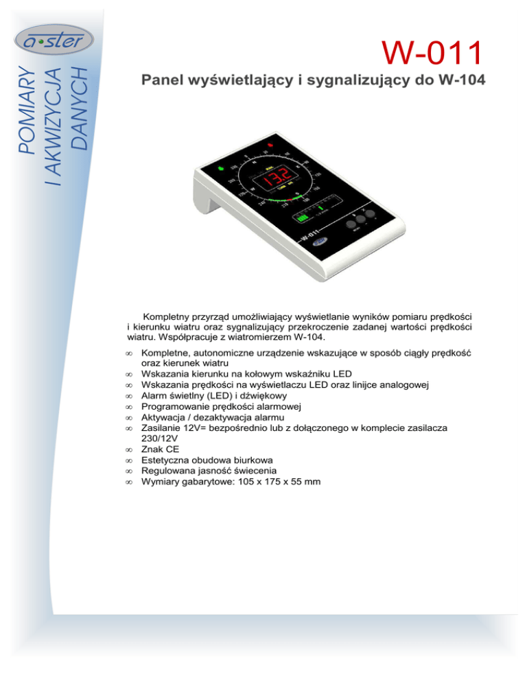 W-011 Panel wyświetlający i sygnalizujący do W-104 Kompletny przyrząd umożliwiający wyświetlanie wyników pomiaru prędkości i kierunku wiatru oraz sygnalizujący przekroczenie zadanej wartości prędkości wiatru. Współpracuje z wiatromierzem W-104. • • • • • • • • • • • Kompletne, autonomiczne urządzenie wskazujące w sposób ciągły prędkość oraz kierunek wiatru Wskazania kierunku na kołowym wskaźniku LED Wskazania prędkości na wyświetlaczu LED oraz linijce analogowej Alarm świetlny (LED) i dźwiękowy Programowanie prędkości alarmowej Aktywacja / dezaktywacja alarmu Zasilanie 12V= bezpośrednio lub z dołączonego w komplecie zasilacza 230/12V Znak CE Estetyczna obudowa biurkowa Regulowana jasność świecenia Wymiary gabarytowe: 105 x 175 x 55 mm Komunikacja między urządzeniami odbywa się w standardzie Modbus RTU. Dane techniczne miernika W-011 chwilowej, średniej i maksymalnej Wskaźniki prędkości % nastawionej wartości prędkości alarmowej Wskaźnik kierunku chwilowego oraz sektora wiatru Wskaźniki zaprogramowanego trybu pracy i rodzaju wyświetlanych parametrów Sygnalizacja przekroczenia zadanej prędkości z zaprogramowanego kierunku wiatru Zasilanie Średni pobór prądu Wymiary gabarytowe Pozycja pracy • • • • • • • • • • • • cyfrowy (LED), zakres pomiaru: do 50 m/s (180km/h), dokładność wskazań: 0,1m/s (0,1km/h) analogowy, liniowy (LED), dokładność wskazań: 1/20 wartości alarmowej, zapamiętywanie wartości maksymalnej analogowy, kołowy, 2-kolorowy (LED), rozdzielczość 10° czasu uśredniania (2 lub 10 min.), jednostki prędkości (m/s lub km/h), rodzaju wyświetlanego parametru prędkości (chwilowa, średnia, lub maksymalna), • załączenia alarmu, • wystąpienia alarmu • sygnalizacja optyczna, • wyjście przekaźnikowe dla zewnętrznych urządzeń sygnalizacyjnych i wykonawczych • sieciowe: 220V 50Hz, • bateryjne: 12V= 150 mA 105 x 175 x 55 mm leżąca, lub wisząca