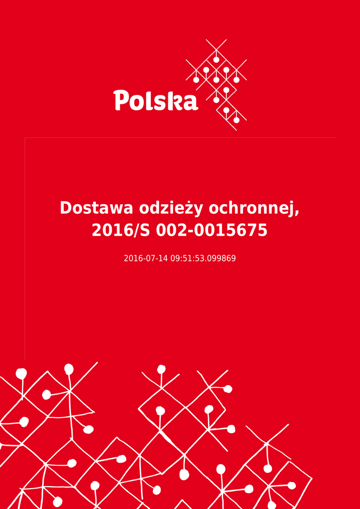 Dostawa odzieży ochronnej, 2016/S 002-0015675 2016-07-14 09:51:53.099869 2 Ta oferta nie stanowi informacji handlowej Dane kontaktowe Grad Zagreb 10000 Zagreb Avenija Dubrovnik 15 Chorwacja Osoba kontaktowa Ured za javnu nabavu [email protected] Tel: +385 1 650 3961 www.zagreb.hr Opis przedmiotu zamówienia Przedmiotem przetargu jest dostawa: Grupa A - peleryny Grupa B - plecaki dla członków zespołów ochrony ludności miasta Zagrzeb. Dokumenty przetargowe w języku chorwackim do pobrania na stronie https://eojn.nn.hr/SPIN/application/ipn/DocumentManagement/DokumentPodaciFrm. aspx?OznakaDokumenta= 2016/S 002-0015675 CPV ● ● ● ● ● Odzież, obuwie, artykuły bagażowe i dodatki Odzież branżowa, specjalna odzież robocza i dodatki Odzież branżowa Peleryny Plecaki 3 Forma przetargu Krajowy (publikowany na lokalnym rynku) Kraj Chorwacja Adres WWW eojn.nn.hr/Oglasnik Termin składania ofert 08.08.2016 Ważna od 14.07.2016 Branże Odzież i obuwie, Odzież, tekstylia, wyroby skórzane, 4