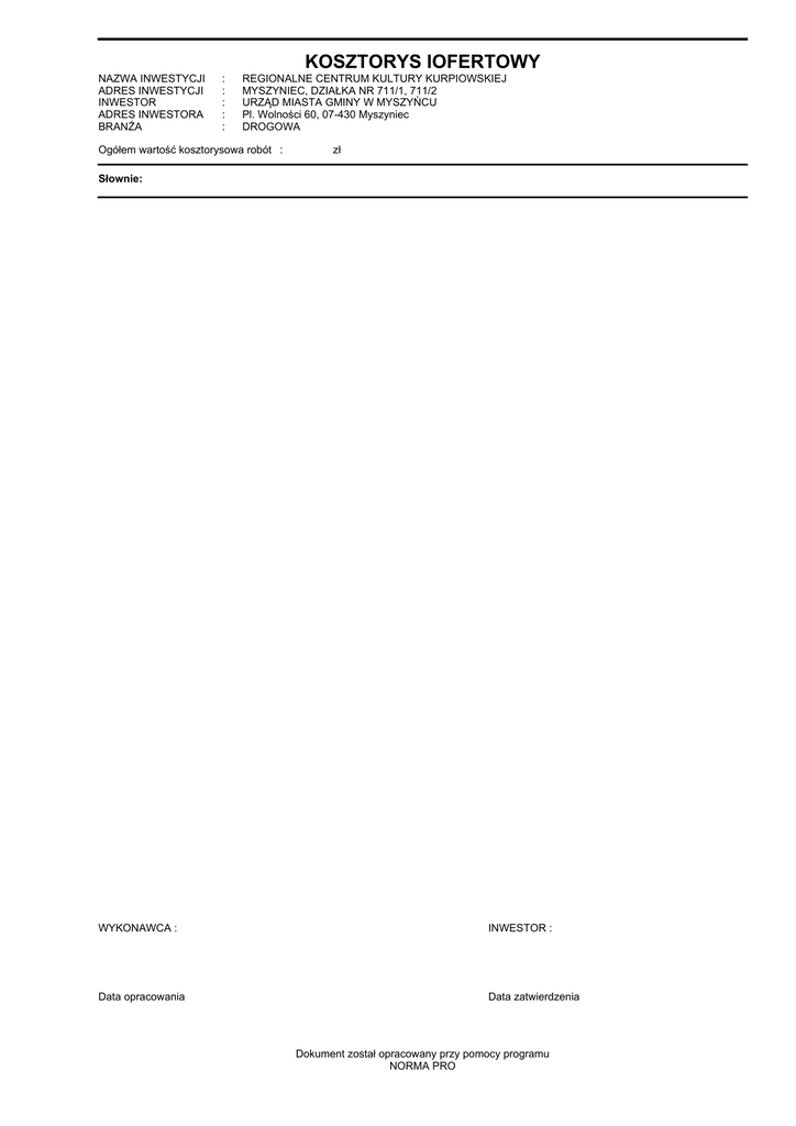 KOSZTORYS IOFERTOWY NAZWA INWESTYCJI ADRES INWESTYCJI INWESTOR ADRES INWESTORA BRANŻA : : : : : REGIONALNE CENTRUM KULTURY KURPIOWSKIEJ MYSZYNIEC, DZIAŁKA NR 711/1, 711/2 URZĄD MIASTA GMINY W MYSZYŃCU Pl. Wolności 60, 07-430 Myszyniec DROGOWA Ogółem wartość kosztorysowa robót : zł Słownie: WYKONAWCA : INWESTOR : Data opracowania Data zatwierdzenia Dokument został opracowany przy pomocy programu NORMA PRO Lp. Podstawa wyceny Opis 1 2 3 1 CIĄGI PIESZE O WZMOCNIONEJ KONSTRUKCJI 1 D-02.00.01 Roboty ziemne wykonywane koparkami podsięd.1 D-02.01.01 biernymi o poj.łyżki 0.25 m3 w gr.kat. III z transp.urobku na odl.do 2 km sam.samowyład. Pozycja obejmuje wykonanie wykopów koryta pod projektowaną konstrukcję nawierzchni ciągów pieszych i obrzeża Przedmiar: 1308,00 m3 2 D-04.01.01 Profilowanie i zagęszczanie podłoża wykonywane d.1 mechanicznie w gruncie kat. II-IV pod warstwy konstrukcyjne nawierzchni. Pozycja obejmuje wykonanie zagęszczenia dna koryta pod konstrukcję nawierzchni ciągów pieszych Przedmiar: 3042,00m2 3 D-04.04.01 Warstwa podbudowy z kruszyw naturalnych - gr. d.1 15 cm. Pozycja obejmuje wykonanie warstwy odcinającej z kruszywa naturalnego (piasku) pod ciagi piesze. Grubość średnia warstwy wbudowanego kruszywa po zagęszczeniu - 15 cm. Przedmiar:3042,00m2 4 D-04.04.02 Warswa podbudowy z kruszyw łamanych gr. 15 d.1 cm. Pozycja obejmuje wykonanie podbudowy z kruszywa łamanego frakcji 0/31,50 mm zagęszczanego mechanicznie o grubości 15 cm pod nawierzchnię z betonowej kostki brukowej w miejscu ciagów pieszych wg. PN-S-06102 Przedmiar: 3042,00m2 5 D-05.03.23 Ciągi piesze z możliwością przejazdu samochodów d.1 z kostki kamiennej brukowej garnitowej grubości 11 cm na podsypce cementowo- piaskowej z wypełnieniem grysem kamiennym. Pozycja obejmuje wykonanie ciągów pieszych z kostki kamiennej brukowej garnitowej grubości 11 cm na podsypce cementowo- piaskowej z wypełnieniem grysem kamiennym Przedmiar:3042,00m2 Wartość kosztorysowa robót bez podatku VAT Podatek VAT Ogółem wartość kosztorysowa robót Słownie: -2- Norma PRO Wersja 4.01, Marzec 2003 r. Licencja: 37337 dla None Klucz wy- Jedn. miakonawry czy 4 5 Ilość Cena zł 6 7 m3 1307.57 m2 3042.00 m2 3042.00 m2 3042.00 m2 3042.00 Wartość zł (6 x 7) 8