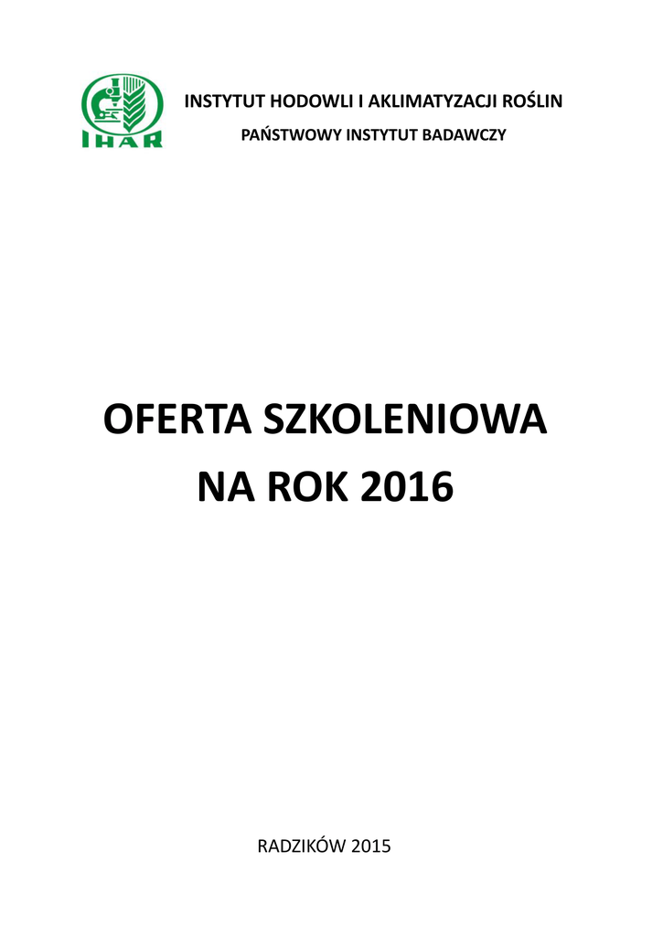 INSTYTUT HODOWLI I AKLIMATYZACJI ROŚLIN PAŃSTWOWY INSTYTUT BADAWCZY OFERTA SZKOLENIOWA NA ROK 2016 RADZIKÓW 2015 ADRES: INSTYTUT HODOWLI I AKLIMATYZACJI ROŚLIN PAŃSTWOWY INSTYTUT BADAWCZY RADZIKÓW, 05-870 BŁONIE DYREKTOR INSTYTUTU prof. dr hab. EDWARD ARSENIUK p.o. KIEROWNIK DZIAŁU PROMOCJI I WSPÓŁPRACY Z ZAGRANICĄ dr KAROLINA MITURA SEKCJA PROMOCJI I SZKOLEŃ WOJCIECH BORAWSKI TEL. CENTRALA (22) 733 45 00 FAX CENTRALA (22) 725 47 14 TEL. SEKCJA PROMOCJI I SZKOLEŃ (22) 733 46 09 Adres w Internecie: http://www.ihar.edu.pl Wydanie publikacji dofinansował Minister Nauki i Szkolnictwa Wyższego Druk SPS IHAR-PIB nr 1/400/2015 2 SPIS TREŚCI Informacje ogólne 4 OPO 1/2016 AGROTECHNIKA RZEPAKU W WARUNKACH ZMIENIAJĄCEGO SIĘ KLIMATU 6 SPS 2/2016 LABORATORYJNA OCENA ZBÓŻ I CHARAKTERYSTYKA SZKODNIKÓW MAGAZYNOWYCH 7 OPO 3/2016 XXXIII KONFERENCJA NAUKOWA „ROŚLINY OLEISTE - POSTĘPY W GENETYCE, HODOWLI I ANALITYCE LIPIDÓW” 8 SPS 4/2016 OCENA WARTOŚCI SIEWNEJ WYBRANYCH GATUNKÓW TRAW I ROŚLIN WARZYWNYCH 9 OBZ 5/2016 NASIENNICTWO I OCHRONA ZIEMNIAKA 10 OMZ 6/2016 ODMIANY ZIEMNIAKA W KRAJOWYM REJESTRZE W 2016 R. ICH ODPORNOŚĆ NA RÓŻNE PATOGENY 11 OBZ 7/2016 PRODUKCJA NASIENNA ZIEMNIAKA - OCENA POLOWA MATERIAŁU SIEWNEGO 12 OBZ 8/2016 OBZ 9/2016 PRODUKCJA NASIENNA ZIEMNIAKA - POBIERANIE PRÓB BULW DO BADAŃ LABORATORYJNYCH I OCENA CECH ZEWNĘTRZNYCH XXIII KRAJOWE DNI ZIEMNIAKA 13 14 Karta zgłoszenia uczestnictwa w proponowanym szkoleniu lub konferencji naukowej 15 w 2016 r. Karta propozycji zmian w przedłożonej Ofercie Szkoleniowej na rok 2016 16 3 Oferta szkoleniowa IHAR-PIB na rok 2016 INFORMACJE OGÓLNE Oferta szkoleniowa na rok 2016 zawiera planowane w Instytucie Hodowli i Aklimatyzacji Roślin - Państwowym Instytucie Badawczym konferencje naukowe i szkolenia przeznaczone dla szerokiego kręgu uczestników. Tematyka szkoleń i konferencji naukowych ujętych w przedkładanej ofercie obejmuje zagadnienia wynikające z aktualnych problemów badawczych IHAR-PIB oraz innych instytutów podległych Ministrowi Rolnictwa i Rozwoju Wsi, a także uczelni rolniczych. Jest więc integralną częścią działalności naukowej IHAR-PIB poszerzoną o działalność naukową innych jednostek badawczych pracujących na rzecz rolnictwa. Tematykę szczegółową opracowują kierownicy merytoryczni, którzy są specjalistami w określonej dyscyplinie naukowej. Kierownicy merytoryczni ustalają wykładowców i decydują o sposobie realizacji szkoleń. Wykładowcami prowadzącymi zajęcia dydaktyczne są najczęściej pracownicy naukowi określonych specjalności z IHAR-PIB, innych instytutów naukowo-badawczych oraz uczelni rolniczych. Szczegółami związanymi z organizacją i realizacją szkoleń zajmuje się Sekcja Promocji i Szkoleń, odpowiedzialna organizacyjnie za realizację doskonalenia zawodowego prowadzonego przez Instytut. Każdy program szkolenia - na życzenie słuchaczy lub instytucji, może ulec częściowej zmianie, jeżeli spowoduje to, że program stanie się ciekawszy i w większym stopniu odpowiadający oczekiwaniom uczestników. Aby ułatwić przekazywanie wszelkich uwag, na końcu niniejszej oferty umieszczamy kartę propozycji zmian w szkoleniach organizowanych w roku 2013, prosząc zainteresowanych o jej wypełnienie. Instytut Hodowli i Aklimatyzacji Roślin - PIB przyjmuje zlecenia na opracowanie dodatkowych tematów szkoleń, nie ujętych w Ofercie szkoleniowej na rok 2016. Instytucja zlecająca takie szkolenie winna przysłać swoją propozycję z podaniem tematu i proponowanego terminu realizacji. Szkolenia obejmują zajęcia teoretyczne (wykłady) oraz praktyczne (ćwiczenia). Ćwiczenia, w zależności od tematu, przeprowadza się w sali wykładowej, na polach doświadczalnych i produkcyjnych, w szklarniach, laboratoriach, przechowalniach, etc. Uczestnicy otrzymują pomoce dydaktyczne oraz szkoleniowe opracowane przez wykładowców oraz zaświadczenia o ukończeniu szkolenia po realizacji całego programu. W przypadku konferencji naukowych uczestnicy otrzymują zazwyczaj materiały konferencyjne zawierające streszczenia referatów i posterów. 4 Oferta szkoleniowa IHAR-PIB na rok 2016 STRONA ORGANIZACYJNA Szkolenia prowadzone są w centrali Instytutu w Radzikowie. Specyfika określonych tematów oraz zaplecze dydaktyczne potrzebne do ich realizacji powodują, że niektóre szkolenia i konferencje odbywają się w Oddziałach IHAR-PIB i zamiejscowych Zakładach Naukowych - w Poznaniu tematyka związana z roślinami oleistymi, w Bydgoszczy - tematyka dotycząca buraka cukrowego, a w Boninie, Jadwisinie i Młochowie - szeroko ujmowana tematyka ziemniaczana. Koszty szkoleń oparte na aktualnie obowiązujących cenach, liczone są oddzielnie dla każdego szkolenia. Wysokość tych kosztów przekazywana jest potencjalnym uczestnikom pisemnie, zawsze na około 3 tygodnie przed rozpoczęciem szkolenia. Zainteresowani tematyką naszych szkoleń proszeni są o zgłoszenie chęci swojego uczestnictwa poprzez (o ile nie podano inaczej w opisie szkolenia): Termin zgłaszania - przy każdym ze szkoleń podany jest termin, do którego należy przesyłać zgłoszenia. przesłanie drogą tradycyjną wypełnionej karty zgłoszenia uczestnictwa, która zamieszczona jest w niniejszej ofercie na adres: Instytut Hodowli i Aklimatyzacji Roślin—PIB Sekcja Promocji i Szkoleń Radzików, 05-870 Błonie Przesłanie faksem wypełnionej karty zgłoszenia uczestnictwa na nr: (22) 725 46 10 przesłanie drogą elektroniczną wypełnionej karty zgłoszenia uczestnictwa, która zamieszczona jest na stronie internetowej www.ihar.edu.pl na adres: [email protected] Wszyscy zgłaszający na podstawie niniejszej Oferty uczestnictwo w szkoleniu otrzymują na piśmie szczegółowe informacje dotyczące warunków uczestnictwa (koszt, termin płatności, dojazdu, itp.) oraz szczegółowy program szkolenia na około 3 tygodnie przed planowanym terminem realizacji. SERDECZNIE ZAPRASZAMY DO UCZEST