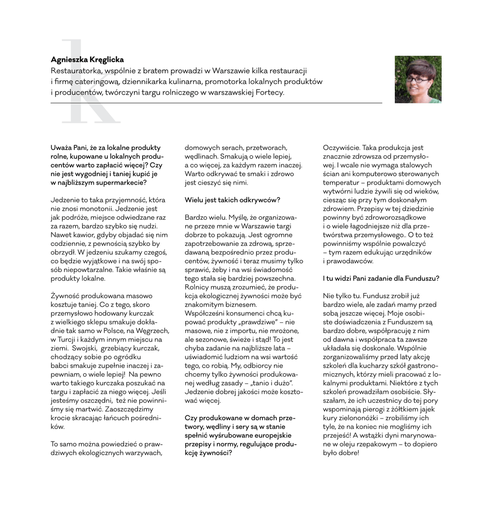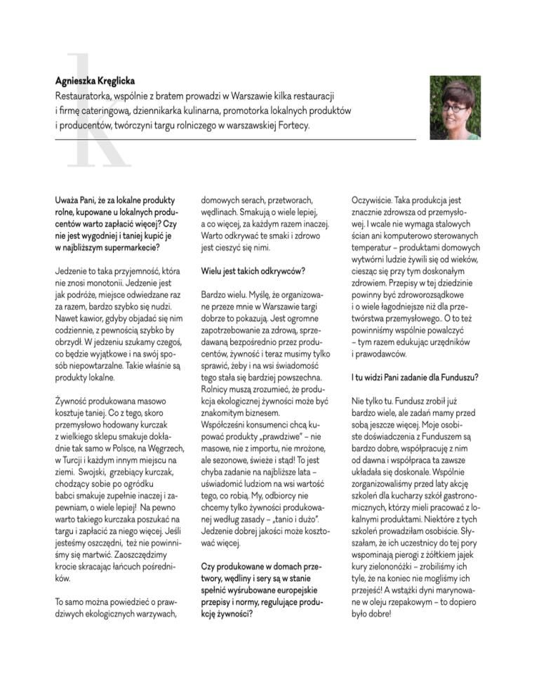 k Agnieszka Kręglicka Restauratorka, wspólnie z bratem prowadzi w Warszawie kilka restauracji i firmę cateringową, dziennikarka kulinarna, promotorka lokalnych produktów i producentów, twórczyni targu rolniczego w warszawskiej Fortecy. Uważa Pani, że za lokalne produkty rolne, kupowane u lokalnych producentów warto zapłacić więcej? Czy nie jest wygodniej i taniej kupić je w najbliższym supermarkecie? domowych serach, przetworach, wędlinach. Smakują o wiele lepiej, a co więcej, za każdym razem inaczej. Warto odkrywać te smaki i zdrowo jest cieszyć się nimi. Jedzenie to taka przyjemność, która nie znosi monotonii. Jedzenie jest jak podróże, miejsce odwiedzane raz za razem, bardzo szybko się nudzi. Nawet kawior, gdyby objadać się nim codziennie, z pewnością szybko by obrzydł. W jedzeniu szukamy czegoś, co będzie wyjątkowe i na swój sposób niepowtarzalne. Takie właśnie są produkty lokalne. Wielu jest takich odkrywców? Żywność produkowana masowo kosztuje taniej. Co z tego, skoro przemysłowo hodowany kurczak z wielkiego sklepu smakuje dokładnie tak samo w Polsce, na Węgrzech, w Turcji i każdym innym miejscu na ziemi. Swojski, grzebiący kurczak, chodzący sobie po ogródku babci smakuje zupełnie inaczej i zapewniam, o wiele lepiej! Na pewno warto takiego kurczaka poszukać na targu i zapłacić za niego więcej. Jeśli jesteśmy oszczędni, też nie powinniśmy się martwić. Zaoszczędzimy krocie skracając łańcuch pośredników. To samo można powiedzieć o prawdziwych ekologicznych warzywach, Bardzo wielu. Myślę, że organizowane przeze mnie w Warszawie targi dobrze to pokazują. Jest ogromne zapotrzebowanie za zdrową, sprzedawaną bezpośrednio przez producentów, żywność i teraz musimy tylko sprawić, żeby i na wsi świadomość tego stała się bardziej powszechna. Rolnicy muszą zrozumieć, że produkcja ekologicznej żywności może być znakomitym biznesem. Współcześni konsumenci chcą kupować produkty „prawdziwe” – nie masowe, nie z importu, nie mrożone, ale sezonowe, świeże i stąd! To jest chyba zadanie na najbliższe lata – uświadomić ludziom na wsi wartość tego, co robią. My, odbiorcy nie chcemy tylko żywności produkowanej według zasady – „tanio i dużo”. Jedzenie dobrej jakości może kosztować więcej. Czy produkowane w domach przetwory, wędliny i sery są w stanie spełnić wyśrubowane europejskie przepisy i normy, regulujące produkcję żywności? Oczywiście. Taka produkcja jest znacznie zdrowsza od przemysłowej. I wcale nie wymaga stalowych ścian ani komputerowo sterowanych temperatur – produktami domowych wytwórni ludzie żywili się od wieków, ciesząc się przy tym doskonałym zdrowiem. Przepisy w tej dziedzinie powinny być zdroworozsądkowe i o wiele łagodniejsze niż dla przetwórstwa przemysłowego.. O to też powinniśmy wspólnie powalczyć – tym razem edukując urzędników i prawodawców. I tu widzi Pani zadanie dla Funduszu? Nie tylko tu. Fundusz zrobił już bardzo wiele, ale zadań mamy przed sobą jeszcze więcej. Moje osobiste doświadczenia z Funduszem są bardzo dobre, współpracuję z nim od dawna i współpraca ta zawsze układała się doskonale. Wspólnie zorganizowaliśmy przed laty akcję szkoleń dla kucharzy szkół gastronomicznych, którzy mieli pracować z lokalnymi produktami. Niektóre z tych szkoleń prowadziłam osobiście. Słyszałam, że ich uczestnicy do tej pory wspominają pierogi z żółtkiem jajek kury zielononóżki – zrobiliśmy ich tyle, że na koniec nie mogliśmy ich przejeść! A wstążki dyni marynowane w oleju rzepakowym – to dopiero było dobre! Uczestnicy warsztatów kulinarnych, organizowanych przez EFRWP. A jakie są Pani ulubione polskie dania? Pochodzę z Lubelszczyzny, więc pierogi z kaszą gryczaną i białym serem są dla mnie najlepszymi pierogami na świecie. To dla mnie smak dzieciństwa. Myślę, że każdy z nas tak ma. Jedzenie to nie tylko składniki odżywcze, ale przede wszystkim wspomnienia i emocje. I chodzi nie tylko o smak dań, ale też o relacje ze sprzedawcą. Gdy kupujemy na małym, lokalnym targu, od producenta którego znamy, wtedy mamy do niego zaufanie. Jeśli ma być w naszym jedzeniu dobra, zdrowa energia, to ona pochodzi właśnie z tej relacji. Dlatego naprawdę warto, nawet mieszkając w dużym mieście, wybrać się co kilka dni na targ i kupić owoce i warzywa od tego, kto je uprawiał, zasiał i zebrał!