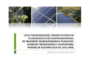 LISTA PRZEDSIĘWZIĘĆ PRIORYTETOWYCH PLANOWANYCH DO DOFINANSOWANIA ZE ŚRODKÓW WOJEWÓDZKIEGO FUNDUSZU OCHRONY ŚRODOWISKA I GOSPODARKI WODNEJ W KATOWICACH NA 2016 ROK Katowice, 23 marca 2015 roku DOFINANSOWANIE ZADAŃ ZE ŚRODKÓW WFOŚIGW W KATOWICACH Podstawowe dokumenty obowiązujące w WFOŚiGW w Katowicach: Lista przedsięwzięć priorytetowych planowanych do dofinansowania ze środków WFOŚiGW w Katowicach, Zasady udzielania dofinansowania ze środków WFOŚiGW w Katowicach, Kryteria wyboru przedsięwzięć finansowanych ze środków WFOŚiGW w Katowicach. Wszystkie potrzebne dokumenty (w tym wzory wniosków), informacje o terminach i regulaminach naborów wniosków oraz procedurze ich rozpatrywania, dostępne są w formie elektronicznej na stronie internetowej Funduszu: www.wfosigw.katowice.pl w zakładce: „Dofinansowanie zadań”. www.wfosigw.katowice.pl LISTA PRZEDSIĘWZIĘĆ DOFINANSOWANYCH ZE ŚRODKÓW FUNDUSZU III. Pierwszeństwo w dofinansowaniu mają zadania wspierane środkami Unii Europejskiej lub innymi środkami zagranicznymi oraz zadania zapisane odpowiednio w krajowych i wojewódzkich programach i planach, w szczególności z zakresu: 1. Gospodarki wodno-ściekowej: 1.1. Przedsięwzięcia ujęte w załączniku 1 Aktualizacji Krajowego programu oczyszczania ścieków komunalnych. 1.2. Sieci wodociągowe i/lub kanalizacje zbiorcze zapewniające odpowiedni poziom jakości wody i/lub oczyszczania ścieków w kolejności: dla aglomeracji powyżej 100 000 RLM, powyżej 15 000 RLM, powyżej 2 000 RLM. 1.3. Obiekty i urządzenia zwiększające bezpieczeństwo przeciwpowodziowe. 1.4. Zapewnienie bezpieczeństwa dostaw wody pitnej. www.wfosigw.katowice.pl LISTA PRZEDSIĘWZIĘĆ DOFINANSOWANYCH ZE ŚRODKÓW FUNDUSZU 1. Ochrona i zrównoważone gospodarowanie zasobami wodnymi: 1.1. Ochrona wód (OW): OW 1. Poprawa jakości wód powierzchniowych i podziemnych, w tym ochrona wód ujmowanych do celów pitnych i realizacja zadań zgodnych z planami gospodarowania wodami na obszarach dorzeczy i programami gospodarki wodnej OW 1.1. Inwestycje zgodne z Krajowym Programem Oczyszczania Ścieków Komunalnych. OW 1.2. Inwestycje z zakresu gospodarki ściekowej, dofinansowane ze środków zagranicznych. OW 1.3. Budowa, rozbudowa lub modernizacja oczyszczalni ścieków komunalnych na terenie aglomeracji o równoważnej liczbie mieszkańców (RLM) powyżej 2000. OW 1.4. Budowa lub modernizacja sieci kanalizacji w aglomeracjach o równoważnej liczbie mieszkańców (RLM) powyżej 2000. OW 1.5. Budowa oczyszczalni przydomowych lub systemów zbierania ścieków oraz podłączeń budynków do zbiorczego systemu kanalizacyjnego. www.wfosigw.katowice.pl LISTA PRZEDSIĘWZIĘĆ DOFINANSOWANYCH ZE ŚRODKÓW FUNDUSZU 1. Ochrona i zrównoważone gospodarowanie zasobami wodnymi: 1.1. Ochrona wód (OW): OW 1. Poprawa jakości wód powierzchniowych i podziemnych, w tym ochrona wód ujmowanych do celów pitnych i realizacja zadań zgodnych z planami gospodarowania wodami na obszarach dorzeczy i programami gospodarki wodnej OW 1.6. Budowa i modernizacja oczyszczalni ścieków przemysłowych lub bytowych i systemów odprowadzania ścieków. OW 1.7. Budowa i modernizacja obiektów gospodarki osadowej w zakresie przeróbki osadów ściekowych z oczyszczania ścieków komunalnych. OW 1.8. Inwestycje ograniczające emisję zanieczyszczeń do wód, mające na celu ograniczenie ładunku zanieczyszczeń odprowadzanych w ściekach do środowiska wodnego, a zwłaszcza substancji szczególnie szkodliwych dla środowiska wodnego. www.wfosigw.katowice.pl LISTA PRZEDSIĘWZIĘĆ DOFINANSOWANYCH ZE ŚRODKÓW FUNDUSZU 1. Ochrona i zrównoważone gospodarowanie zasobami wodnymi: 1.2. Gospodarka wodna (GW): GW 1. Wdrażanie kompleksowego programu ochrony przeciwpowodziowej i rozwoju systemów małej retencji oraz przeciwdziałania suszy, w tym realizacja zadań zgodnych z planami gospodarowania wodami na obszarach dorzeczy i programami gospodarki wodnej GW 1.1. Budowa lub modernizacja urządzeń monitorujących lub urządzeń wodnych zwiększających bezpieczeństwo przeciwpowodziowe. GW 1.2. Budowa lub modernizacja zbiorników małej retencji w szczególności ujętych w „Programie małej retencji dla województwa śląskiego”. GW 1.3. Uzupełnienie w sprzęt przeciwpowodziowy Komendy Wojewódzkiej Państwowej Straży Pożarnej lub wojewódzkich magazynów przeciwpowodziowych. GW 1.4. Inwestycje w zakresie dostosowania do zmian klimatu poprzez zwiększanie naturalnej i sztucznej retencji wodnej. www.wfosigw.katowice.pl LISTA PRZEDSIĘWZIĘĆ DOFINANSOWANYCH ZE ŚRODKÓW FUNDUSZU 1. Ochrona i zrównoważone gospodarowanie zasobami wodnymi: 1.2. Gospodarka wodna (GW): GW 2. Likwidacja skutków powodzi GW 2.1. Usuwanie skutków powodzi w urządzeniach wodnych, brzegach rzek lub potoków oraz urządzeniach ochrony środowiska. GW 3. Zastosowanie odnawialnych źródeł energii w gospodarce wodnej GW 3.1. Wsparcie inwestycji hydroenergetycznych mających istotne znaczenie dla poprawy bezpieczeństwa przeciwpowodziowego. www.wfosigw.katowice.pl LISTA PRZEDSIĘWZIĘĆ DOFINANSOWANYCH ZE ŚRODKÓW FUNDUSZU 1. Ochrona i zrównoważone gospodarowanie zasobami wodnymi: 1.2. Gospodarka wodna (GW): GW 4. Zapewnienie mieszkańcom dostępu do wody o jakości odpowiadającej normom wody do picia GW 4.1. Inwestycje z zakresu gospodarki wodnej, dofinansowane ze środków zagranicznych. GW 4.2. Wymiana odcinków sieci wodociągowych azbestowo-cementowych i ołowianych. GW 4.3. Wymiana zdegradowanych sieci wodociągowych, w których występują znaczne straty wody. GW 4.4. Zaopatrzenie w wodę do celów pitnych: • budowa urządzeń wodociągowych na terenach, na których działają bądź są budowane sieci kanalizacji sanitarnej na obszarach wiejskich; • budowa lub modernizacja urządzeń wodociągowych w przypadku niewłaściwej jakości wody do picia; • budowa lub modernizacja urządzeń w celu zapewnienia dostaw wody pitnej w 