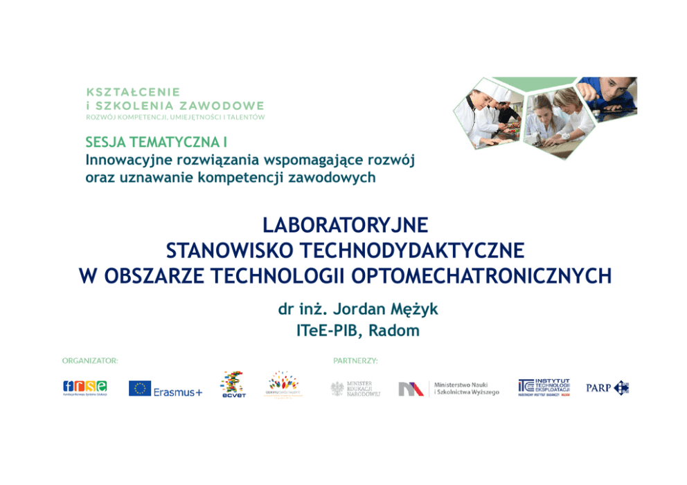 SESJA TEMATYCZNA I Innowacyjne rozwiązania wspomagające rozwój oraz uznawanie kompetencji zawodowych LABORATORYJNE STANOWISKO TECHNODYDAKTYCZNE W OBSZARZE TECHNOLOGII OPTOMECHATRONICZNYCH dr inż. Jordan Mężyk ITeE-PIB, Radom OPTOMECHATRONIKA Mechatronika – dziedzina inżynierii, która stanowi synergiczne połączenie inżynierii mechanicznej, elektroniki oraz informatyki. Optomechatronika – dziedzina inżynierii, która stanowi synergiczne połączenie inżynierii mechanicznej, informatyki elektroniki oraz optoelektroniki Optoelektronika - dział techniki wykorzystujący optykę i elektronikę do przetwarzania informacji PRZEMYSŁOWE SYSTEMY WIZYJNE ü ü ü ü ü ü ü Kontrola jakości Selekcja produktów Zliczanie produktów Sterowanie parametrami procesu Sterowanie układami manipulacji (w tym robotami) Układy pomiarowe Logistyka PRZYKŁADY ZASTOSOWAŃ STANOWISKO TECHNODYDAKTYCZNE Sterownik oświetlenia Ekran systemu wizyjnego System wizyjny Kamera Manipulator Oświetlacz Panel manipulatora Panel operatora Napęd liniowy SYSTEM WIZYJNY PRZYKŁAD WYKORZYSTANIA
