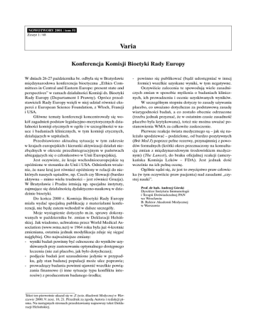 NOWOTWORY 2001 / tom 51 Zeszyt 1 / 68 Varia Konferencja Komisji Bioetyki Rady Europy W dniach 26-27 paêdziernika br. odby∏a si´ w Bratys∏awie mi´dzynarodowa konferencja bioetyczna „Ethics Committees in Central and Eastern Europe: present state and perspectives” w ramach dzia∏alnoÊci Komisji ds. Bioetyki Rady Europy (Departament I Prawny). Oprócz przedstawicieli Rady Europy wzi´li w niej udzia∏ równie˝ eksperci z European Science Foundation, z W∏och, Francji i USA. G∏ówne tematy konferencji koncentrowa∏y si´ wokó∏ zagadnieƒ podstaw legislacyjno-merytorycznych dzia∏alnoÊci komisji etycznych w ogóle i w szczególnoÊci w nauce i badaniach klinicznych, w tym komisji etycznych, dzia∏ajàcych w szpitalach. Przedstawiono aktualnà sytuacj´ w tym zakresie w krajach europejskich i kierunki aktywizacji dzia∏aƒ niezb´dnych w okresie przedintegracyjnym w paƒstwach ubiegajàcych si´ o cz∏onkostwo w Unii Europejskiej. Jest oczywiste, ˝e kraje wschodnioeuropejskie sà opóênione w stosunku do Unii i USA. Odnios∏em wra˝enie, ˝e nasz kraj jest równie˝ opóêniony w relacji do niektórych naszych sàsiadów, np. Czech czy S∏owacji (bardzo aktywna – mimo wielu trudnoÊci – jest równie˝ Gruzja). W Bratys∏awie i Pradze istniejà np. specjalne instytuty, zajmujàce si´ dzia∏alnoÊcià dydaktyczno-naukowà w dziedzinie bioetyki. Do koƒca 2000 r. Komisja Bioetyki Rady Europy mia∏a wydaç specjalnà publikacj´ z materia∏ami konferencji, nie b´d´ zatem wchodzi∏ w dalsze szczegó∏y. Moje wystàpienie dotyczy∏o m.in. sprawy dokonywanych w paêdzierniku br. zmian w Deklaracji Helsiƒskiej. Jak wiadomo, uchwalona przez World Medical Association (www.wma.net) w 1964 roku by∏a ju˝ 4-krotnie zmieniana, ostatnia jednak modyfikacja zdaje si´ si´gaç najg∏´biej. Oto najwa˝niejsze zmiany: - wyniki badaƒ powinny byç odnoszone do wyników uzyskiwanych przy zastosowaniu optymalnego dost´pnego leczenia (nie zaÊ placebo, jak by∏o dotychczas); - podj´cie badaƒ jest uzasadnione jedynie w przypadku, gdy stan badanej populacji mo˝e ulec poprawie; - prowadzàcy badania powinni ujawniç wszelkie powiàzania finansowe (i inne sytuacje typu konfliktu interesów) z producentem badanego Êrodka; Tekst ten pierwotnie ukaza∏ si´ w: Z ˝ycia Akademii Medycznej w Warszawie 2000; 9: zesz. 10, 21. Przedruk za zgodà Autora i redakcji pisma. Na nast´pnych stronach przedstawiamy najnowszy tekst Deklaracji Helsiƒskiej. - powinno si´ publikowaç (bàdê udost´pniaç w innej formie) wszelkie uzyskane wyniki, w tym negatywne. OczywiÊcie zalecenia te spowodujà wiele zasadniczych zmian w sposobie myÊlenia o badaniach klinicznych, ich prowadzeniu i ocenie uzyskiwanych wyników. W szczególnym stopniu dotyczy to zasady u˝ywania placebo, co uwa˝ano dotychczas za podstawowà zasad´ wiarygodnoÊci badaƒ, a co zosta∏o obecnie odrzucone (trzeba jednak przyznaç, ˝e w ostatnim czasie zasadnoÊç placebo by∏a krytykowana), tote˝ nie mo˝na uwa˝aç postanowienia WMA za ca∏kowite zaskoczenie. Pierwsze reakcje Êwiata medycznego sà – jak si´ nale˝a∏o spodziewaç – podzielone, od bardzo pozytywnych (Brit Med J) poprzez pe∏ne rezerwy, przynajmniej z powodów formalnych (krótki okres przeznaczony na konsultacj´ zmian z mi´dzynarodowym Êrodowiskiem medycznym) (The Lancet), do braku oficjalnej reakcji (amerykaƒska Komisja Leków – FDA). Jest jednak doÊç wczeÊnie na ich pe∏nà ocen´. Ogólnie sàdzi si´, ˝e jest to zwyci´stwo praw cz∏owieka (w tym oczywiÊcie praw pacjenta) nad zasadami „czystej nauki”. Prof. dr hab. Andrzej Górski Dyrektor Instytutu Immunologii i Terapii DoÊwiadczalnej PAN we Wroc∏awiu B. Rektor Akademii Medycznej w Warszawie