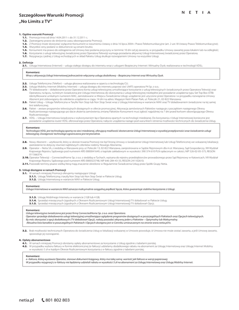 Szczegółowe Warunki Promocji „No Limits z TV” 1. Ogólne warunki Promocji 1.1. Promocja trwa od dnia 14.04.2011 r. do 31.12.2011 r.; 1.2. Zastrzegamy prawo do skrócenia czasu obowiązywania Promocji; 1.3. Z Promocji może skorzystać wyłącznie Konsument w rozumieniu Ustawy z dnia 16 lipca 2004 r. Prawo Telekomunikacyjne (art. 2 ust.18 Ustawy Prawo Telekomunikacyjne); 1.4. Wszystkie ceny podane w dokumencie są cenami brutto; 1.5. Konsument ma prawo do odstąpienia od Umowy bez podania przyczyny w terminie 10 dni od jej zawarcia, w przypadku Umowy zawartej poza lokalem lub na odległość; 1.6. Korzystanie z usługi telewizyjnej świadczonej przez Operatora Telewizji wymaga posiadania aktywnej Usługi Internetowej świadczonej przez Operatora; 1.7. Rezygnacja z jednej z Usług wchodzących w skład Pakietu Usług skutkuje rozwiązaniem Umowy na wszystkie Usługi. 2. Definicje 2.1. Usługa Internetowa (Internet) – usługa stałego dostępu do internetu wraz z usługami Bezpieczny Internet i Wirtualny Dysk; realizowana w technologii VDSL; Komentarz: Wraz z aktywacją Usługi Internetowej jednocześnie włączamy usługę dodatkową – Bezpieczny Internet oraz Wirtualny Dysk. 2.2. Usługa Telefoniczna (Telefon) – usługa głosowa realizowana w oparciu o technologię CU; 2.3. Usługa Mobilny Internet (Mobilny Internet) – usługa dostępu do internetu poprzez sieć UMTS operatora P4 Sp. z o.o.; 2.4. T V doładowanie – doładowanie przez Operatora konta usługi telewizyjnej umożliwiające korzystanie z usług telewizyjnych świadczonych przez Operatora Telewizji oraz Operatora, na łączu, na którym świadczona jest Usługa Internetowa; do skorzystania z usługi telewizyjnej niezbędne jest posiadanie urządzenia typu Set Top Box (STB) identyfikowane unikalnym numerem MAC, zainstalowane w Miejscu Świadczenia Usługi; urządzenie jest użyczone przez Operatora i w przypadku rozwiązania Umowy Abonent jest zobowiązany do odesłania urządzenia w ciągu 14 dni na adres: Magazyn Netii Platan Park, ul. Poleczki 21, 02-822 Warszawa; 2.5. Pakiet Usług – Usługa Telefoniczna w Taryfie Non Stop lub Non Stop Świat wraz z Usługą Internetową w wariancie MAX oraz TV doładowaniem świadczone na tej samej linii telefonicznej; 2.6. Pakiet – zestaw programów telewizyjnych dostępnych w ofercie promocyjnej. Aktywacja zamówionych Pakietów następuje z początkiem następnego Okresu Rozliczeniowego następującego po dacie złożenia zamówienia; zmianę Pakietów Konsument musi zgłosić najpóźniej na 7 dni przed końcem obowiązującego Okresu Rozliczeniowego; 2.7. VDSL – Usługa Internetowa świadczona z wykorzystaniem łącz Operatora opartych na technologii miedzianej. Do korzystania z Usługi Internetowej konieczne jest posiadanie urządzenia router VDSL oferowanego przez Operatora; nabycie urządzenia nastąpi pod warunkiem istnienia możliwości technicznych do świadczenia Usług. Komentarz: Technologia VDSL jest technologią opartą na sieci miedzianej, oferującą możliwość dostarczenia Usługi Internetowej o wysokiej przepływności oraz świadczenie usługi telewizyjnej. Dostępność technologii ograniczona jest terytorialnie. 2.8. N owy Abonent – użytkownik, który w okresie trwania Promocji nie był Stroną Umowy o świadczenie Usługi Internetowej lub Usługi Telefonicznej we wskazanej lokalizacji; zastrzeżenie to dotyczy również najbliższych członków rodziny Nowego Abonenta; 2.9. Operator – Netia SA, z siedzibą w Warszawie przy ul. Poleczki 13, 02-822 Warszawa, zarejestrowana w Sądzie Rejonowym dla m.st. Warszawy, Sąd Gospodarczy, XIII Wydział Krajowego Rejestru Sądowego pod numerem KRS 0000041649, o kapitale zakładowym w wysokości 390 374 610 PLN opłaconym w całości, NIP 526-02-05-575, REGON 011566374; 2.10.Operator Telewizji – ConnectedHome Sp. z o.o. z siedzibą w Tychach, wpisana do rejestru przedsiębiorców prowadzonego przez Sąd Rejonowy w Katowicach, VIII Wydział Krajowego Rejestru Sądowego pod numerem KRS 0000323748, NIP 646-284-43-33, REGON 241102610; 2.11.Pozostałe terminy pisane wielką literą mają znaczenie określone w Regulaminie Świadczenia Usług przez Spółki Grupy Netia. 3. Usługi dostępne w ramach Promocji 3.1. W ramach niniejszej Promocji oferujemy następujące Usługi: 3.1.1. Usługę Telefoniczną z taryfą Non Stop lub Non Stop Świat w Pakiecie Usług; 3.1.2. Usługę Internetową w wariancie MAX w Pakiecie Usług; Komentarz: Usługa Internetowa w wariancie MAX oznacza maksymalnie osiągalną prędkość łącza, która gwarantuje stabilne korzystanie z Usługi. 3.1.3. Usługę Mobilnego Internetu w wariancie 2 GB lub 4 GB; 3.1.4. Sprzedaż miesięcznych (zgodnych z Okresem Rozliczeniowym Usługi Internetowej) TV doładowań w Pakiecie Usług; 3.1.5. Sprzedaż miesięcznych (zgodnych z Okresem Rozliczeniowym Usługi Internetowej) TV doładowań Opcji; Komentarz: Usługa telewizyjna świadczona jest przez firmę ConnectedHome Sp. z o.o. oraz Operatora. Operator sprzedaje doładowania usługi telewizyjnej umożliwiające oglądanie programów dostępnych w poszczególnych Pakietach oraz Opcjach telewizyjnych. By móc skorzystać z opcji dodatkowych (TV doładowań Opcji), należy posiadać aktywny jeden z Pakietów – Optymalny lub Maksymalny. Aktualna lista kanałów w poszczególnych Pakietach i Opcjach dostępna jest w Cenniku umieszczonym na stronie www.netia.pl/tv. 3.2. B rak możliwości technicznych Operatora do świadczenia Usług w lokalizacji wskazanej w Umowie powoduje, iż Umowa nie może zostać zawarta, a jeśli Umowę zawarto, spowoduje jej rozwiązanie. 4. Opłaty abonamentowe 4.1. W ramach niniejszej Promocji obniżamy opłaty abonamentowe za korzystanie z Usług zgodnie z tabelami poniżej. 4.2. W przypadku wyboru faktury w formie elektronicznej (e-faktury) udzielamy dodatkowego rabatu na abonament za Usługę Internetową oraz Usługę Internet Mobilny w wysokości 5 zł w każdy