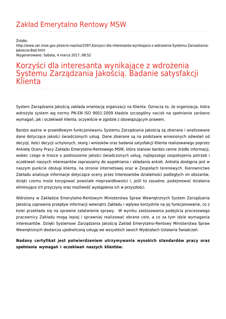 Zakład Emerytalno Rentowy MSW Źródło: http://www.zer.msw.gov.pl/zer/o-nas/iso/3397,Korzysci-dla-interesanta-wynikajace-z-wdrozenia-Systemu-ZarzadzaniaJakoscia-Bad.html Wygenerowano: Sobota, 4 marca 2017, 08:52 Korzyści dla interesanta wynikające z wdrożenia Systemu Zarządzania Jakością. Badanie satysfakcji Klienta System Zarządzania Jakością zakłada orientację organizacji na Klienta. Oznacza to, że organizacja, która wdrożyła system wg normy PN-EN ISO 9001:2009 kładzie szczególny nacisk na spełnienie zarówno wymagań, jak i oczekiwań klienta, oczywiście w zgodzie z obowiązującym prawem. Bardzo ważne w prawidłowym funkcjonowaniu Systemu Zarządzania Jakością są zbierane i analizowane dane dotyczące jakości świadczonych usług. Dane zbierane są na podstawie wniesionych odwołań od decyzji, ilości decyzji uchylonych, skarg i wniosków oraz badania satysfakcji Klienta realizowanego poprzez Ankietę Oceny Pracy Zakładu Emerytalno-Rentowego MSW, która stanowi bardzo cenne źródło informacji, wobec czego w trosce o podnoszenie jakości świadczonych usług, najlepszego zaspokojenia potrzeb i oczekiwań naszych interesantów zapraszamy do wypełniania i składania ankiet. Ankieta dostępna jest w naszym punkcie obsługi klienta, na stronie internetowej oraz w Zespołach terenowych. Kierownictwo Zakładu analizuje informacje dotyczące oceny przez Interesantów działalności podległych im obszarów, dzięki czemu może korygować powstałe nieprawidłowości i, jeśli to zasadne, podejmować działania eliminujące ich przyczyny oraz możliwość wystąpienia ich w przyszłości. Wdrożony w Zakładzie Emerytalno-Rentowym Ministerstwa Spraw Wewnętrznych System Zarządzania Jakością usprawnia przepływ informacji wewnątrz Zakładu i wpływa korzystnie na jej funkcjonowanie, co z kolei przekłada się na sprawne załatwienie sprawy. W wyniku zastosowania podejścia procesowego pracownicy Zakładu mogą lepiej i sprawniej realizować obrane cele, a co za tym idzie wymagania interesantów. Dzięki Systemowi Zarządzania Jakością Zakład Emerytalno-Rentowy Ministerstwa Spraw Wewnętrznych dostarcza ujednoliconą usługę we wszystkich swoich Wydziałach Ustalania Świadczeń. Nadany certyfikat jest potwierdzeniem utrzymywania wysokich standardów pracy oraz spełniania wymagań i oczekiwań naszych klientów.