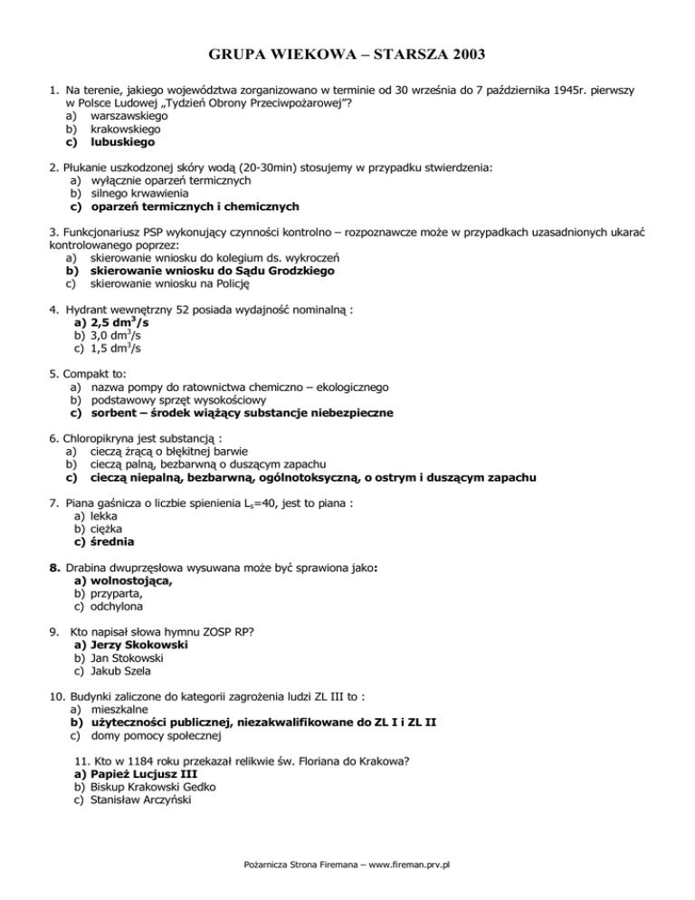 GRUPA WIEKOWA – STARSZA 2003 1. Na terenie, jakiego województwa zorganizowano w terminie od 30 wrze nia do 7 pa dziernika 1945r. pierwszy w Polsce Ludowej „Tydzie Obrony Przeciwpo arowej”? a) warszawskiego b) krakowskiego c) lubuskiego 2. P ukanie uszkodzonej skóry wod (20-30min) stosujemy w przypadku stwierdzenia: a) wy cznie oparze termicznych b) silnego krwawienia c) oparze termicznych i chemicznych 3. Funkcjonariusz PSP wykonuj cy czynno ci kontrolno – rozpoznawcze mo e w przypadkach uzasadnionych ukara kontrolowanego poprzez: a) skierowanie wniosku do kolegium ds. wykrocze b) skierowanie wniosku do S du Grodzkiego c) skierowanie wniosku na Policj 4. Hydrant wewn trzny 52 posiada wydajno a) 2,5 dm3/s b) 3,0 dm3/s c) 1,5 dm3/s nominaln : 5. Compakt to: a) nazwa pompy do ratownictwa chemiczno – ekologicznego b) podstawowy sprz t wysoko ciowy c) sorbent – rodek wi cy substancje niebezpieczne 6. Chloropikryna jest substancj : a) ciecz o b kitnej barwie b) ciecz paln , bezbarwn o dusz cym zapachu c) ciecz niepaln , bezbarwn , ogólnotoksyczn , o ostrym i dusz cym zapachu 7. Piana ga nicza o liczbie spienienia Ls=40, jest to piana : a) lekka b) ci ka c) rednia 8. Drabina dwuprz owa wysuwana mo e by sprawiona jako: a) wolnostoj ca, b) przyparta, c) odchylona 9. Kto napisa s owa hymnu ZOSP RP? a) Jerzy Skokowski b) Jan Stokowski c) Jakub Szela 10. Budynki zaliczone do kategorii zagro enia ludzi ZL III to : a) mieszkalne b) yteczno ci publicznej, niezakwalifikowane do ZL I i ZL II c) domy pomocy spo ecznej 11. Kto w 1184 roku przekaza relikwie w. Floriana do Krakowa? a) Papie Lucjusz III b) Biskup Krakowski Gedko c) Stanis aw Arczy ski Po arnicza Strona Firemana – www.fireman.prv.pl 12. Obowi zuj ce rozporz dzenie w sprawie warunków technicznych jakim powinny odpowiada budynki i ich usytuowanie wyda : a) Minister Gospodarki Przestrzennej i Budownictwa b) Minister Spraw Wewn trznych i Administracji c) Minister Infrastruktury 13. Sekcja wysokiego ci nienia w autopompie samochodu ga niczego podaje wod pod ci nieniem : a) 100 bar b) 140 bar c) 40 bar 14. Geometryczna wysoko podnoszenia to: a) suma geometrycznej wysoko ci ssania i t oczenia, wyra ona w metrach b) suma geometrycznej wysoko ci ssania i t oczenia wyra onej w litrach c) suma geometrycznej wysoko ci ssania wyra ona w metrach 15. Gdzie nale y stosowa o wietlenie ewakuacyjne ? a) na wszystkich drogach ewakuacyjnych b) na drogach ewakuacyjnych niedo wietlonych wiat em dziennym c) na drogach ewakuacyjnych w obiektach ZL III 16. Starosta kieruje dzia aniami w celu zapobie enia skutkom kl ski ywio owej przy pomocy : a) zespo u do spraw ochrony przeciwpo arowej i ratownictwa b) powiatowego zespo u reagowania kryzysowego c) powiatowego zespo u do spraw bezpiecze stwa 17. Toporek stra acki ma mas : a) 1,25 kg b) 1,5 kg c) 1,7 kg 18. Elementy nierozprzestrzeniaj ce ognia to elementy wykonane z materia ów: a) trudno zapalnych b) niepalnych i niezapalnych c) atwo zapalnych 19. Jaki wzór chemiczny ma fenol : a) C6 H5 OH b) CH2 O c) CH3 CL 20. Odleg mi dzy cianami zewn trznymi budynków lub cz ciami tych cian mo e by zmniejszona, o 50% je eli we wszystkich strefach po arowych budynków, przylegaj cych odpowiednio do tych cian lub ich cz ci zastosowano: a) urz dzenia oddymiaj ce b) instalacj sygnalizacji alarmu po aru c) sta e urz dzenia ga nicze wodne 21. II stopie oparzenia to : a) oparzenie, którego objawem jest zaczerwienienie skóry (rumie ), obrz k i uczucie pieczenia b) oparzenie, którego objawem jest pojawienie si na zaczerwienionej i obrz kni tej skórze cherzy z tawym p ynem surowiczym, któremu towarzyszy temu ostry ból c) oparzenie, które cechuje si martwic ca ej grubo ci skóry, a tak e uszkodzeniem tkanek po onych biej (mi nie, ci gna), skrajn postaci oparzenia jest zw glenie tkanek 22. Instalacja wentylacji oddymiaj cej powinna zapewnia : a) usuwanie dymu z intensywno ci co najmniej 10 wymian na godzin b) usuwanie dymu z intensywno ci co najmniej 5 wymian na godzin c) nie ma takiego wymogu Po arnicza Strona Firemana – www.fireman.prv.pl 23. Zasysacz liniowy pozwala na uzyskanie wodnego roztworu rodka pianotwórczego o warto ci : a) 3 i 6 % b) 6 i 12 % c) 13 i 16 % 24. ówny s d Honorowy OSP RP sk ada si z : a) od 1 do 6 cz onków b) od 7 – 11 cz onków c) od 12 do 16 cz onków 25. Zespó podstawowy w ratownictwie medycznym stanowi : a) Ratownik medyczny (paramedyk) i dwóch ratowników przedmedycznych (techników medycznych) b) Lekarz, ratownik medyczny i dwóch ratowników przedmedycznych c) Dwóch ratowników przedmedycznych 26. Drogi po arowe o odpowiednio utwardzonej i wytrzyma ej nawierzchni powinny by obiektów niskich : a) ZL III i ZL V b) nie wymaga si doprowadzenia dróg po arowych do obiektów niskich c) ZL I i ZL II doprowadzone do 27. Nudno ci i wymioty u poszkodowanego to: a) normalna reakcja na wypadek b) reakcja organizmu wyst puj ca zawsze przy urazie brzucha, c) niebezpieczny objaw neurologiczny 28. Ile wynosi czas ochronnego dzia ania aparatu powietrznego AP 3 przy zu yciu 30 l/min : a) 53 min b) 38 min c) 60 min 29. Wymie trzy typy dowodzenia dzia aniami ratowniczymi : a) operacyjny, taktyczny, wspó dzia aj cy b) strategiczny, taktyczny, interwencyjny, c) strategiczny, operacyjny, taktyczno – interwencyjny 30. Przy zwichni ciach w stawie barkowym wykonujemy nast puj ce czynno ci ratownicze: a) nastawiamy na miejscu zdarzenia, b) unieruchamiamy w pozycji zastanej c) unieruchamiamy w pozycji fizjologicznej 31. Przewody elektryczne mo na ci no ycami z izolowanymi r koje ciami lub u suchym, drewnianym trzonkiem gdy napi cie w przewodzie nie przekracza : a) 220 V b) 300 V c) 500 V do tego siekiery z 32. Zespó startuj cy w konkurencji – wiczenia bojowe podczas Mistrzostw Polski w Sporcie Po arniczym liczy : a) 4 zawodników b) 7 zawodników c) 8 zawodników 33. Energia cieplna, wyra ona w MJ, która mo e powsta przy spaleniu materia ów palnych znajduj cych si w pomieszczeniu, strefie po ar