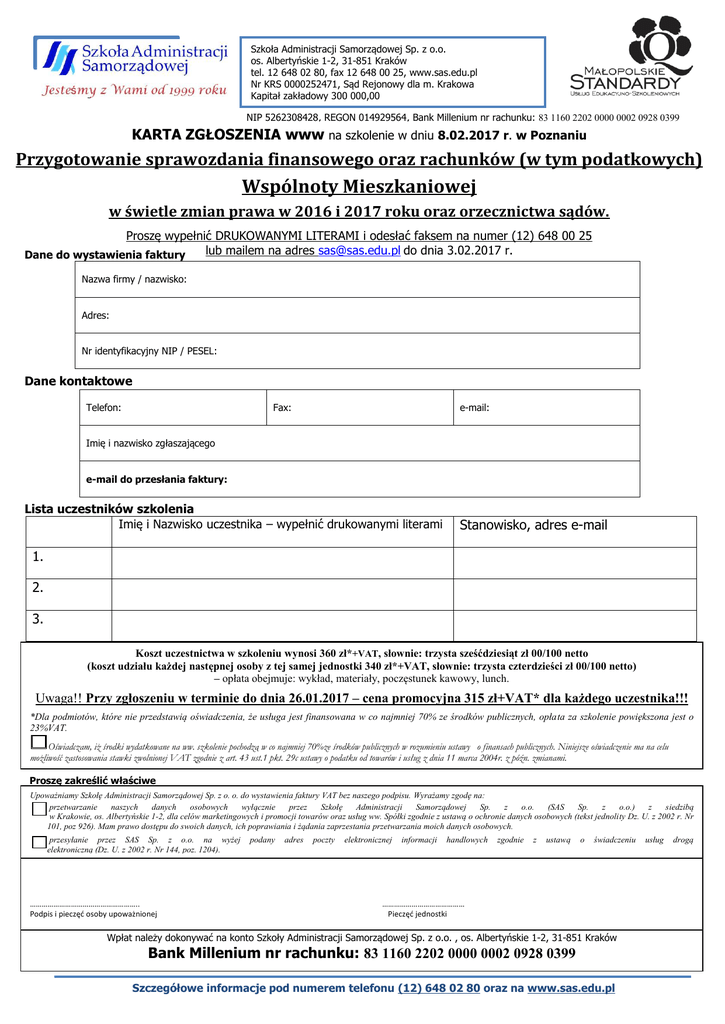 Szkoła Administracji Samorządowej Sp. z o.o. os. Albertyńskie 1-2, 31-851 Kraków tel. 12 648 02 80, fax 12 648 00 25, www.sas.edu.pl Nr KRS 0000252471, Sąd Rejonowy dla m. Krakowa Kapitał zakładowy 300 000,00 b NIP 5262308428, REGON 014929564, Bank Millenium nr rachunku: 83 1160 2202 0000 0002 0928 0399 KARTA ZGŁOSZENIA www na szkolenie w dniu 8.02.2017 r. w Poznaniu Przygotowanie sprawozdania finansowego oraz rachunków (w tym podatkowych) Wspólnoty Mieszkaniowej w świetle zmian prawa w 2016 i 2017 roku oraz orzecznictwa sądów. Proszę wypełnić DRUKOWANYMI LITERAMI i odesłać faksem na numer (12) 648 00 25 lub mailem na adres [email protected] do dnia 3.02.2017 r. Dane do wystawienia faktury Nazwa firmy / nazwisko: Adres: Nr identyfikacyjny NIP / PESEL: Dane kontaktowe Telefon: Fax: e-mail: Imię i nazwisko zgłaszającego e-mail do przesłania faktury: Lista uczestników szkolenia Imię i Nazwisko uczestnika – wypełnić drukowanymi literami Stanowisko, adres e-mail 1. 2. 3. Koszt uczestnictwa w szkoleniu wynosi 360 zł*+VAT, słownie: trzysta sześćdziesiąt zł 00/100 netto (koszt udziału każdej następnej osoby z tej samej jednostki 340 zł*+VAT, słownie: trzysta czterdzieści zł 00/100 netto) – opłata obejmuje: wykład, materiały, poczęstunek kawowy, lunch. Uwaga!! Przy zgłoszeniu w terminie do dnia 26.01.2017 – cena promocyjna 315 zł+VAT* dla każdego uczestnika!!! *Dla podmiotów, które nie przedstawią oświadczenia, że usługa jest finansowana w co najmniej 70% ze środków publicznych, opłata za szkolenie powiększona jest o 23%VAT. Oświadczam, iż środki wydatkowane na ww. szkolenie pochodzą w co najmniej 70%ze środków publicznych w rozumieniu ustawy o finansach publicznych. Niniejsze oświadczenie ma na celu możliwość zastosowania stawki zwolnionej VAT zgodnie z art. 43 ust.1 pkt. 29c ustawy o podatku od towarów i usług z dnia 11 marca 2004r. z późn. zmianami. Proszę zakreślić właściwe Upoważniamy Szkołę Administracji Samorządowej Sp. z o. o. do wystawienia faktury VAT bez naszego podpisu. Wyrażamy zgodę na: przetwarzanie naszych danych osobowych wyłącznie przez Szkołę Administracji Samorządowej Sp. z o.o. (SAS Sp. z o.o.) z siedzibą w Krakowie, os. Albertyńskie 1-2, dla celów marketingowych i promocji towarów oraz usług ww. Spółki zgodnie z ustawą o ochronie danych osobowych (tekst jednolity Dz. U. z 2002 r. Nr 101, poz 926). Mam prawo dostępu do swoich danych, ich poprawiania i żądania zaprzestania przetwarzania moich danych osobowych. przesyłanie przez SAS Sp. z o.o. na wyżej elektroniczną (Dz. U. z 2002 r. Nr 144, poz. 1204). ……………………………………………….. Podpis i pieczęć osoby upoważnionej podany adres poczty elektronicznej informacji handlowych zgodnie z ustawą o świadczeniu …………………………………… Pieczęć jednostki Wpłat należy dokonywać na konto Szkoły Administracji Samorządowej Sp. z o.o. , os. Albertyńskie 1-2, 31-851 Kraków Bank Millenium nr rachunku: 83 1160 2202 0000 0002 0928 0399 Szczegółowe informacje pod numerem telefonu (12) 648 02 80 oraz na www.sas.edu.pl usług drogą ZAPRASZAMY NA SZKOLENIE: Przygotowanie sprawozdania finansowego oraz rachunków (w tym podatkowych) Wspólnoty Mieszkaniowej w świetle zmian prawa w 2016 i 2017 roku oraz orzecznictwa sądów. Jak prowadzić ewidencję rachunkową i podatkową po 1 stycznia 2017 r.? Jak sporządzić sprawozdanie finansowe? Zmiany w podatkach w 2016 i 2017 roku – co należy wiedzieć? Jak wypełnić zeznanie podatkowe CIT-8? Jednolity Plik Kontrolny – jakie są zasady działania nowego narzędzia kontroli? Jak prawidłowo złożyć organom podatkowym ewidencję VAT? Jak kontrolować poprawność JPK? Jakie nowe obowiązki w zakresie informacji podatkowej nakłada na Wspólnotę Mieszkaniową Ordynacja podatkowa? Jakie jest aktualne stanowisko Ministerstwa Finansów w tej sprawie? Skutki zmiany art. 45a ustawy Prawo energetyczne dla zasad rozliczania mediów z właścicielami lokali – co zmieniło się po 1.10.2016 r.? Rozliczenie nadwyżki bilansowej netto lub straty, zwolnienia od podatku dochodowego – jak ukształtowane jest aktualne orzecznictwo sądów? Uwaga! Dla zgłaszających się do 26.01.2017 r. - cena promocyjna - 315 zł+VAT Celem szkolenia jest przekazanie uczestnikom umiejętności w zakresie prawidłowego stosowania nowych przepisów dotyczących rozliczeń rocznych we Wspólnotach Mieszkaniowych, przybliżenie obowiązków związanych ze stosowaniem nowych narzędzi oraz wyeliminowanie ryzyka popełnienia błędów przy ich stosowaniu. SZKOLENIE ADRESOWANE JEST DO: zarządców nieruchomości, głównych księgowych, pracowników odpowiedzialnych za finanse i rozliczenia podatkowe Wspólnot Mieszkaniowych, pełnomocników gmin we Wspólnotach Mieszkaniowych, pracowników zakładów gospodarki komunalnej. PROWADZĄCY: specjalista z zakresu problematyki gospodarowania i zarządzania nieruchomościami, w tym obsługi technicznej obiektów budowlanych. Prowadzi wykłady, seminaria i szkolenia na temat rynku nieruchomości. Autorka wielu publikacji poświęconych wieloaspektowym zagadnieniom zarządu nieruchomościami – m.in. „Gospodarka, rachunkowość, podatki oraz rozrachunki wspólnoty mieszkaniowej", „Przegląd, konserwacja i roboty budowlane w zarządzanym budynku", „Obowiązki właścicieli obiektów budowlanych oraz inwestorów" POZNAŃ – 8.02.2017 Hotel “IBIS Poznań Centrum”, ul. Kazimierza Wielkiego 23, godz. 10:00-15:00 Nieobecność zgłoszonego uczestnika nie zwalnia od opłaty za szkolenie! Zasady udziału w szkoleniu określa Regulamin dostępny na stronie www.sas.edu.pl PROGRAM SZKOLENIA: 1. Ewidencja rachunkowa i podatkowa oraz zmiany w sposobie jej prowadzenia. 2. Co to jest „Jednolity plik kontrolny”? Zakres danych przekazywanych na żądanie organu podatkowego. JPK w wyjaśnieniach Ministerstwa Finansów – z uwzgl